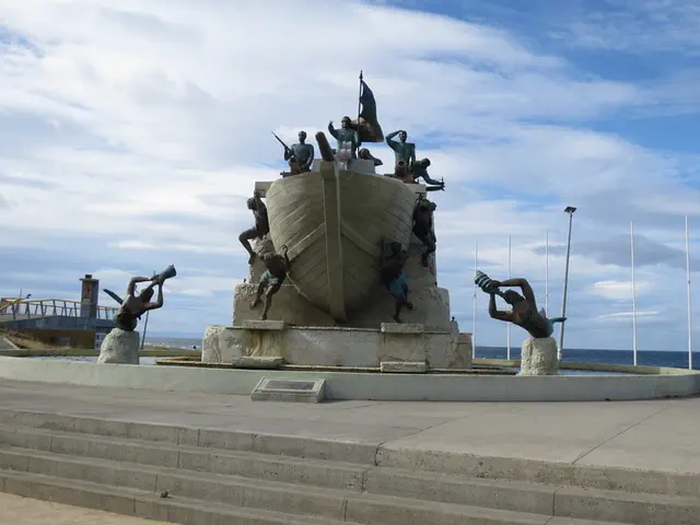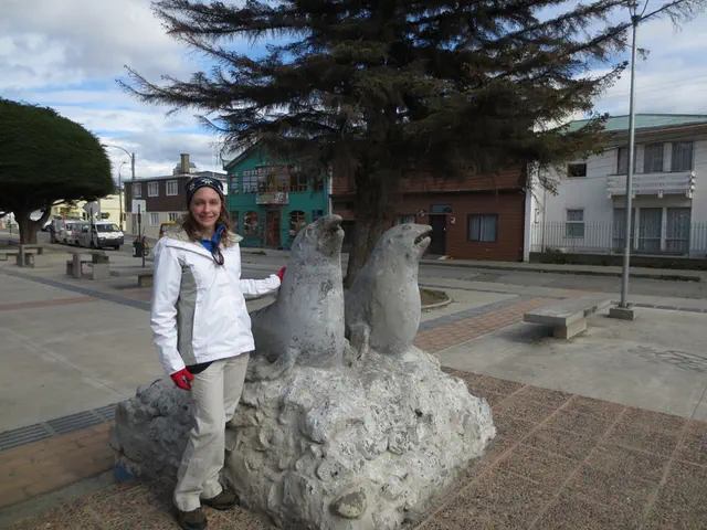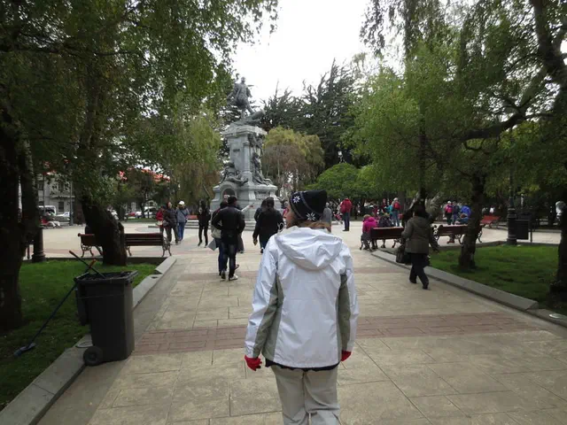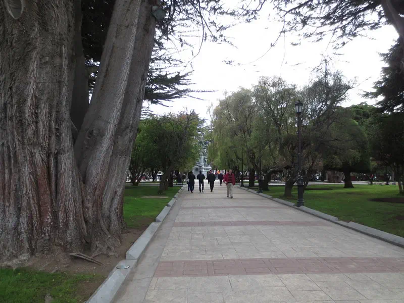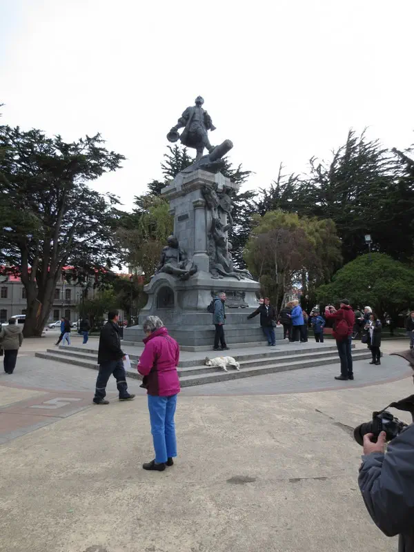 Walking to the hill. Note this statue; one foot is worn. If you rub it, it means you will return to Punta Arenas. I had read about this but did not think about at the time or know it was the statue; until later, I noticed that we had a picture of someone doing it. And a dog here too, even where it gets colder.