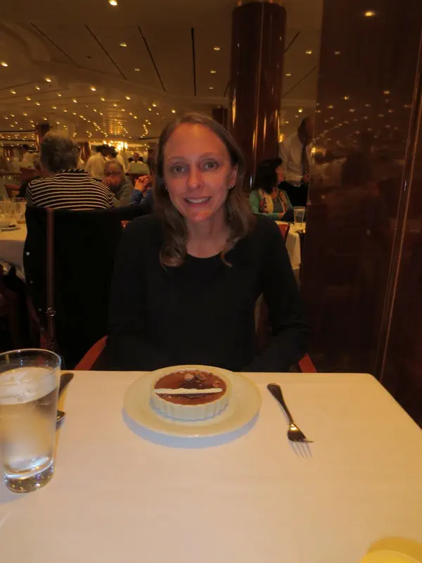 Then we went back to the restaurant for dessert only. We made it there right before the crowd from the show hit. Husband had the Irish creme pie, and I had the nutella creme brulee. Both were really good. The creme brulee would have been better with a more caramelized head. The chocolate in the Irish cream was really good. The best creme brulee that I have had, also on a ship, had dark chocolate at the bottom -- yum.