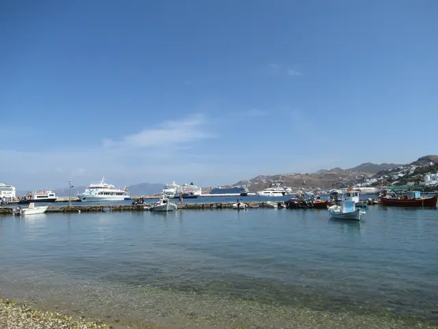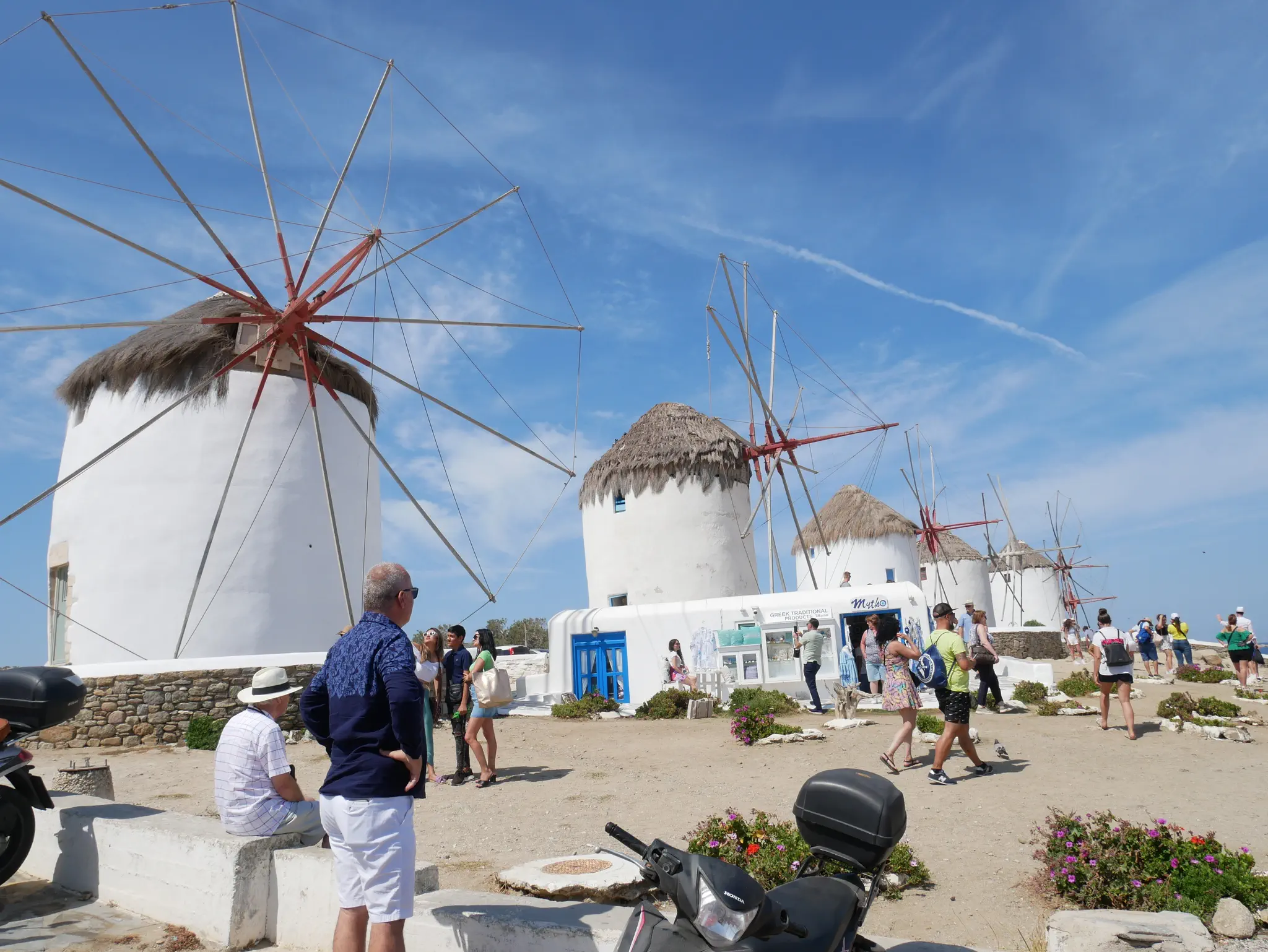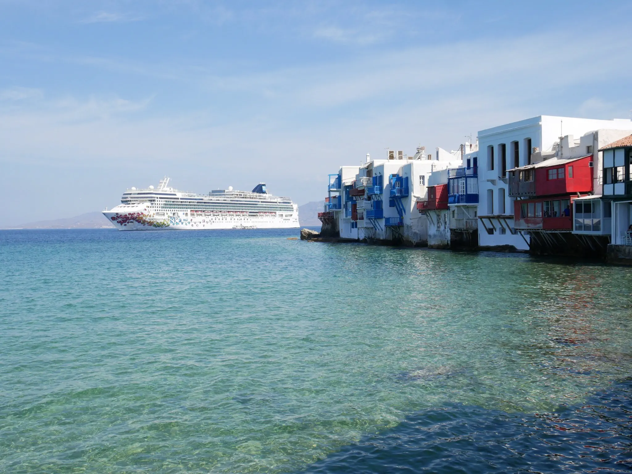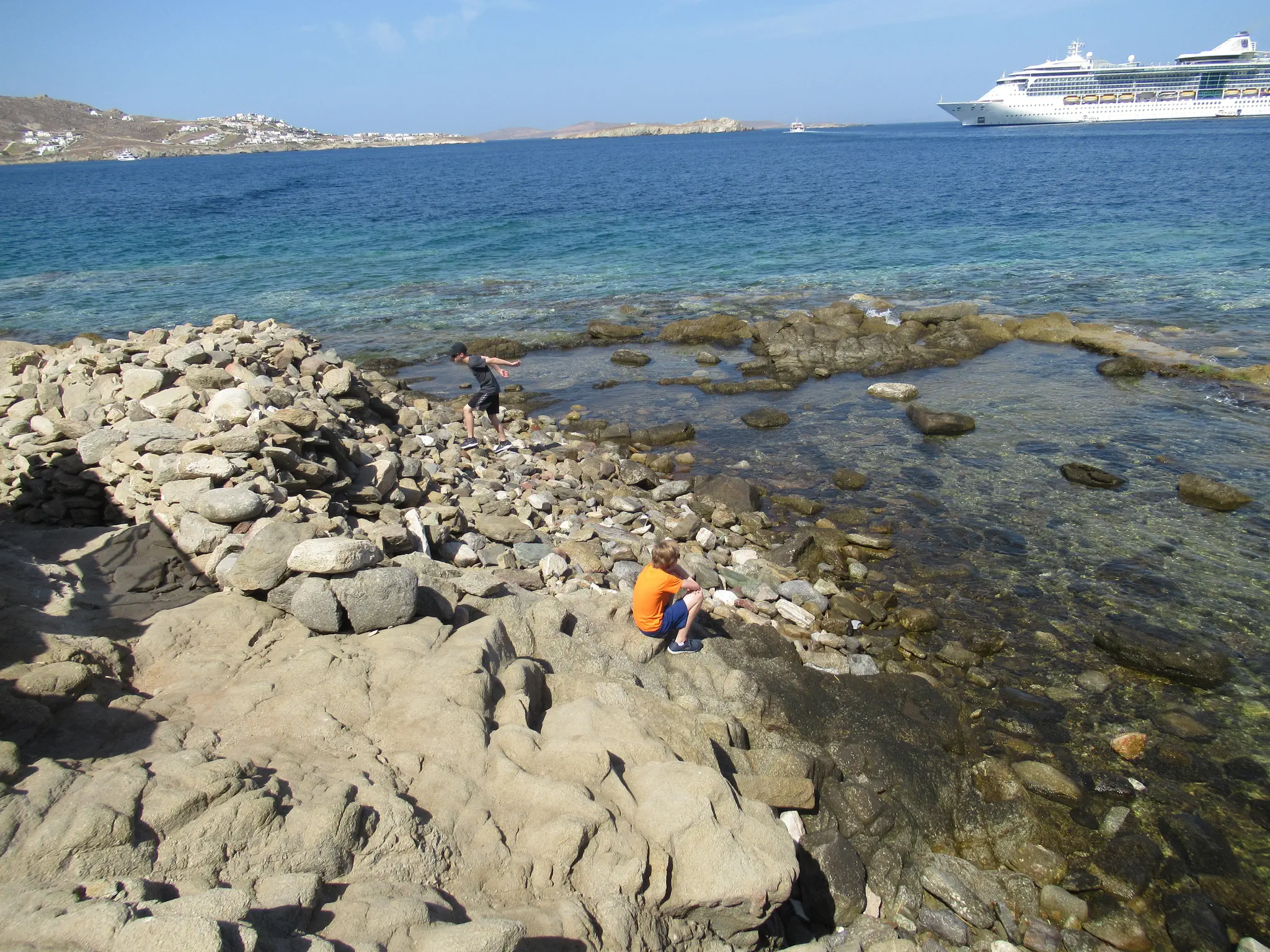 Mykonos, 8am to 7pm, was our first tender port where all the ships tendered/no docks. A view from the tender of the ship from below.