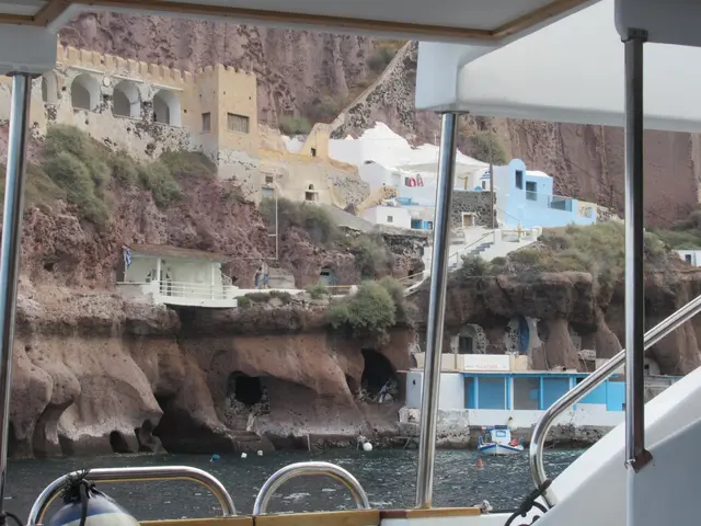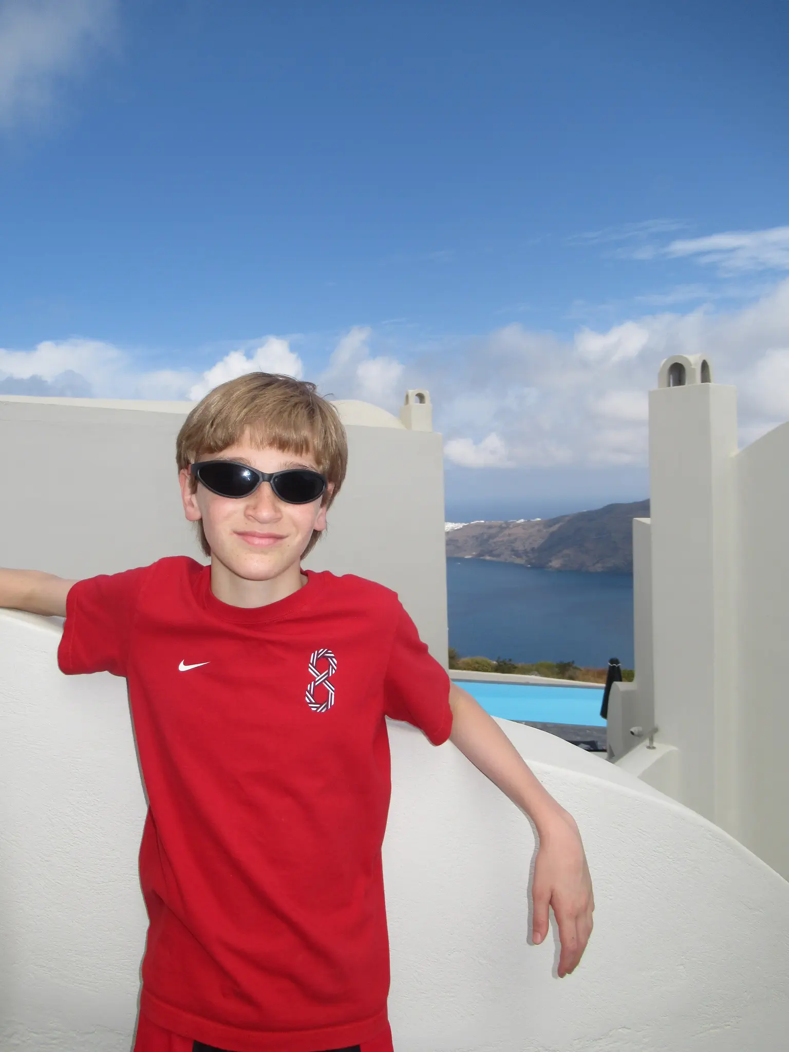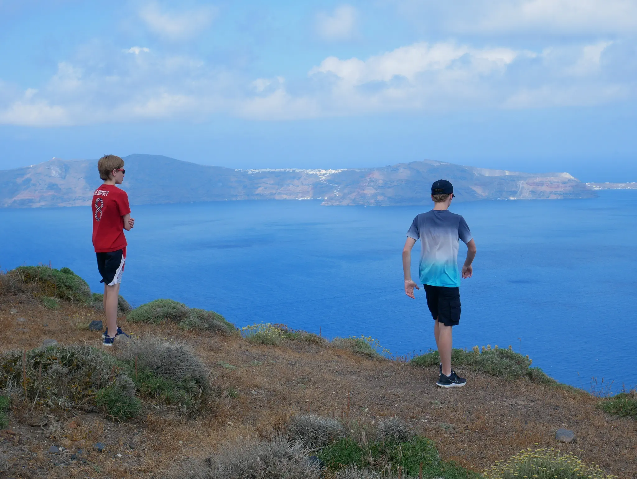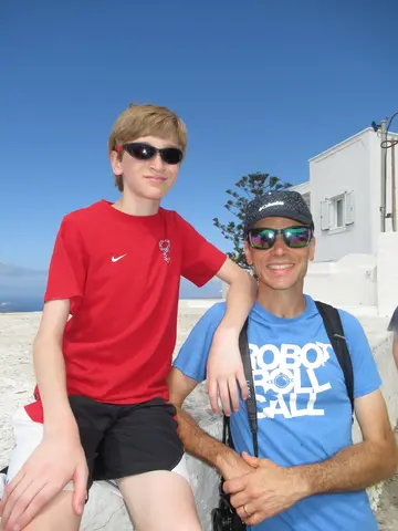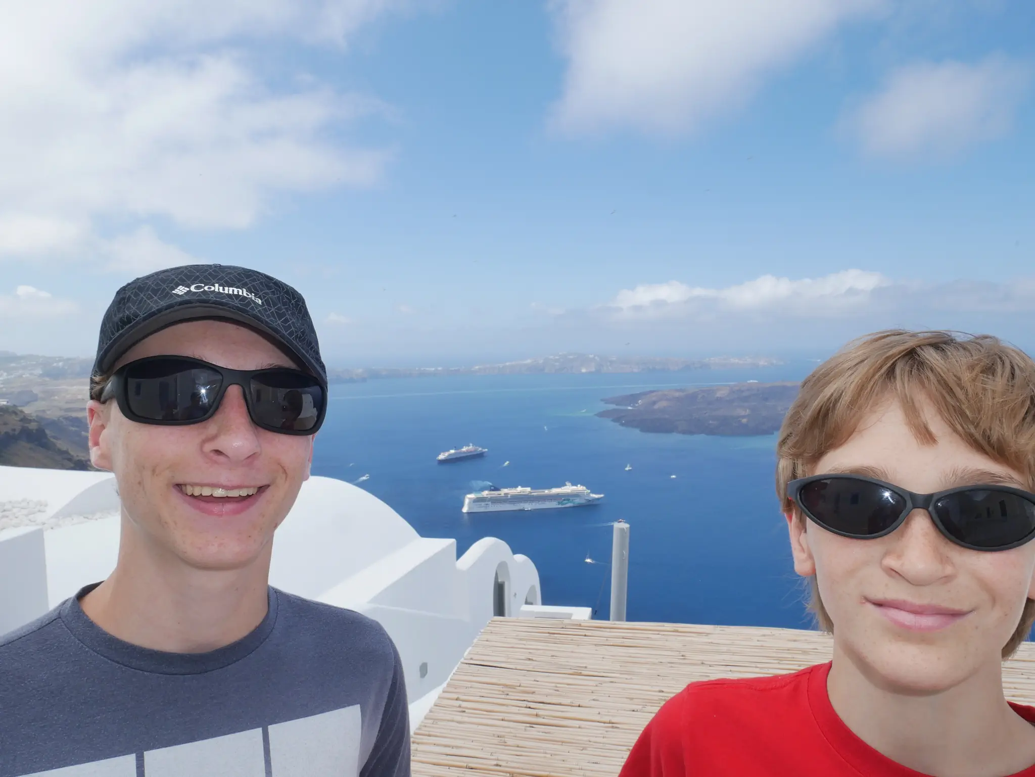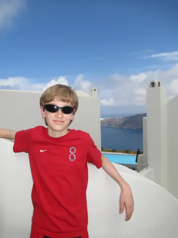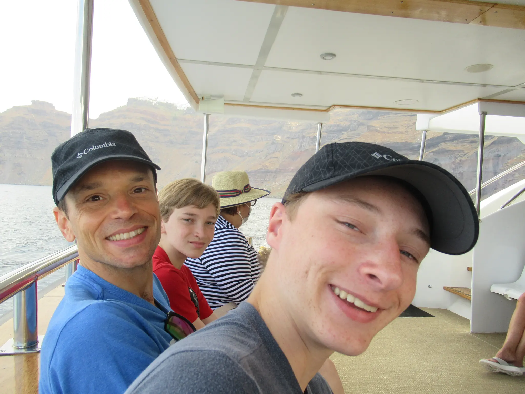 Santorini, 8 am - 9:30 pm, so a lot time in port. This was also a tender port, and doh, we were about to head down right as they announced open tender. Bad timing; luckily, it was not too busy. On the tender boat -- Joel, Travis, and Owen.