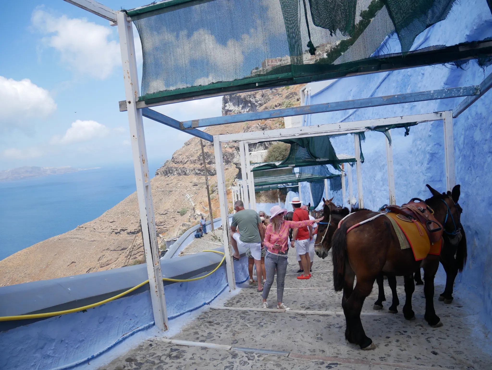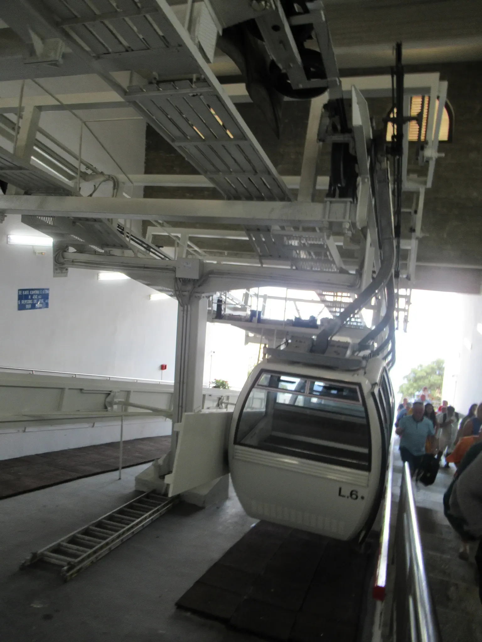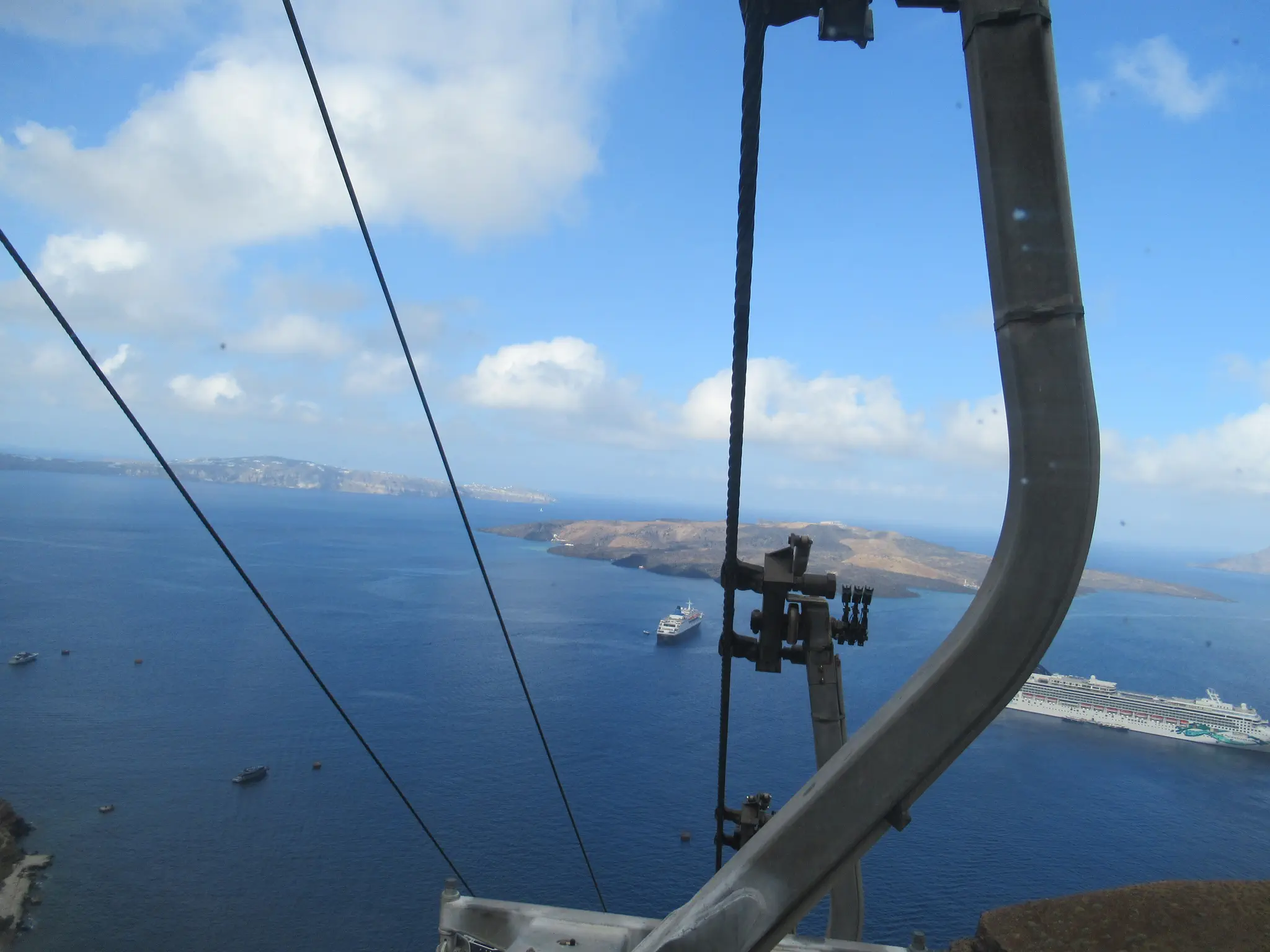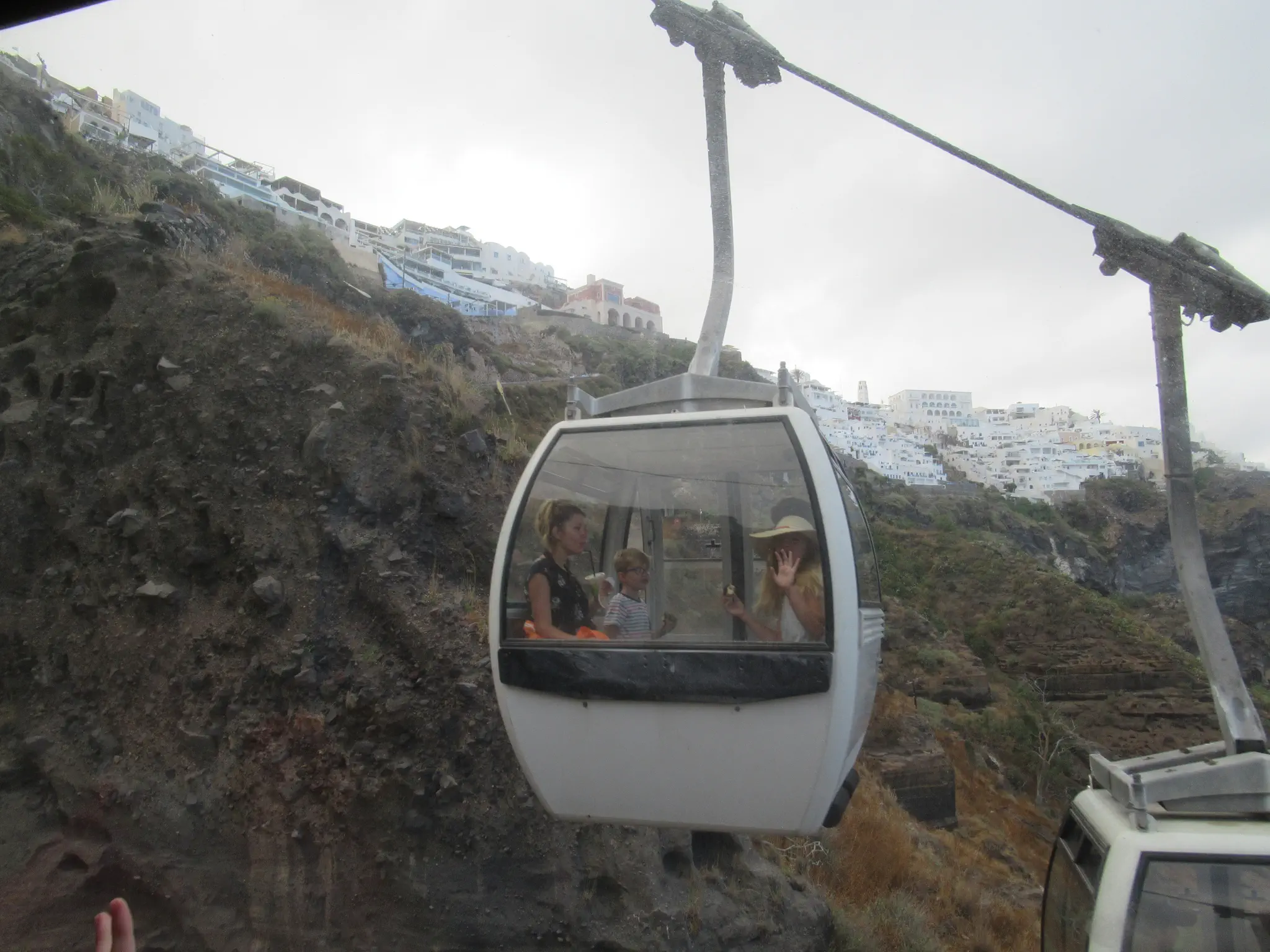 We took the cable car up instead of walking or the mules. The cable car was 6 Euro for adults and 3 Euro for kids for a one-way ticket; they accepted credit cards. The cruise ship recommended not taking the mules saying that they were not well cared for. We saw them when walking down the switchbacks later but could not tell how well cared for they were or not. I'm not a fan of mules/horses on trails in general -- smelly and leave messes. Cabin car going the other way; they waved for the picture. View of the ship from the cable car.