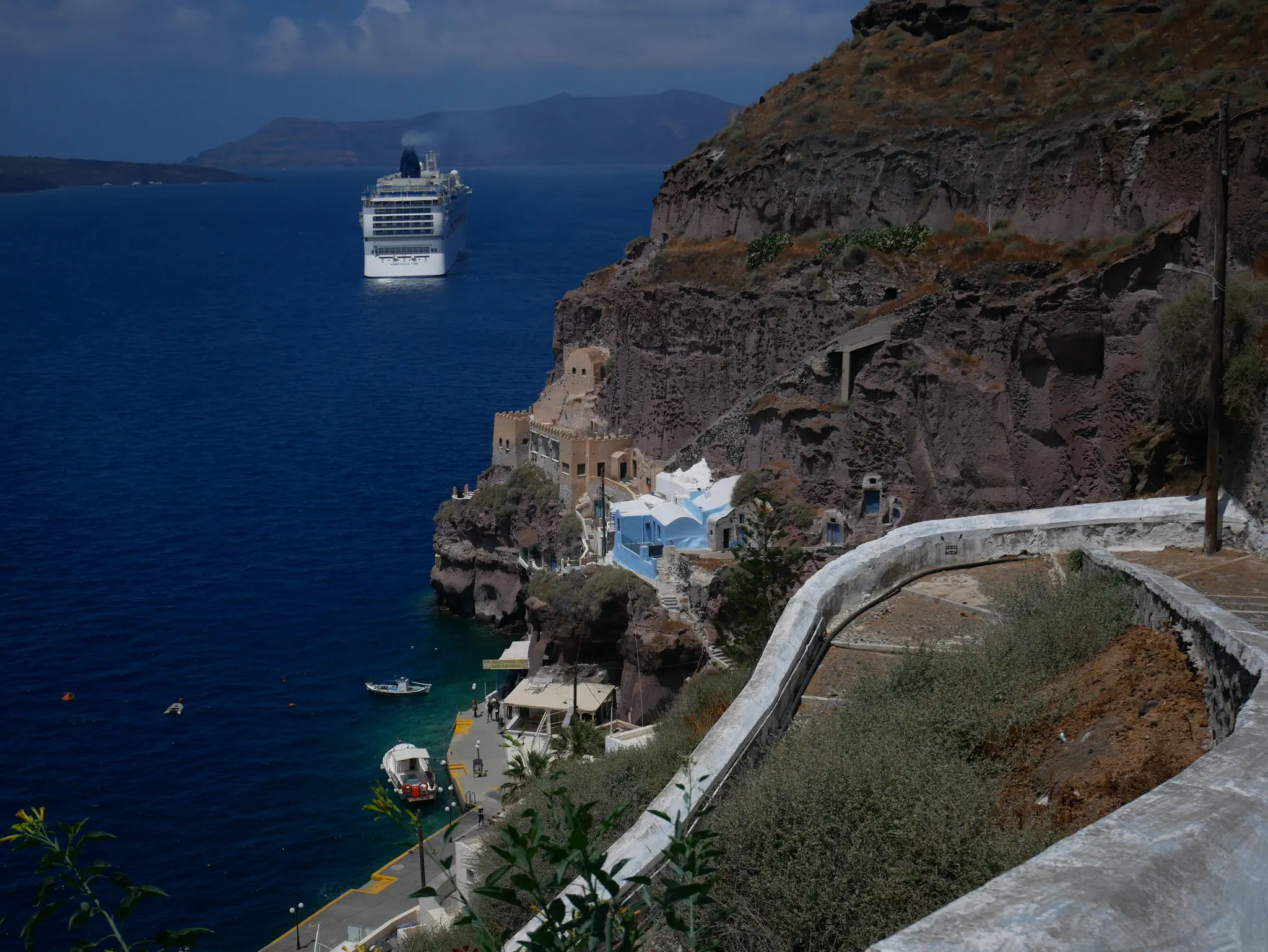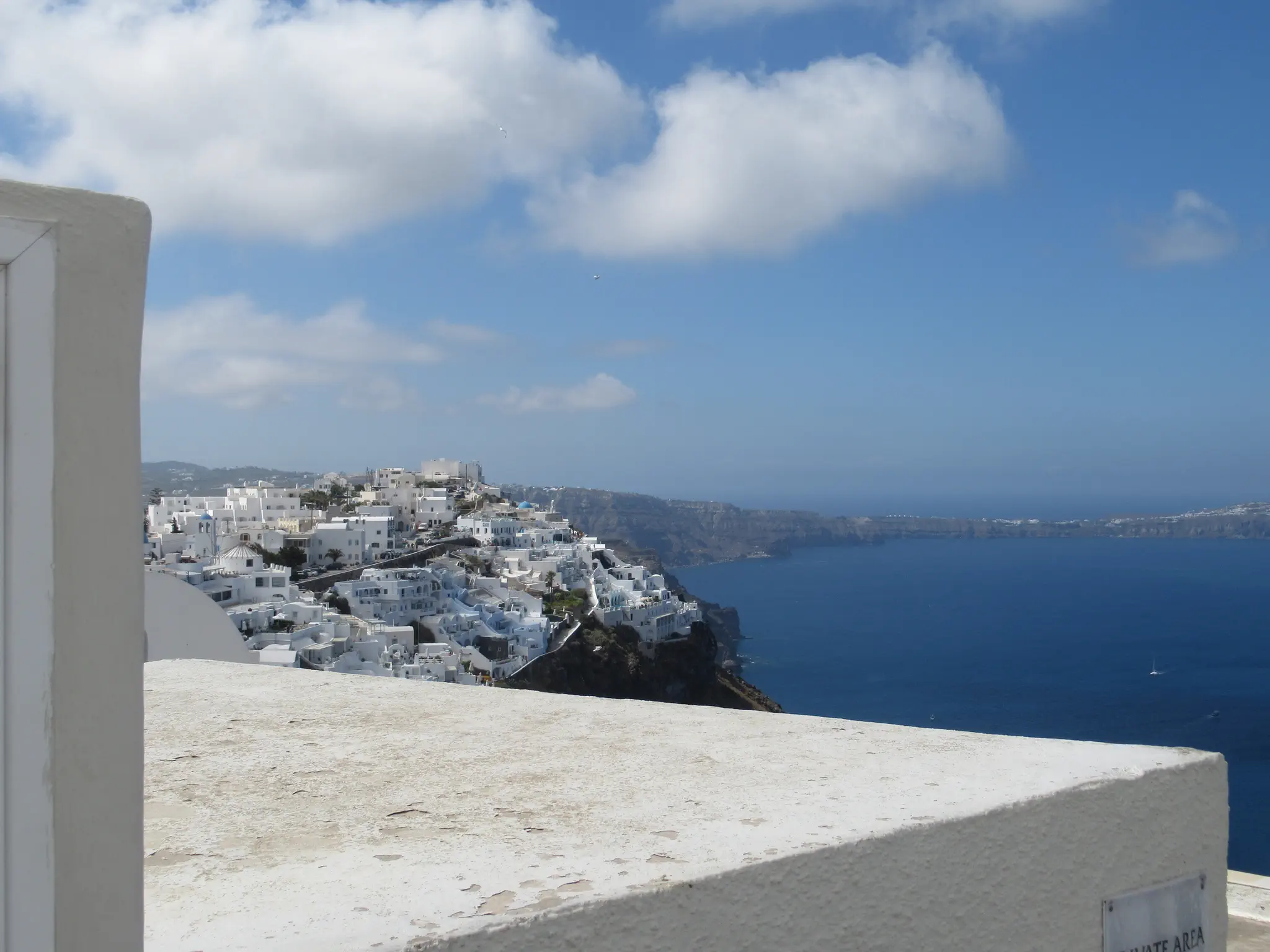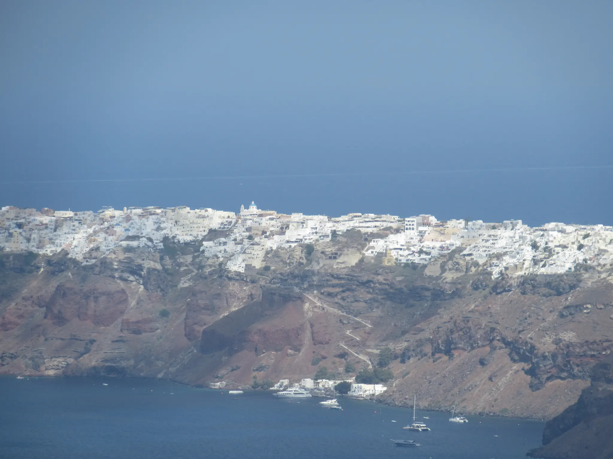 A camera zoom into Oia. We started the hike but did not go all the way. Owen is not a hiker. What we did has some trails, some walk through towns, and some had to walk on streets -- all with very good views, some with the ocean on both sides.