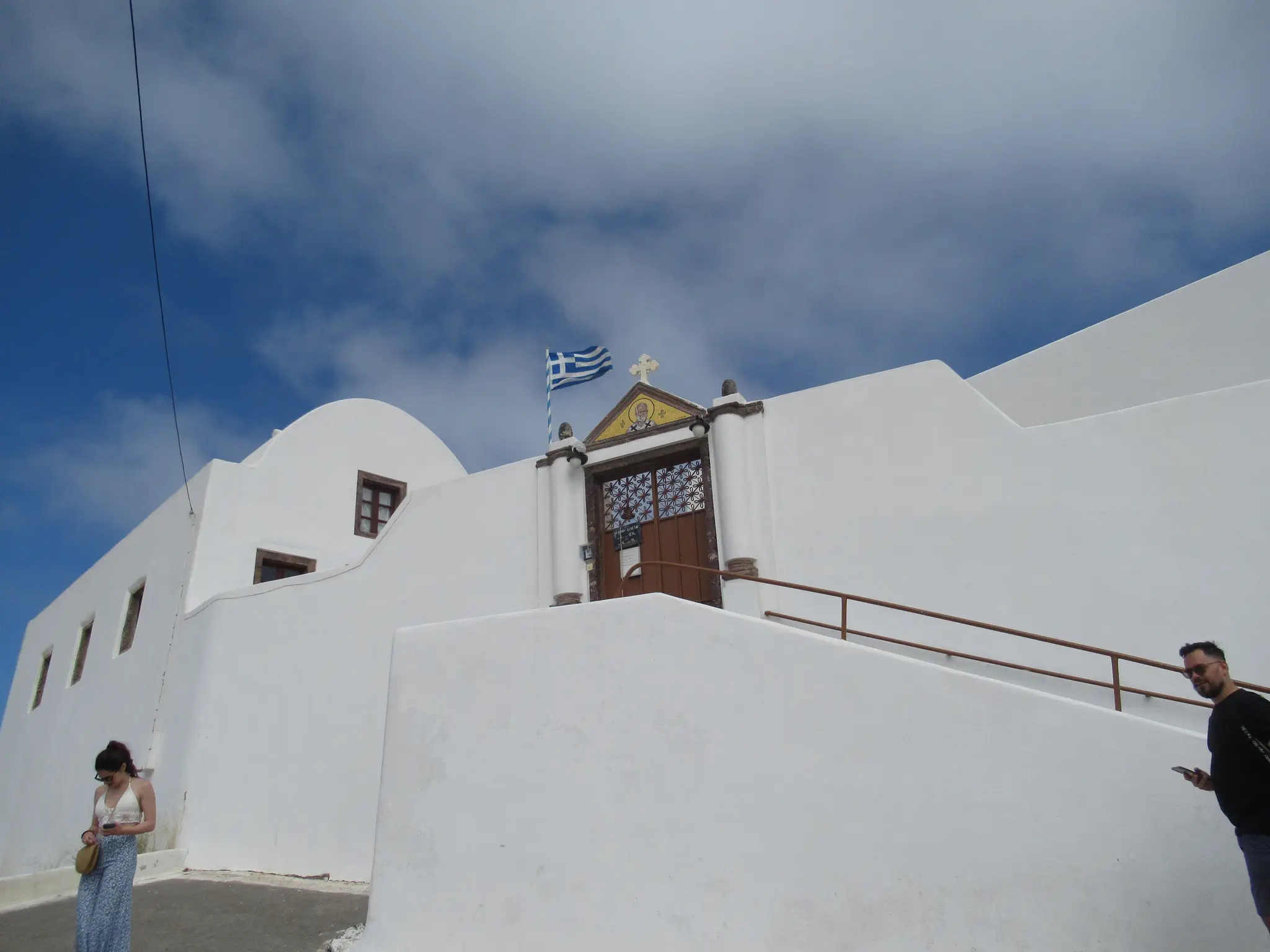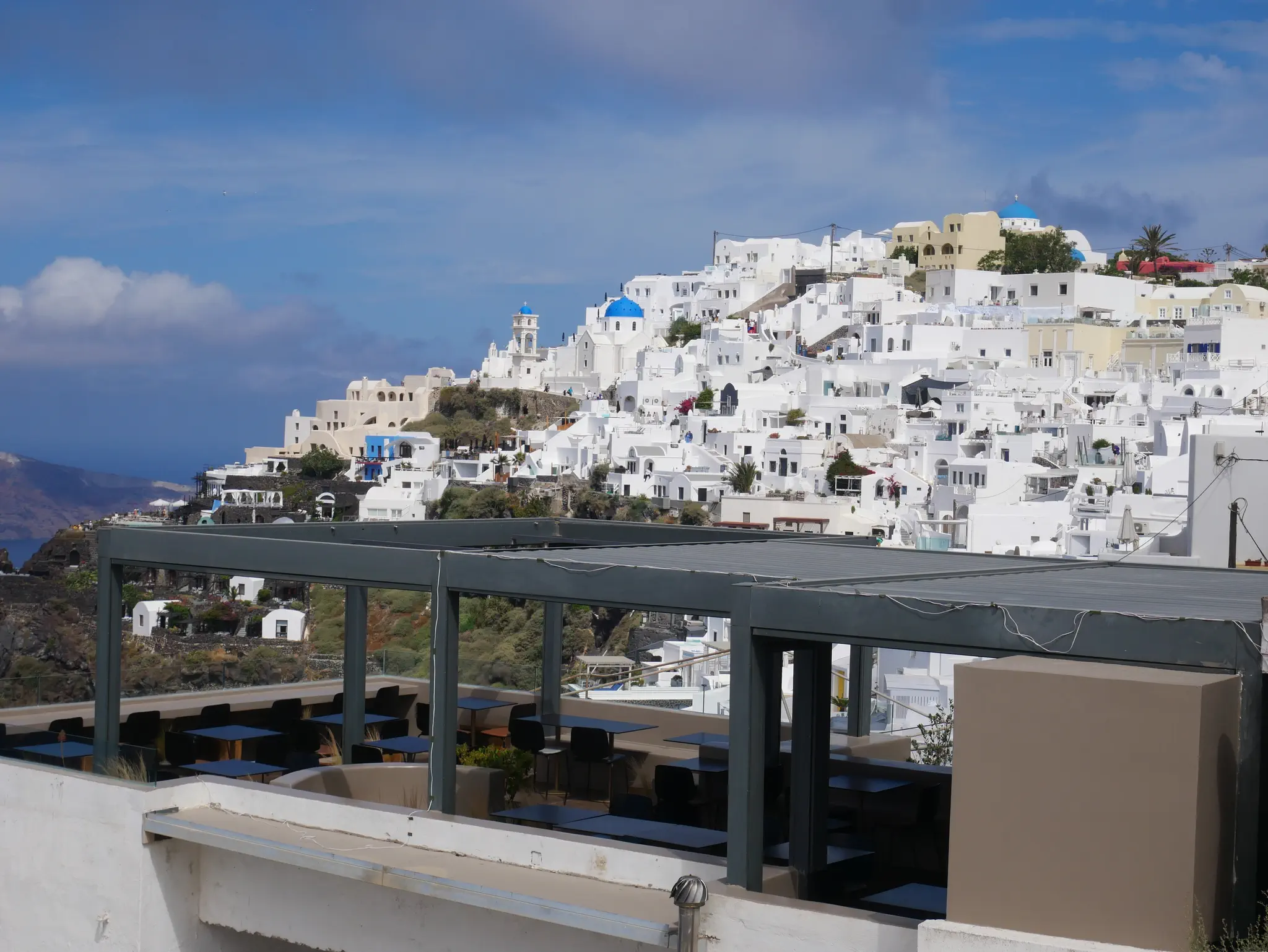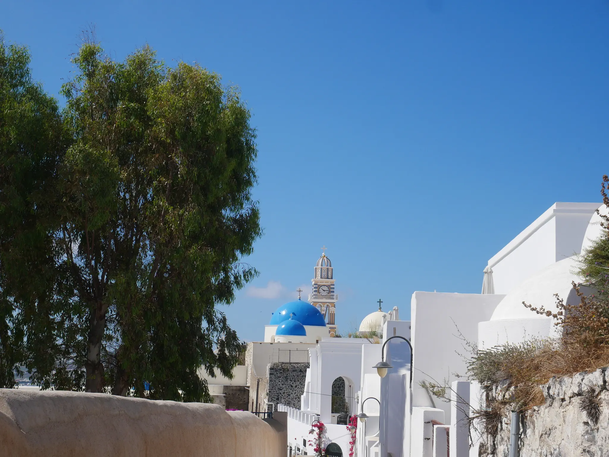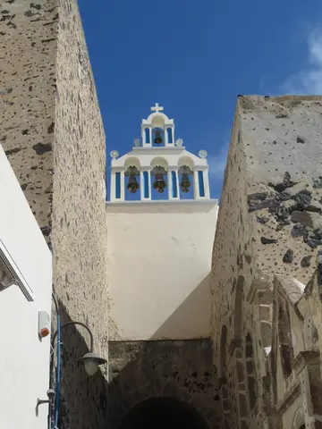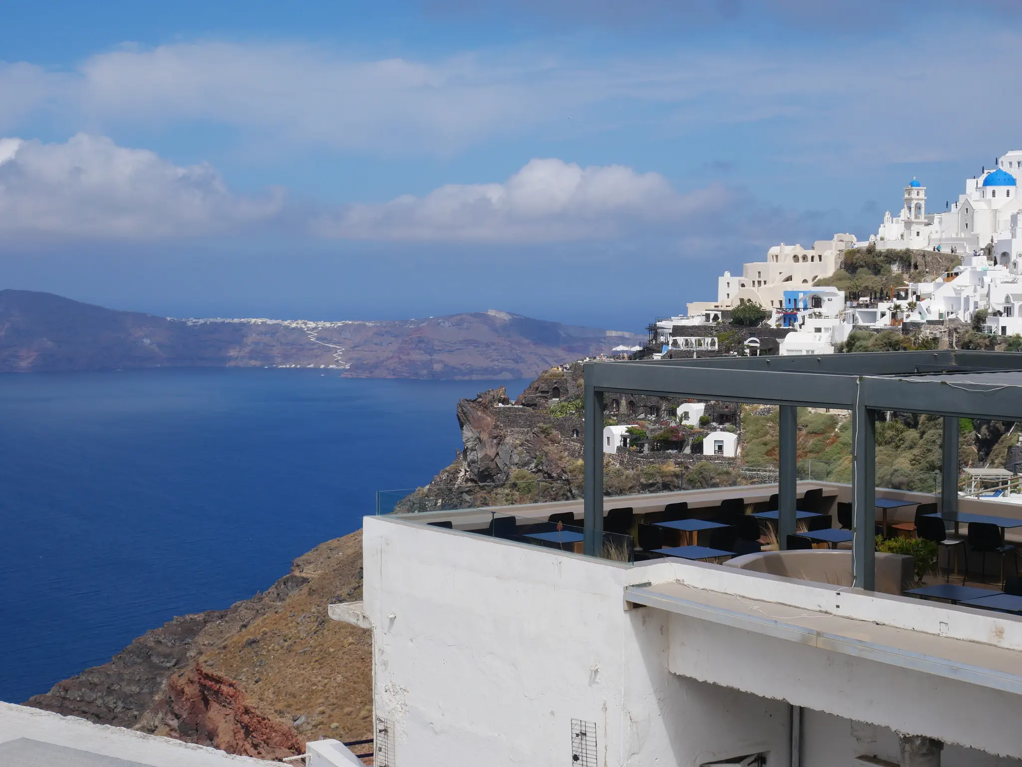 A camera zoom into Oia. We started the hike but did not go all the way. Owen is not a hiker. What we did has some trails, some walk through towns, and some had to walk on streets -- all with very good views, some with the ocean on both sides.