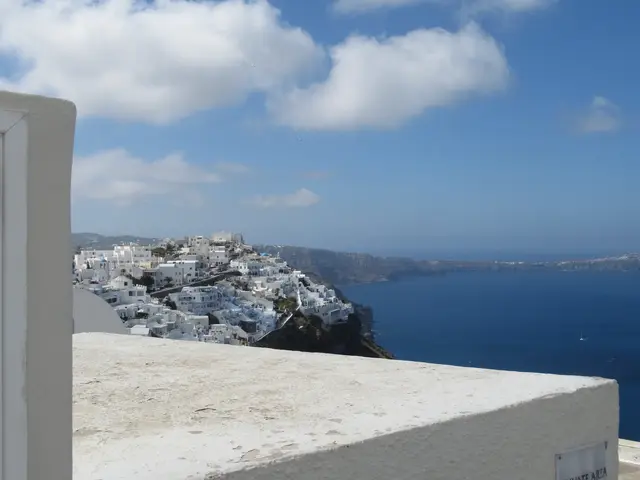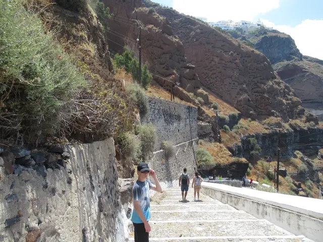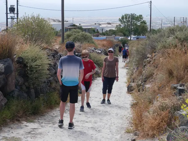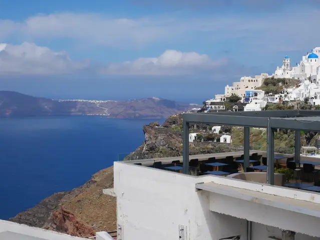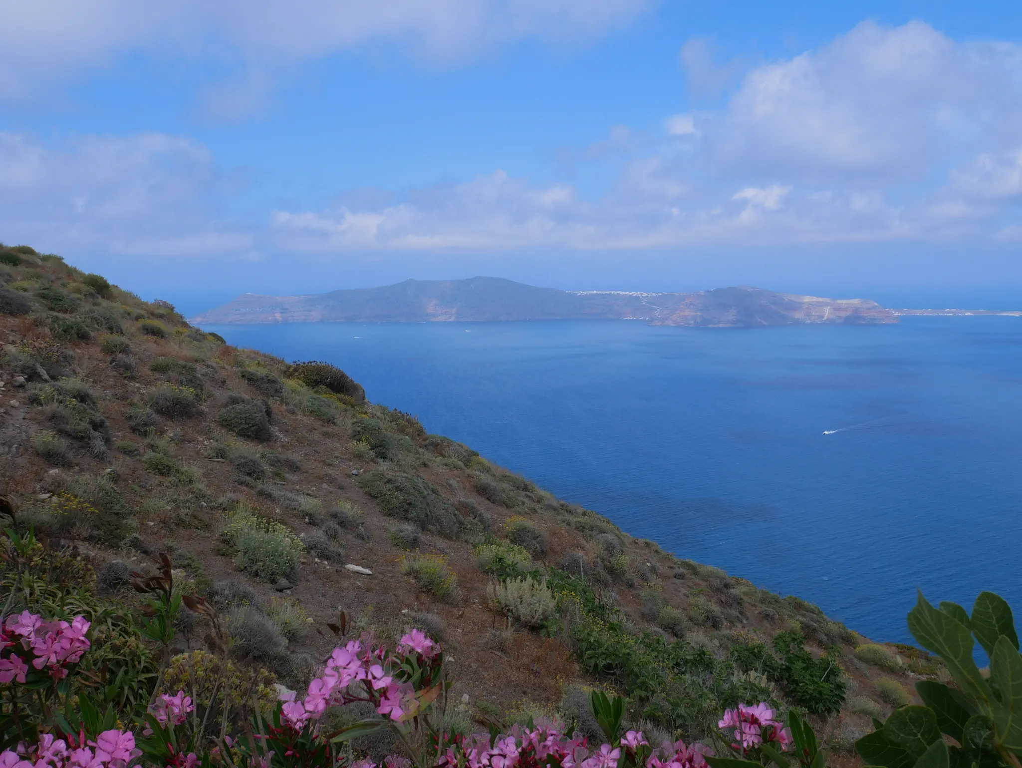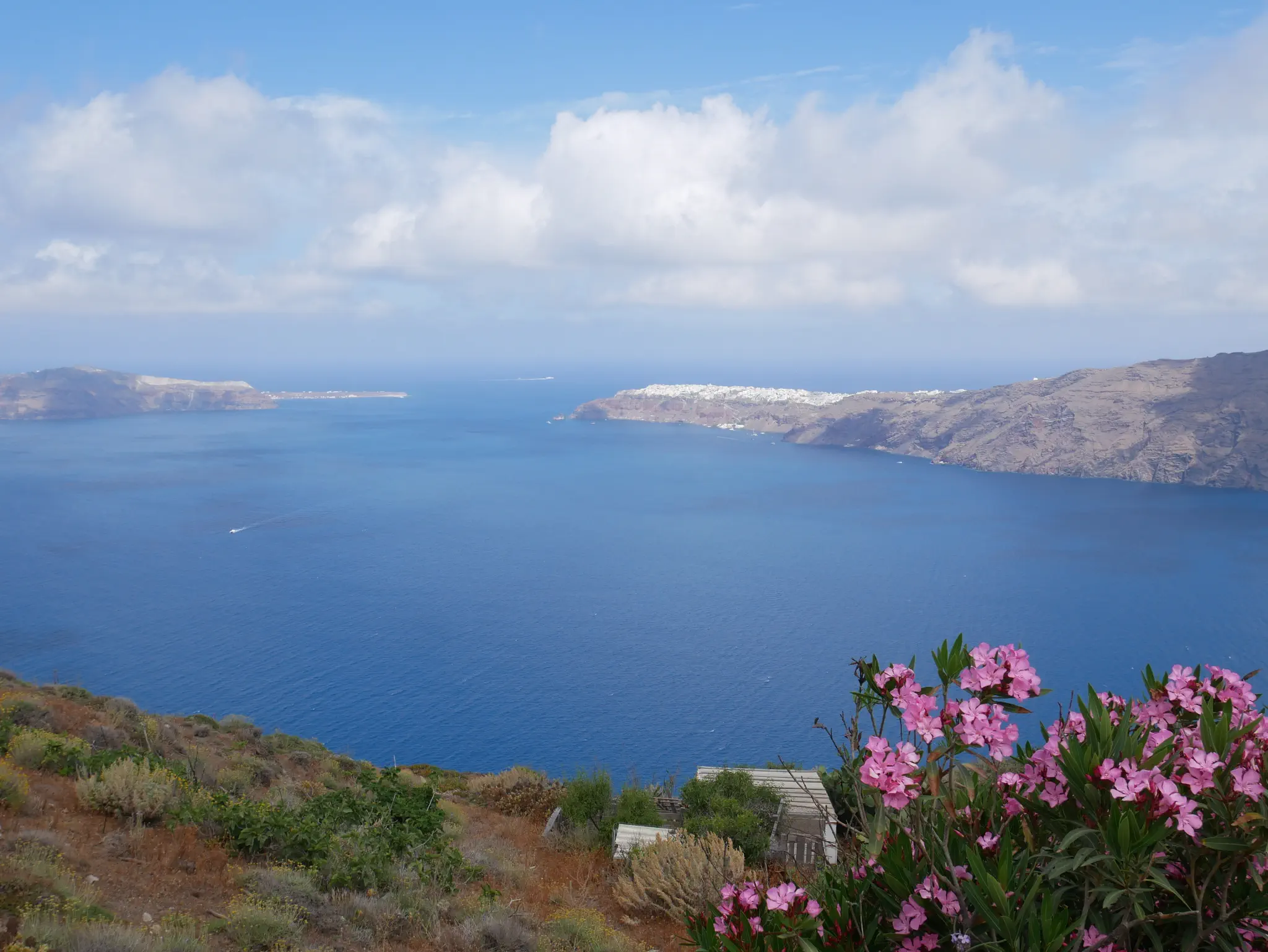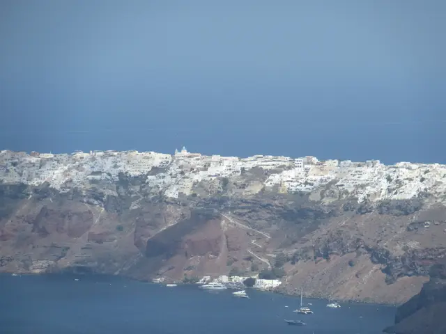 A camera zoom into Oia. We started the hike but did not go all the way. Owen is not a hiker. What we did has some trails, some walk through towns, and some had to walk on streets -- all with very good views, some with the ocean on both sides.