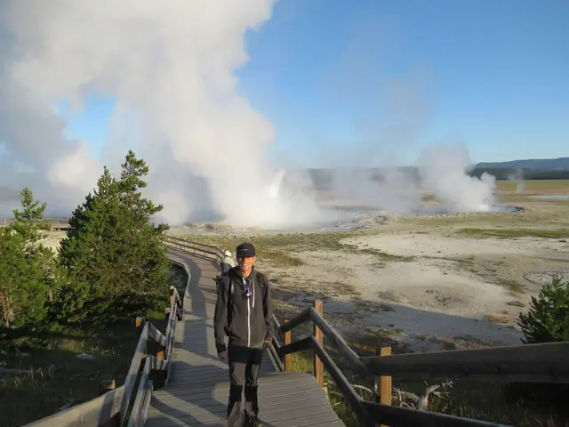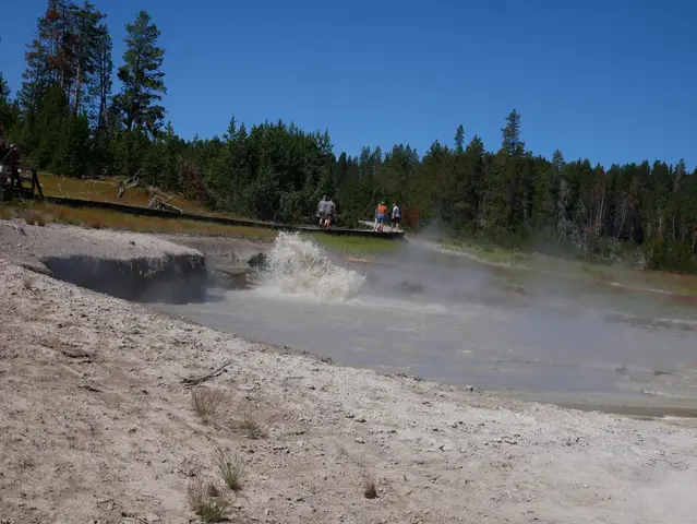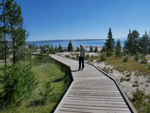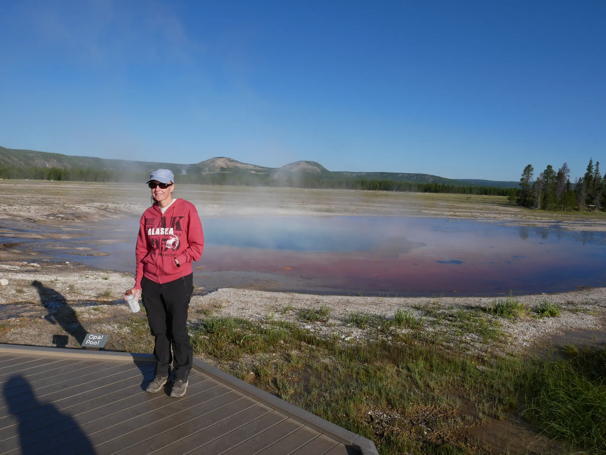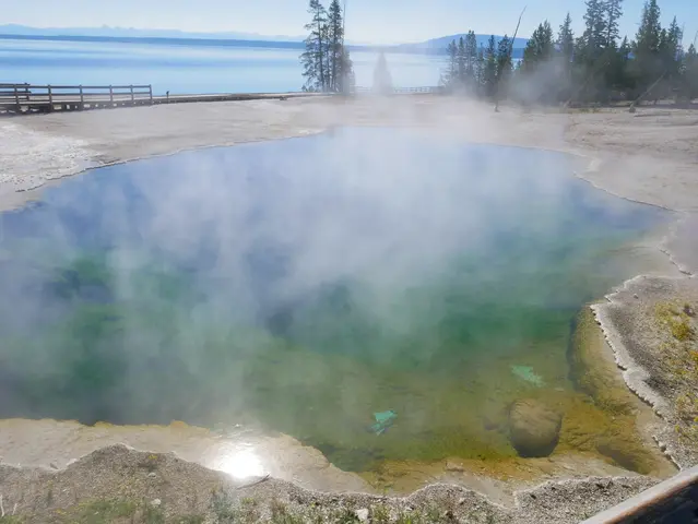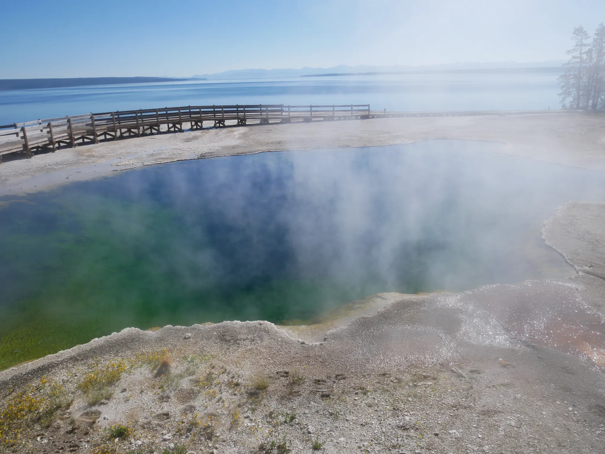 We drove to and hiked West Thumb Geyser Basin Trail that Travis found on his NPS.gov app. I have a non-official one, both offer good suggestions on hikes, most that we pre-planned but needed an idea here because I went the wrong way. This area was cool to see the geysers and hydrothermal features right next or IN Yellowstone Lake. In the parking lot, we also inquired about a jeep with German plates. He said it was shipped over. Maybe they were doing a full USA tour; I did not get much information besides shipped. However, they were still planning/looking over a map on the jeep when we finished the hike, which seemed odd.