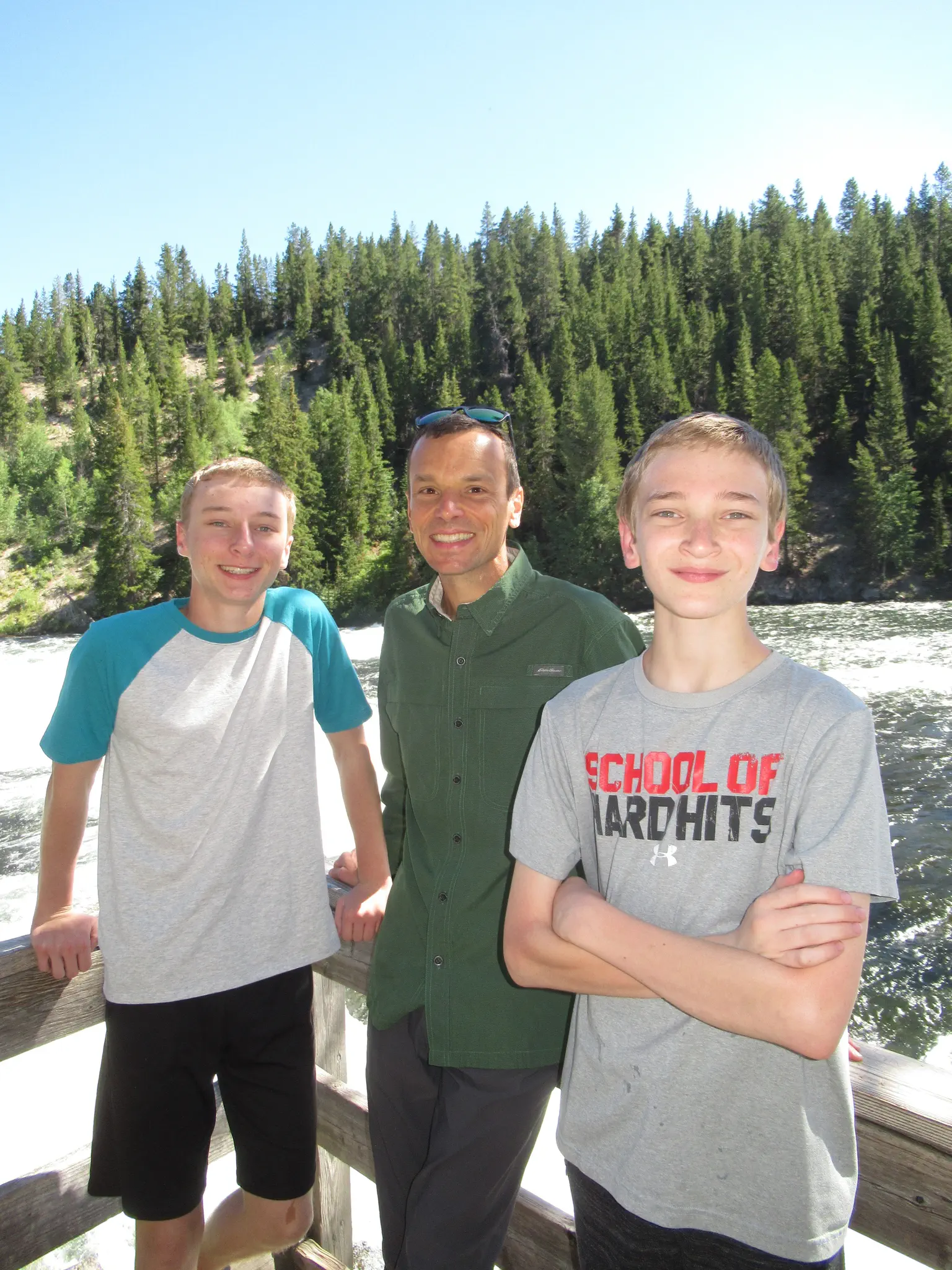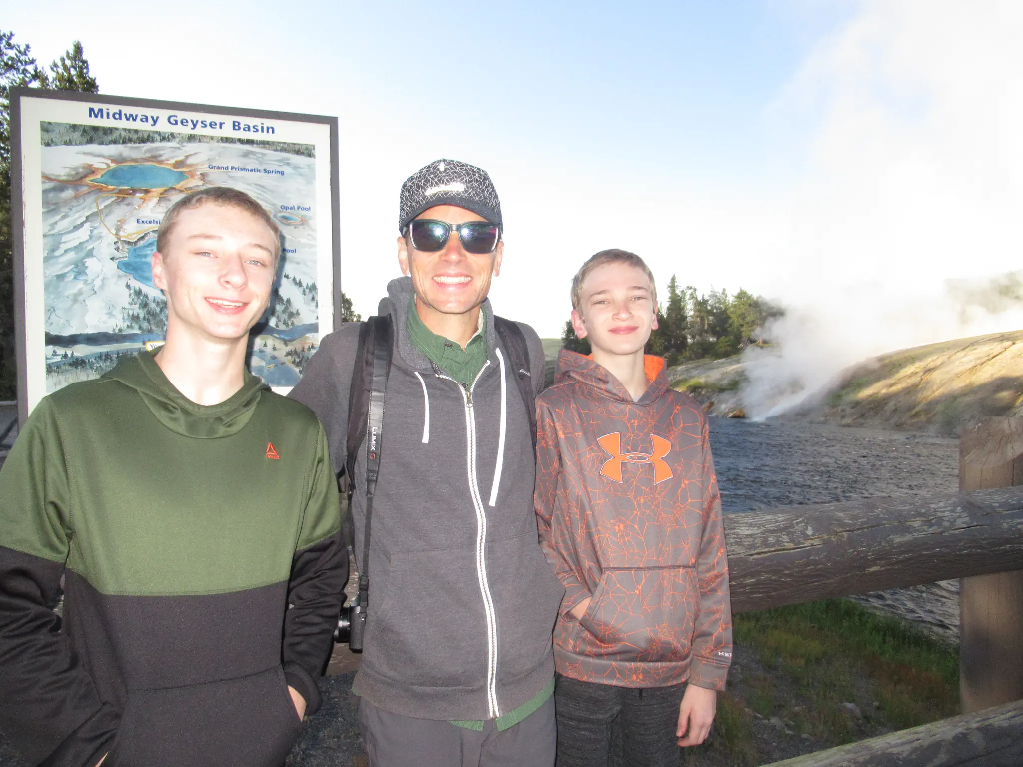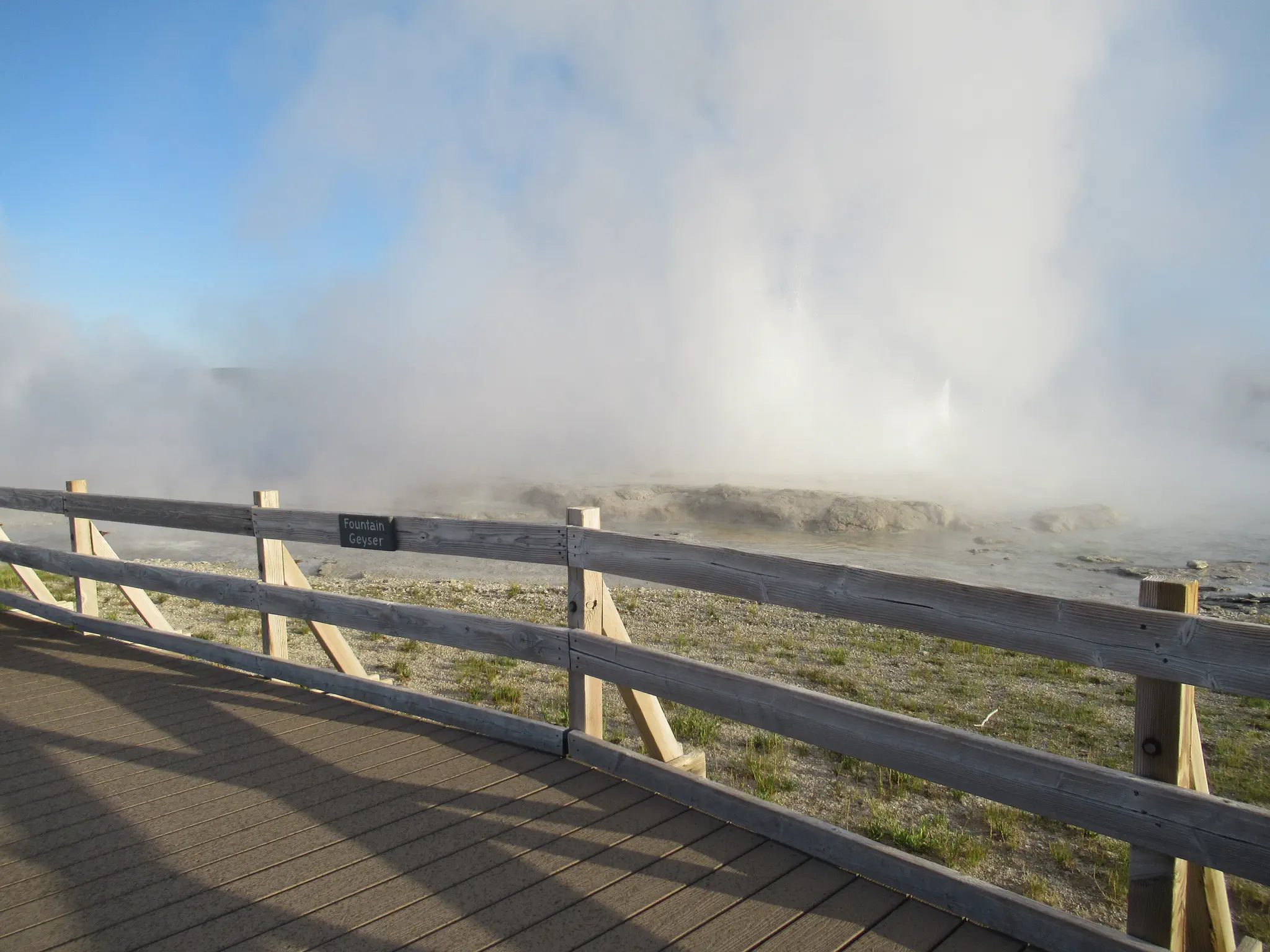 At Lower Geyser Basin, we lucked into Fountain Geyser off and the full time that we were there/we watched for a while. Travis with Fountain Geyser from a distance.