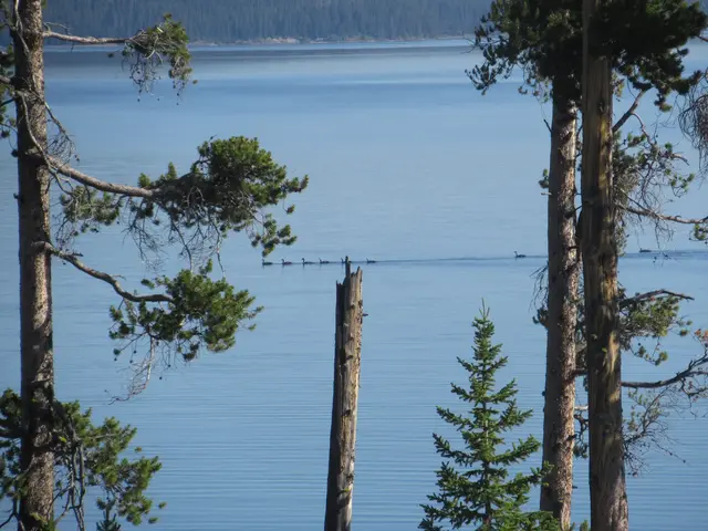 West Thumb was right behind the visitor center. We took a quick look; the lake was very pretty against the trees in the background. The kids went down to the water, and I took got a picture of the duck family.