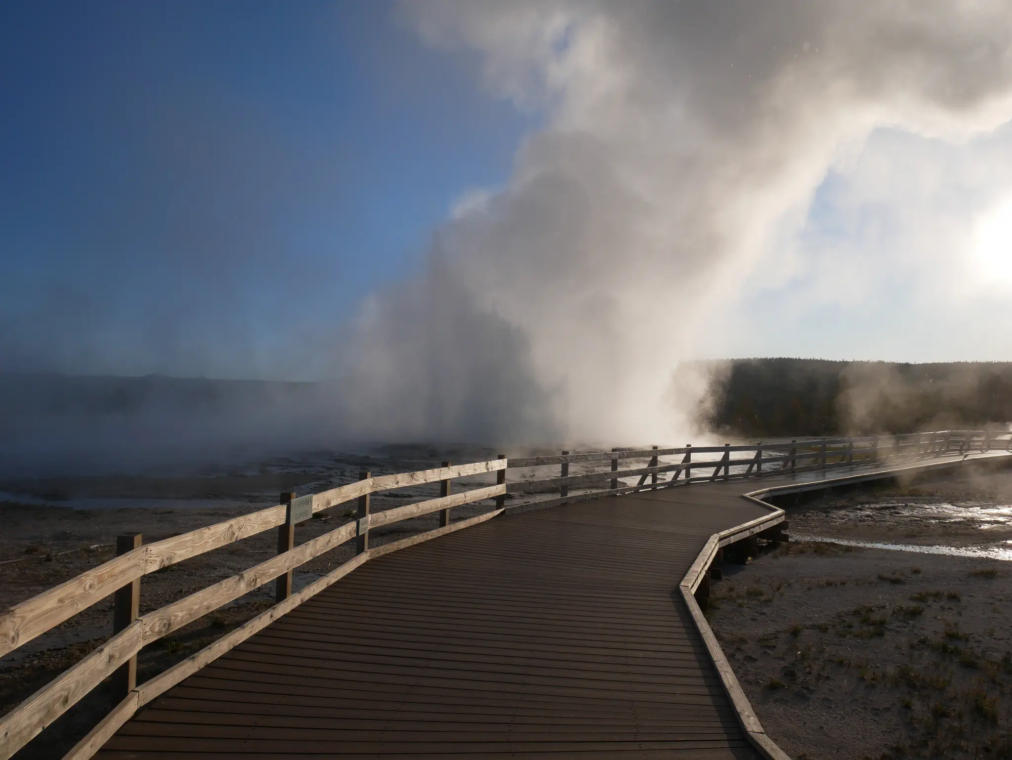 Midway with Grand Prismatic Spring. This trail was pretty and had some other attractions, but Grand Prismatic itself was very hard to see early in the morning and at the same level. It had steam above that obstructed most of it. Later we hiked up to the overlook, and it was awesome -- so pictures when I get there.