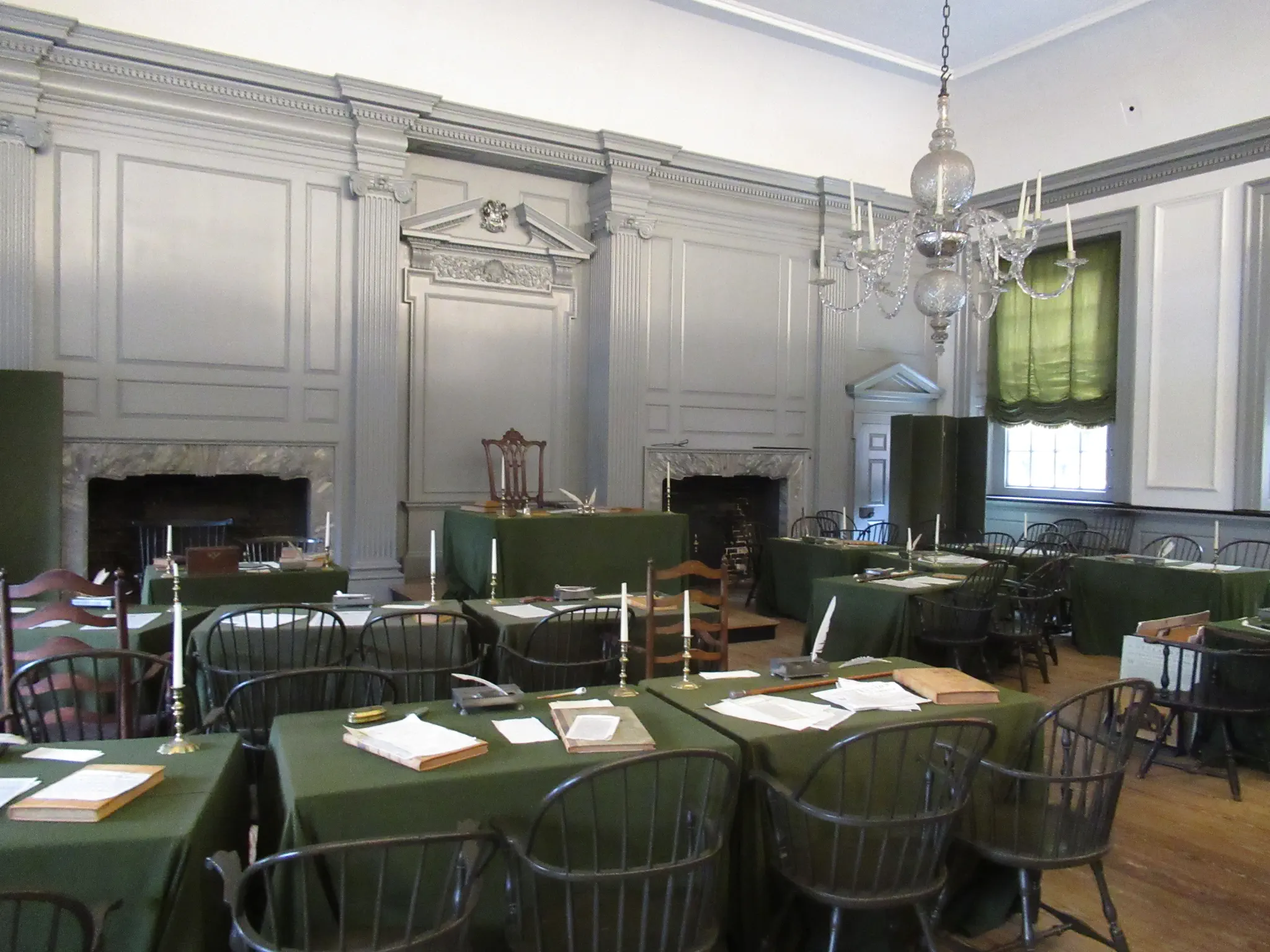 More symmetry. The Assembly room where the 13 states met to sign the Declaration of Independence and all, except Rhode Island, to debate the Constitution. Each state had a table, and George Washington sat in the middle, back desk.