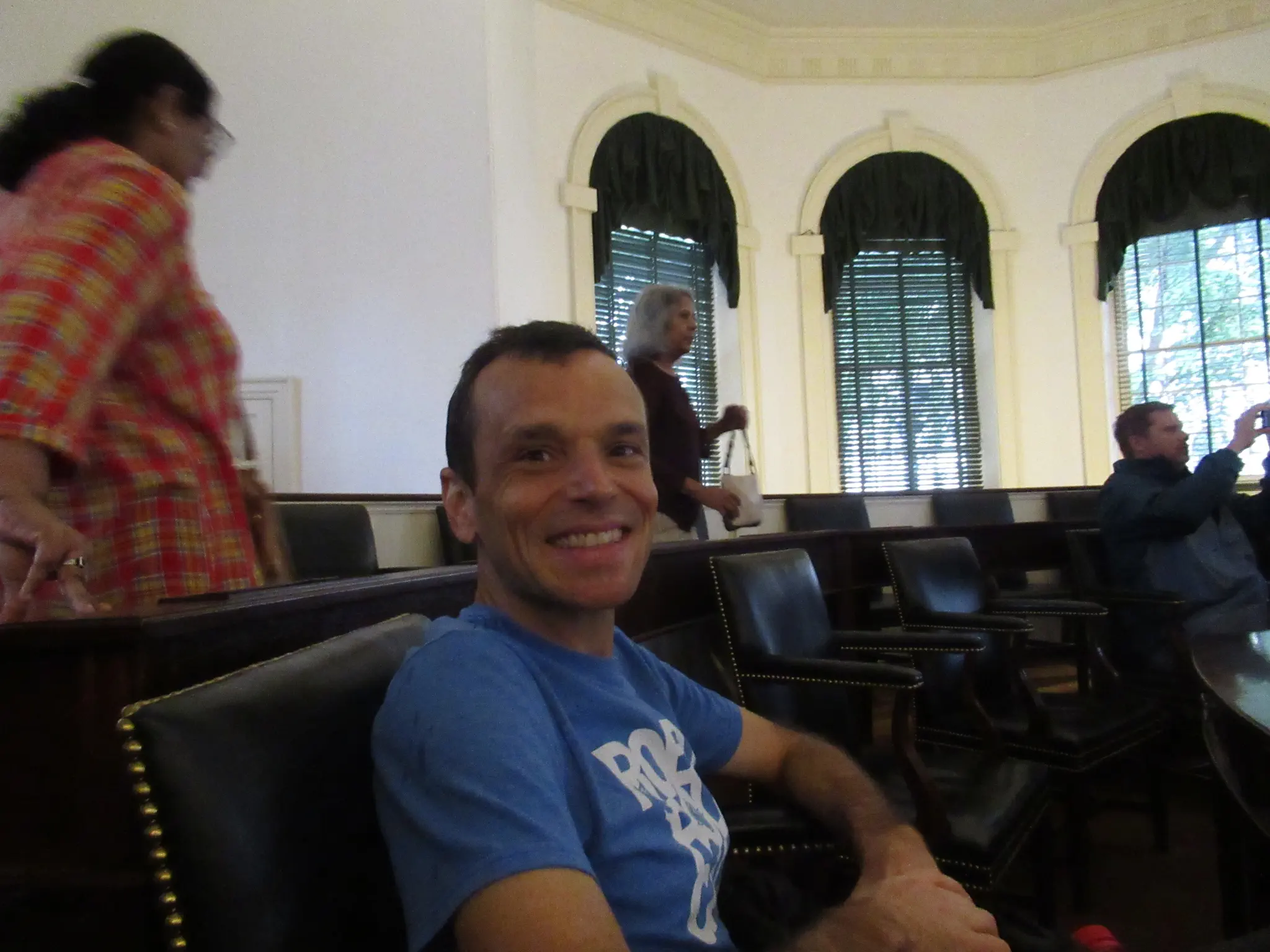 During the tour, it started raining, so our guide recommended that we go directly to a close building with documents on display, including one of the copies of Declaration of Independence. Then we found a tour starting soon of the original House of Representatives and Senate. The Ranger lead us to a covered area to wait out of the rain. It stopped raining when they were ready to start. After we were in the secure area, we were able to join the additional tour. This is the House of Representatives with replication furniture, so they let us sit on it.