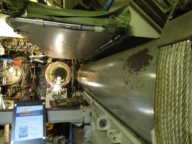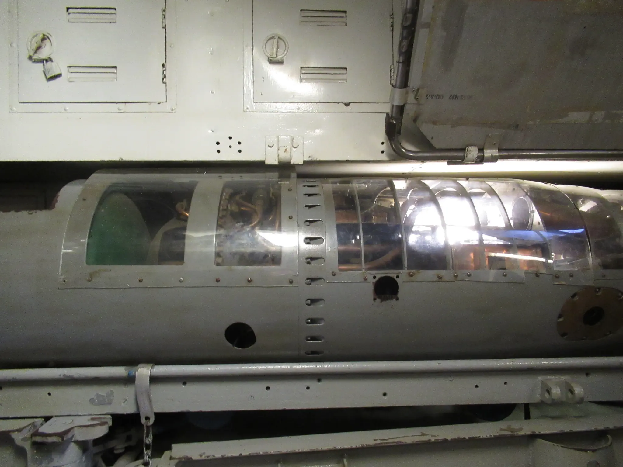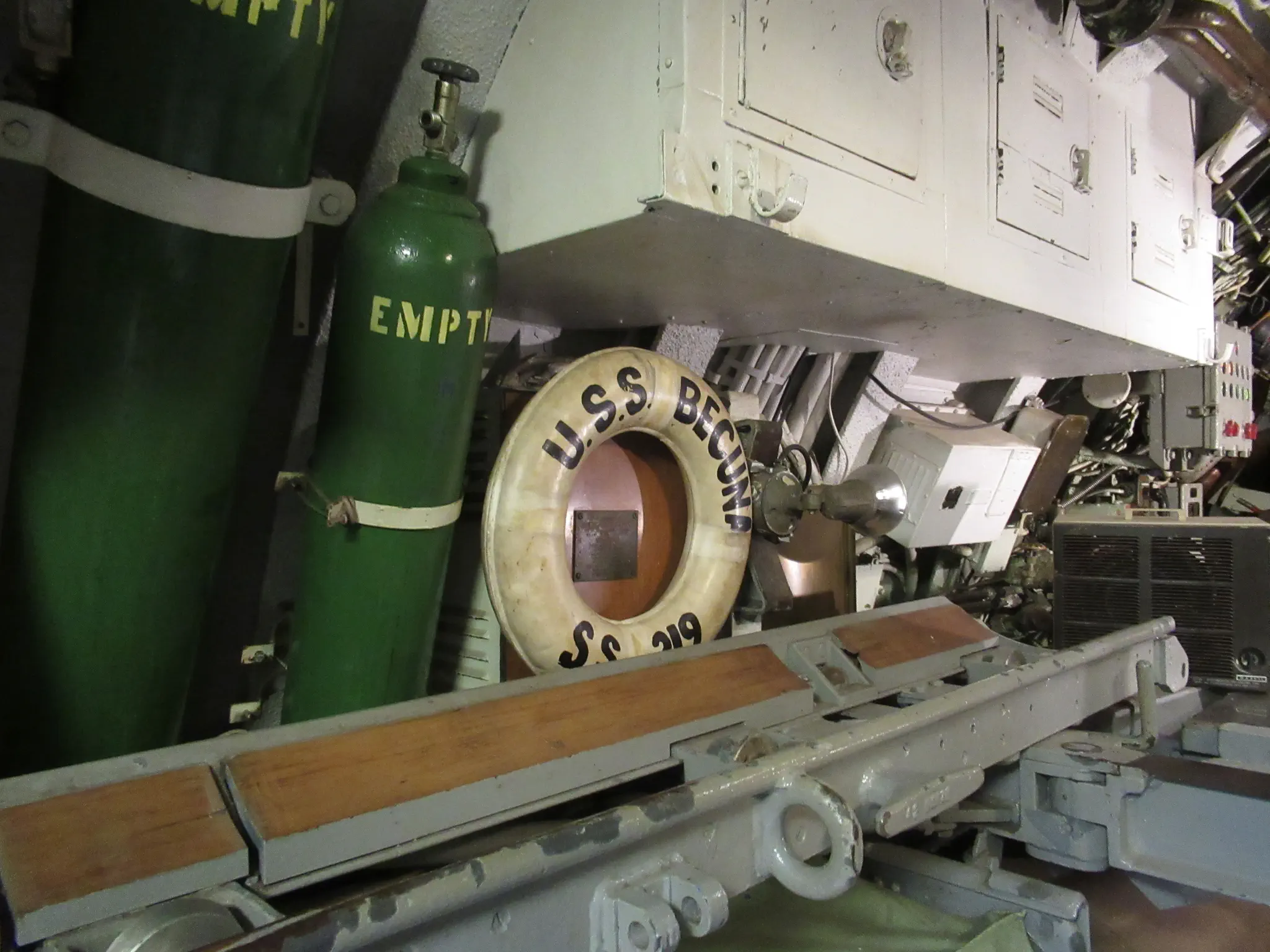 Seeing inside a torpedo and looking down the barrel of a torpedo chute, noting the bed above it.