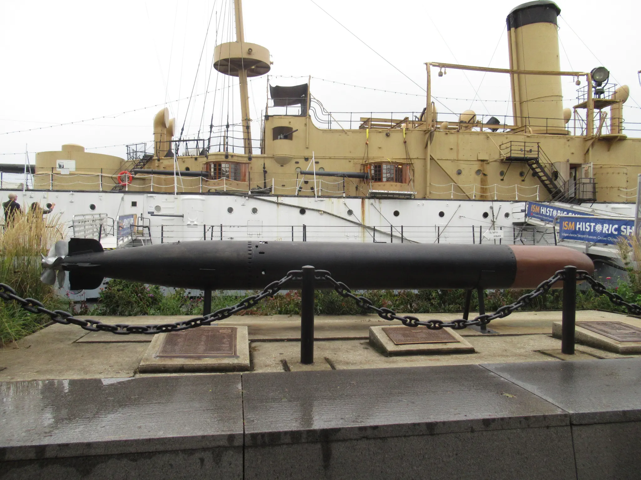 The Independence Seaport Museum was on the waterfront. Since it was not crowded on a Thursday, we had to enter and buy tickets in the gift shop. We bought the normal ticket with the museum and USS Olympia plus the submarine, USS Becuna, tour. We had a little time before our submarine tour, so we started at the very first part of the museum. Then we did the walk (they noted about 5 minutes) to the Olympia and the submarine. It was raining again; not too hard. We showed our tour tickets, she said that we could wait under the trees for rain protection, and that she would let our tour guide know that we were here. We were the only ones on this tour. Our tour guide was previously in the Navy, and she was also very passionate about the topic. She noted how the US Government offered to donate the submarine to the museum, which they ecstatically accepted. Though she said that the Government forgot to remove some of the nuclear material from the topedes. That sounds like a challenge of dispose of properly or affordably! Travis tried out the beds in the buck room with three levels. In the front and back torpedo rooms, the bulks were directly above the torpedo or rolled out from under it. That seems too close!