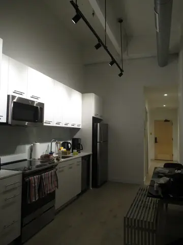This is the studio; they had one and two bedroom rooms too for families. In front of the bed was a TV that used Chromecast over their wifi and a closet with stacked washer/dryer inside. The second picture is from the bed (L shaped room) -- a kitchen with supplies, big walk in closet where we kept our luggage, and bathroom.
