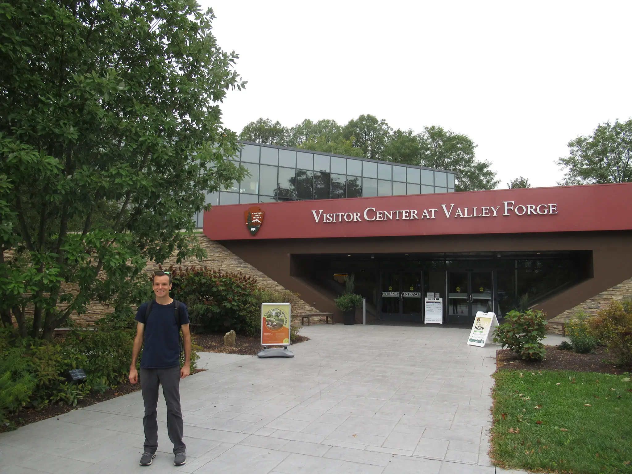 We continued back to the Visitor Center and bus stop in the rain where it let up a little. I was wearing a short sleeve shirt that was soaked; it was not cotton but still wet. Travis had his frogg togg jacket on protecting his shirt, the backpack, and cameras and phones. When we made it back, I changed in the restroom to a dry sweatshirt that I had with us. We stood under the Visitor Center entrance cover until it was time to go to the bus stop (to the front and right of the VC) to be sure that they knew someone wanted to catch a ride back to Philly. Our pants dried more on the bus.
