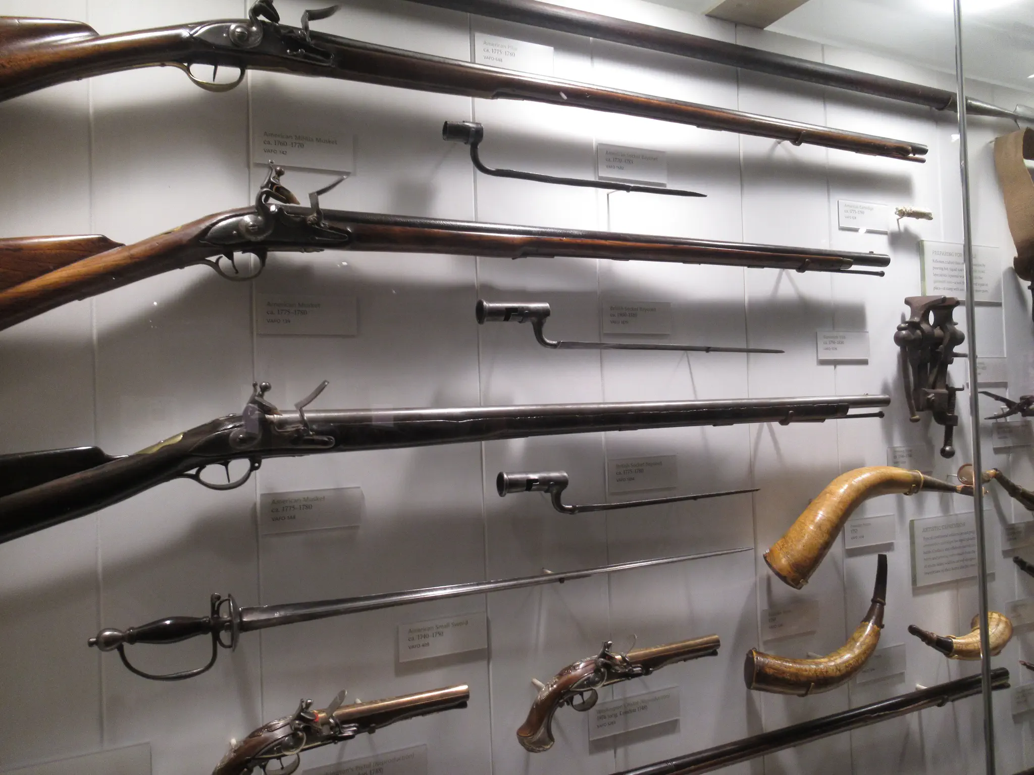 Revolutionary war guns and gun powder horns that the owner had decorated with carvings. The Visitor Center announced the movie starting in the next building in ten minutes, so we went over to watch it. It was very informative because before I knew very little about Valley Forge's purpose.