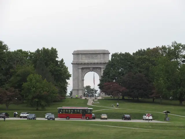 Great view of the National Arch, flag, fall foliage trees, and the tour Trolley.