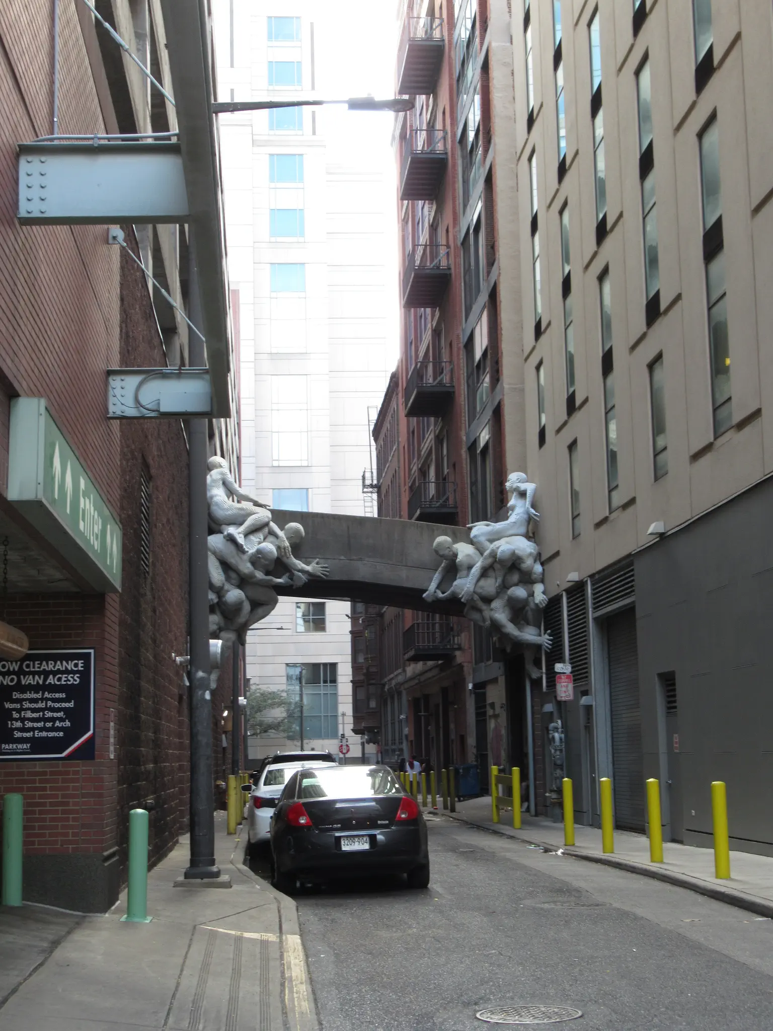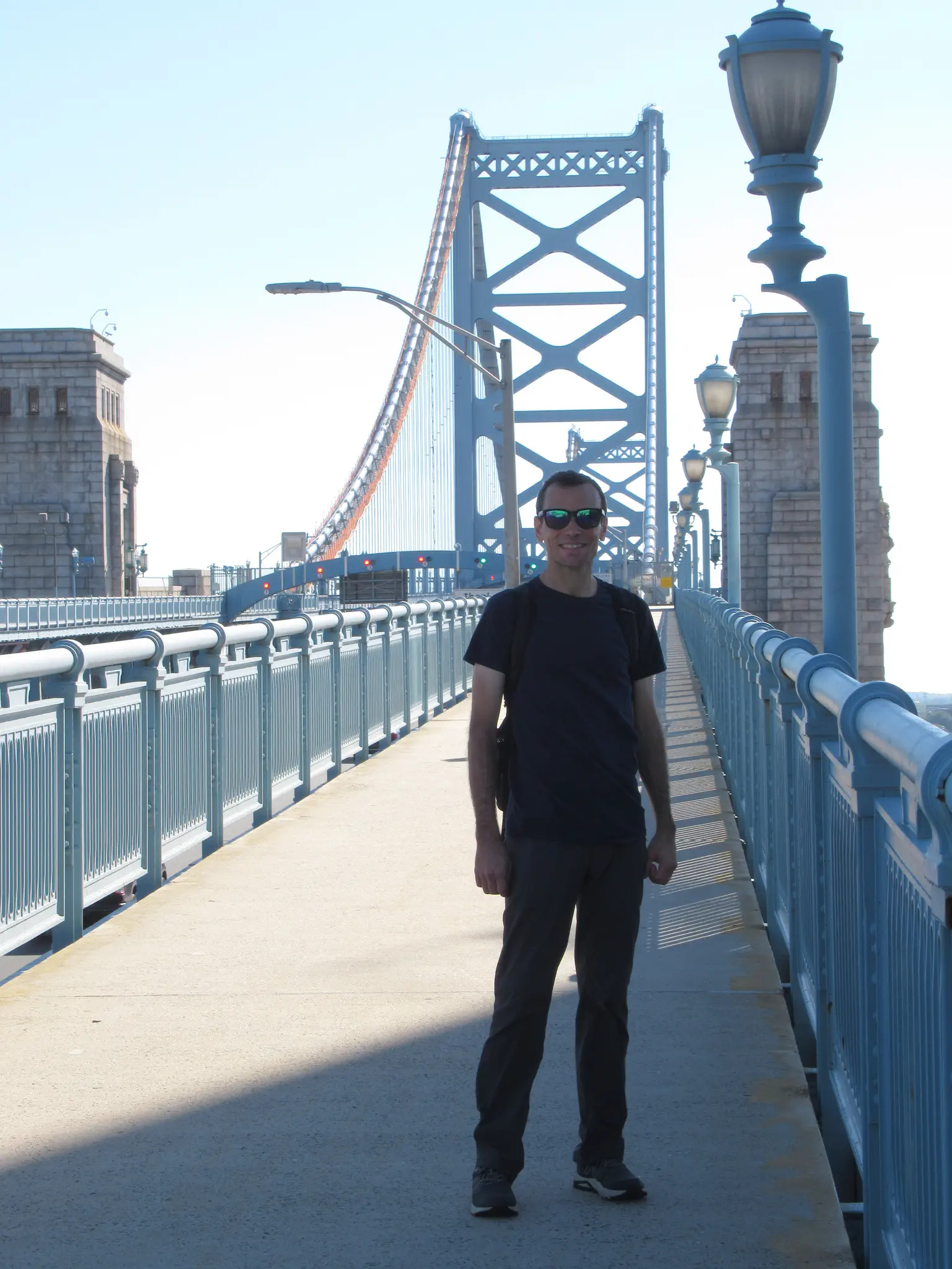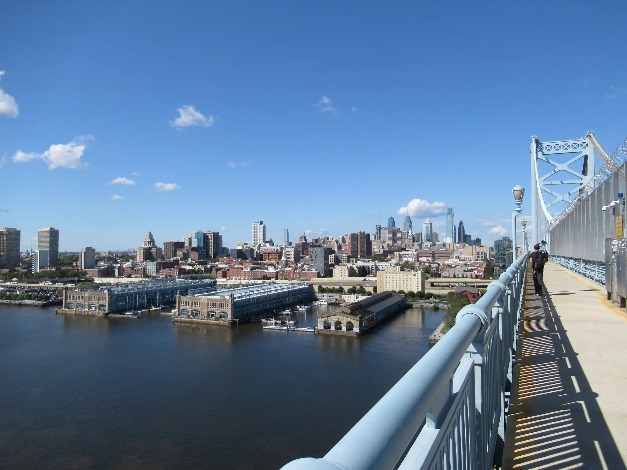 Today we walked across the Benjamin Franklin Bridge to New Jersey and found Camden and saw their Rudkins University location. It was a challenge to find the entrance to the pedestrian walkway. From Google maps, we could only tell that it was near the Benjamin Franklin park, which walked through another day. It had a fountain, putt-putt, and a merry-go-round. Trying our best to follow our GPS location and map, we finally found a sign saying where to go. The first entrance was closed, but I saw an under the highway walkway (first thought it may be the entrance to the bridge), which did go to the other side, which was side.