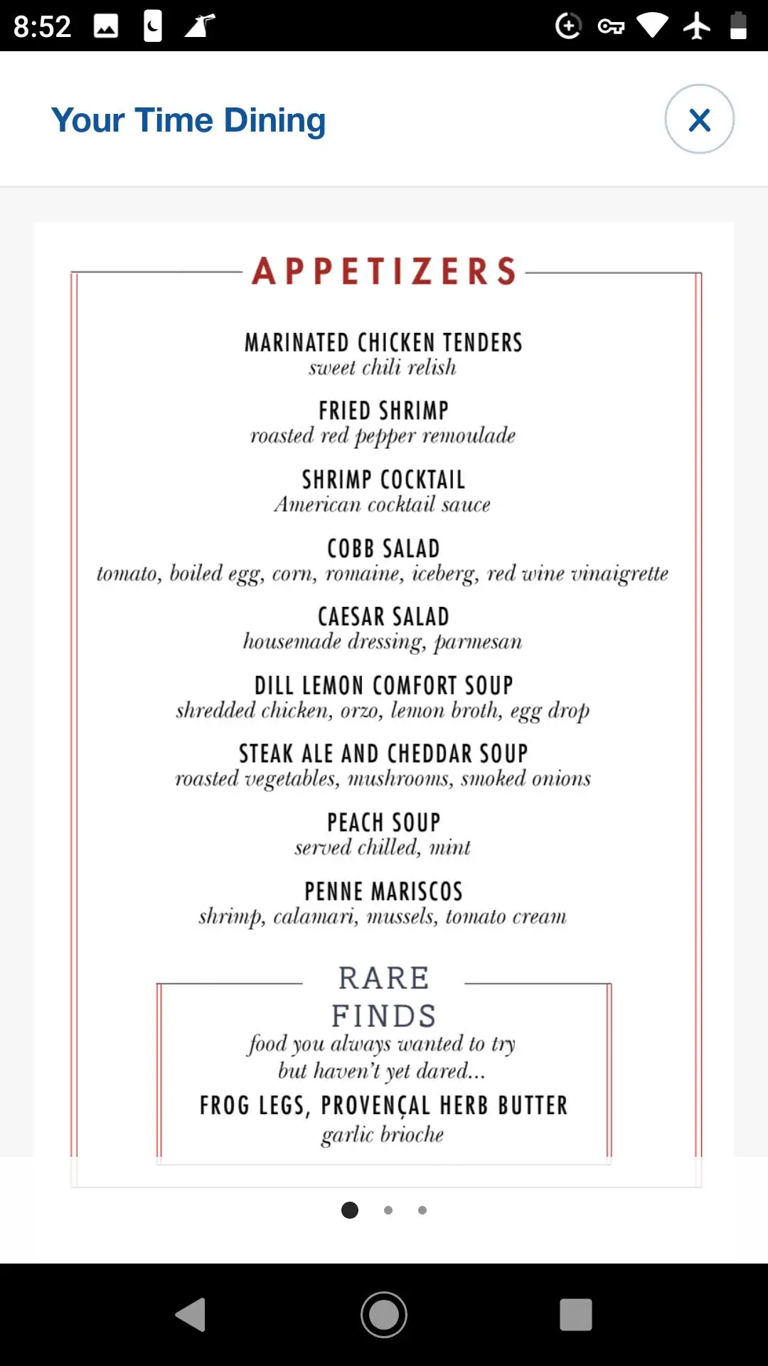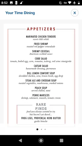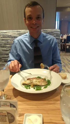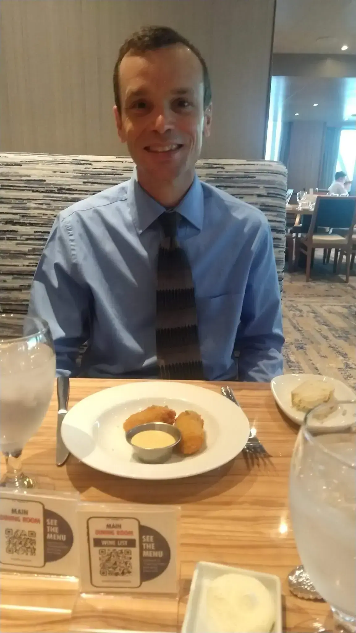 For dinner, it was the next second/last formal night. I had the Caesar salad, prime rib, baked potato, and creme brulee. The Caesar salad is not as good as it used to be (to me), but the rest was good. Travis had fried oysters, striped bass, and the cheese plate for dessert. I shared some creme brulee with him too. Dressed up, my prime rib, and Travis's oysters and bass.