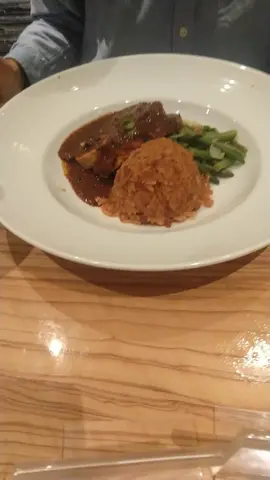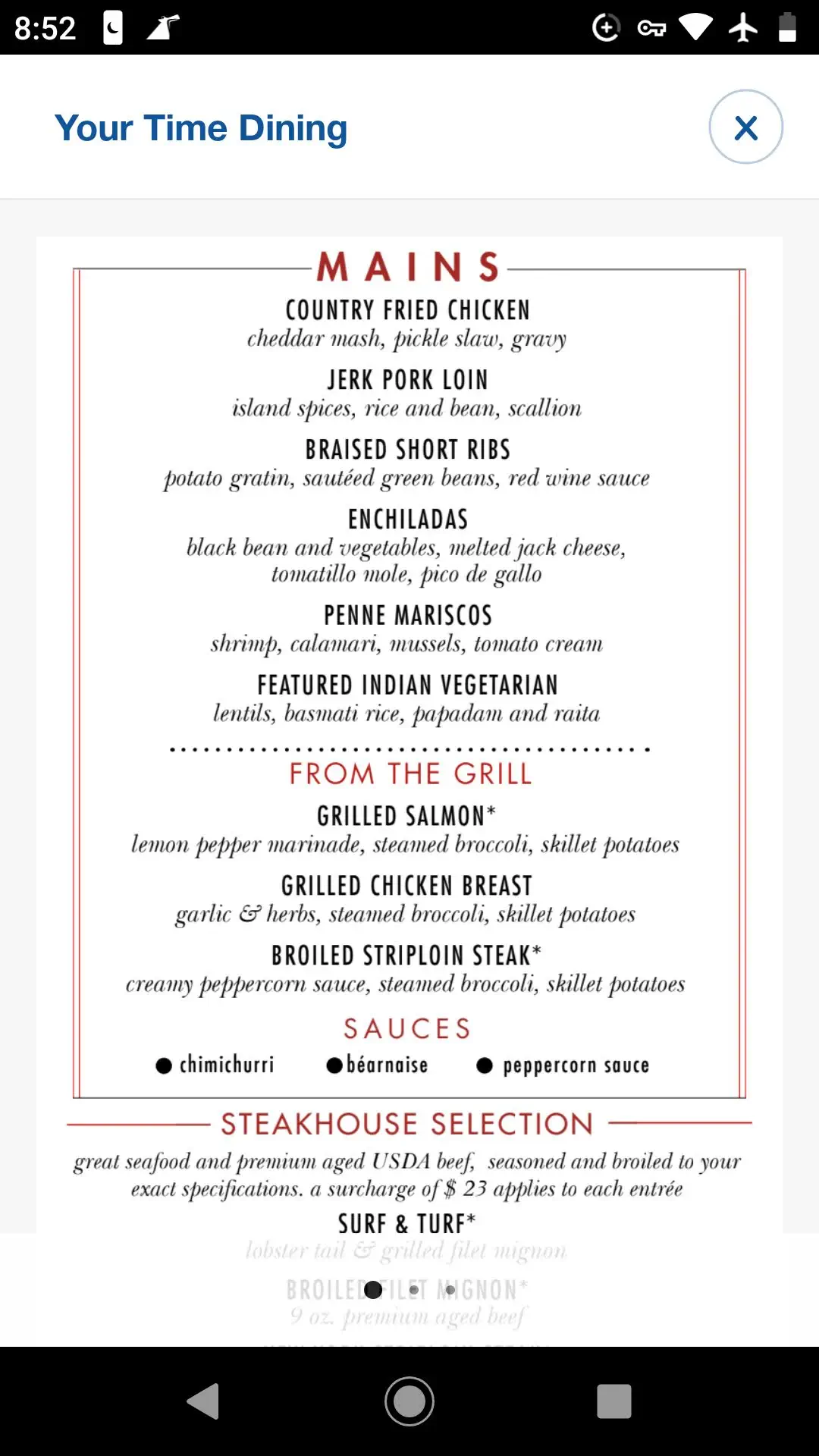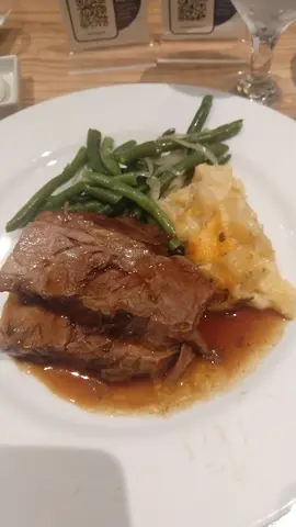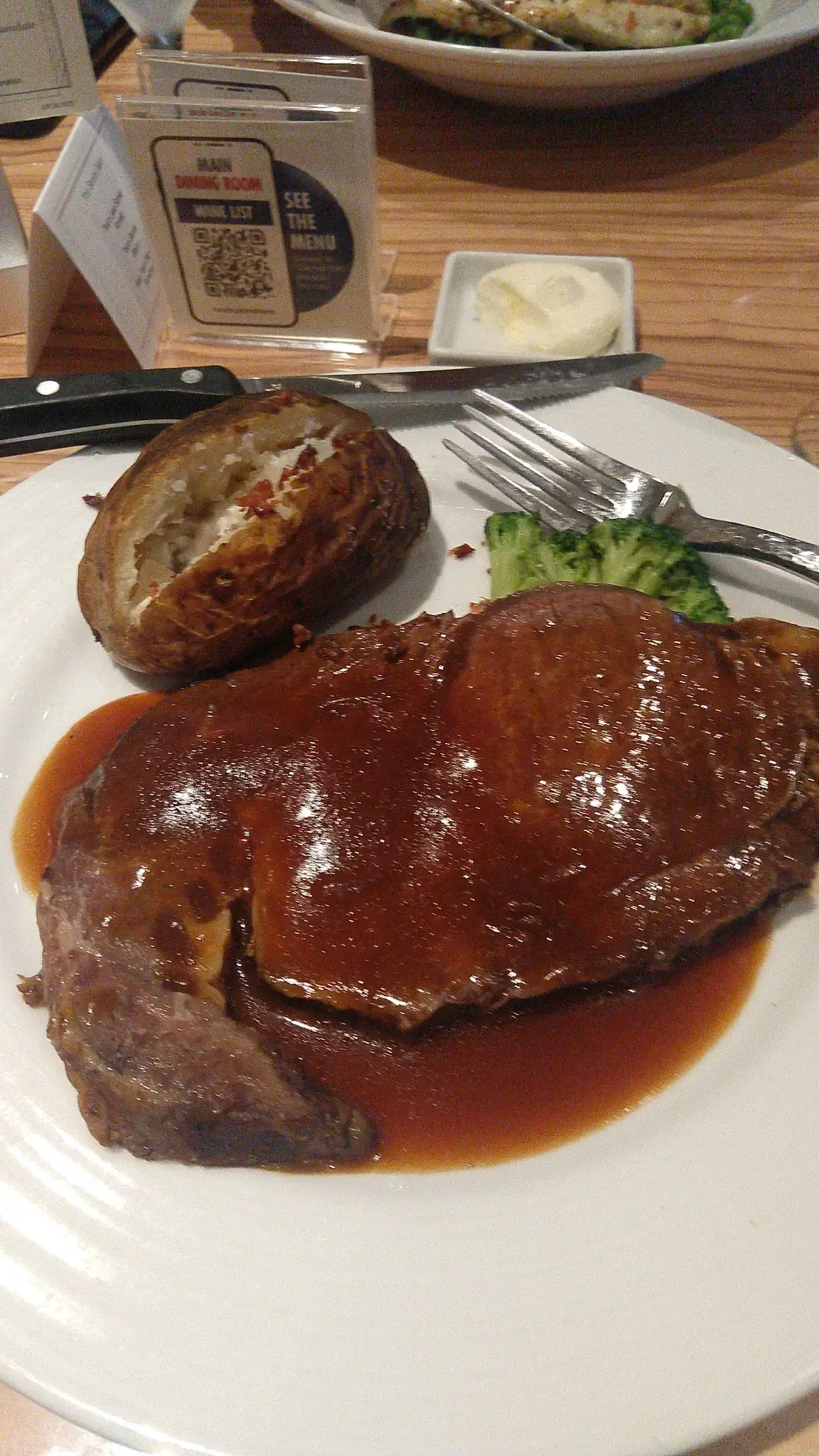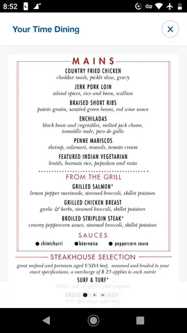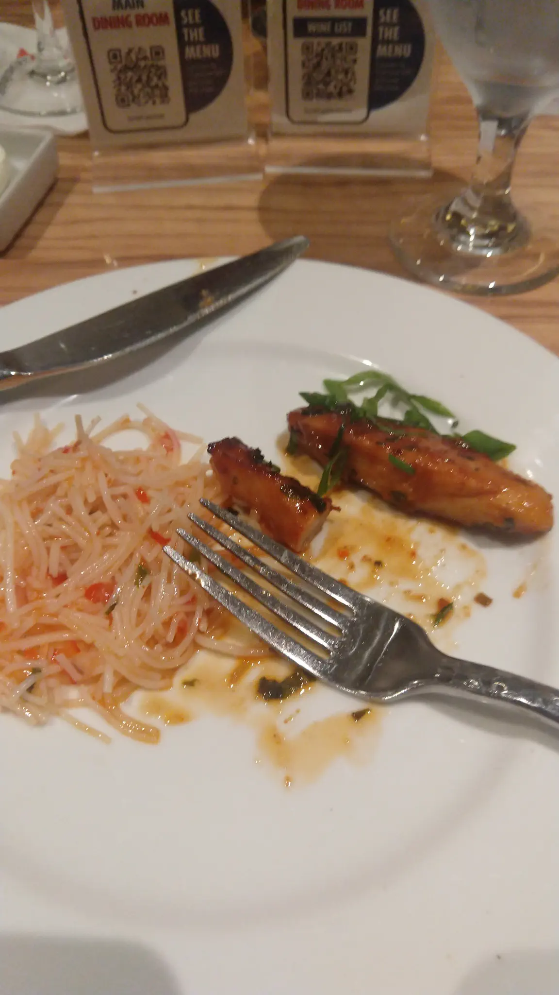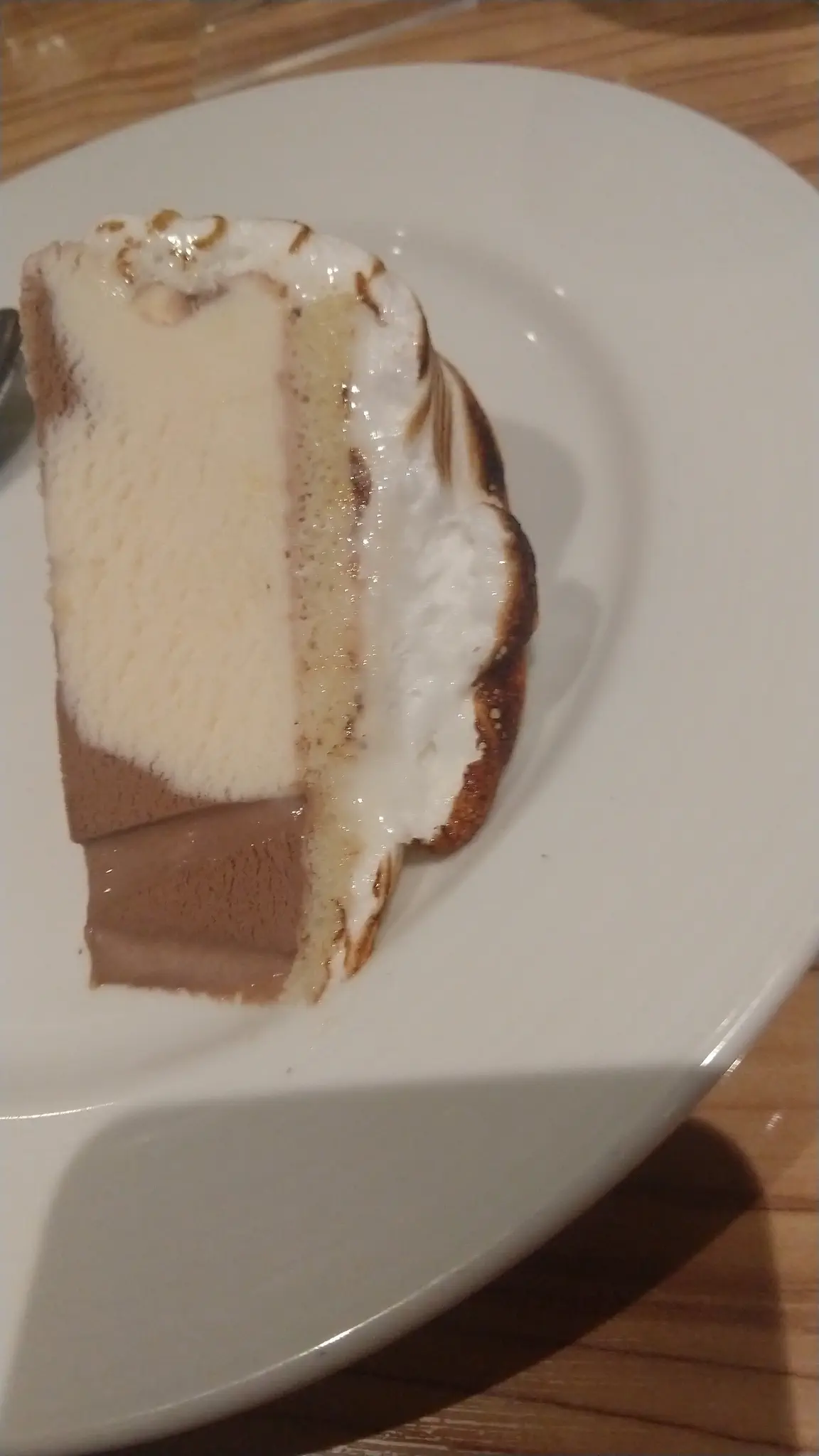 Last dinner, I had the Asian chicken tenders; they were good but the noodles were not too impressive. Braised short ribs. Travis had Cobb salad, jerked pork loin. We both had to have the baked Alaska!