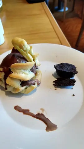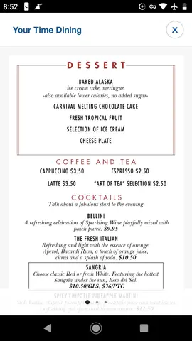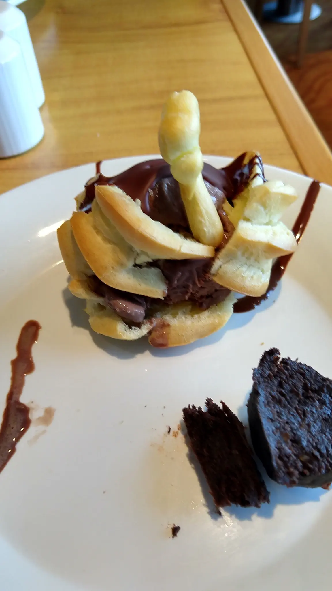 The last Sea Day was the chocolate extravaganza -- cool that they still have one; many have gone away. It was challenging being a small area of the buffet with people coming into a "line" from both sides; okay a lady with a child cutting after we had already waited a while. The puff pastry swans with ice cream was very cute. They also had a chocolate fountain, which was the slow part to serve. The normal cake stations had a lot of chocolate cakes. I got a piece.