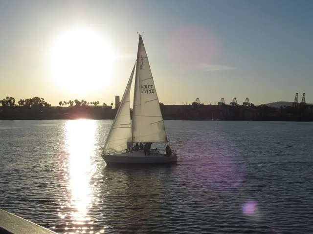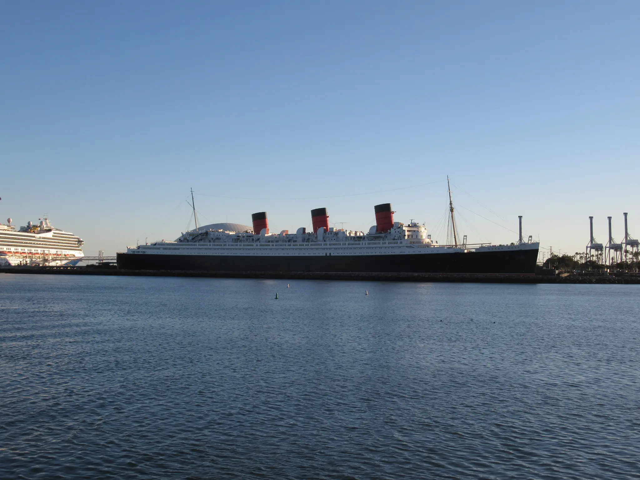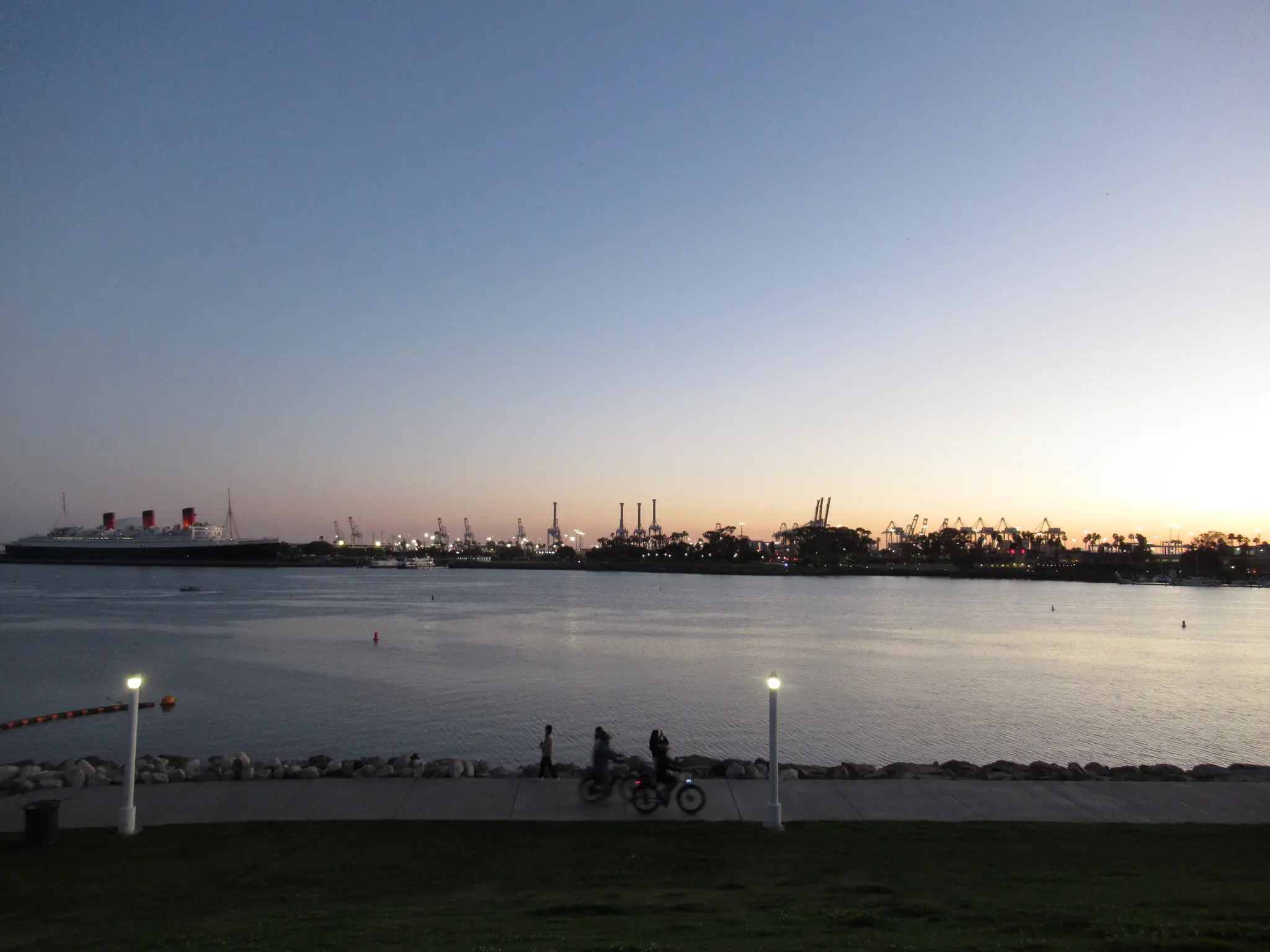 The sailboat was nice with the sun setting. Queen Mary with the terminal dome, Radiance, Travis, and port cranes.