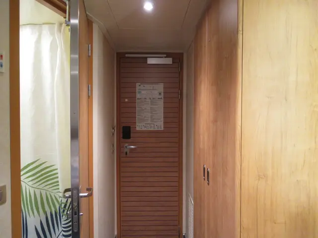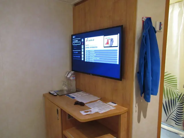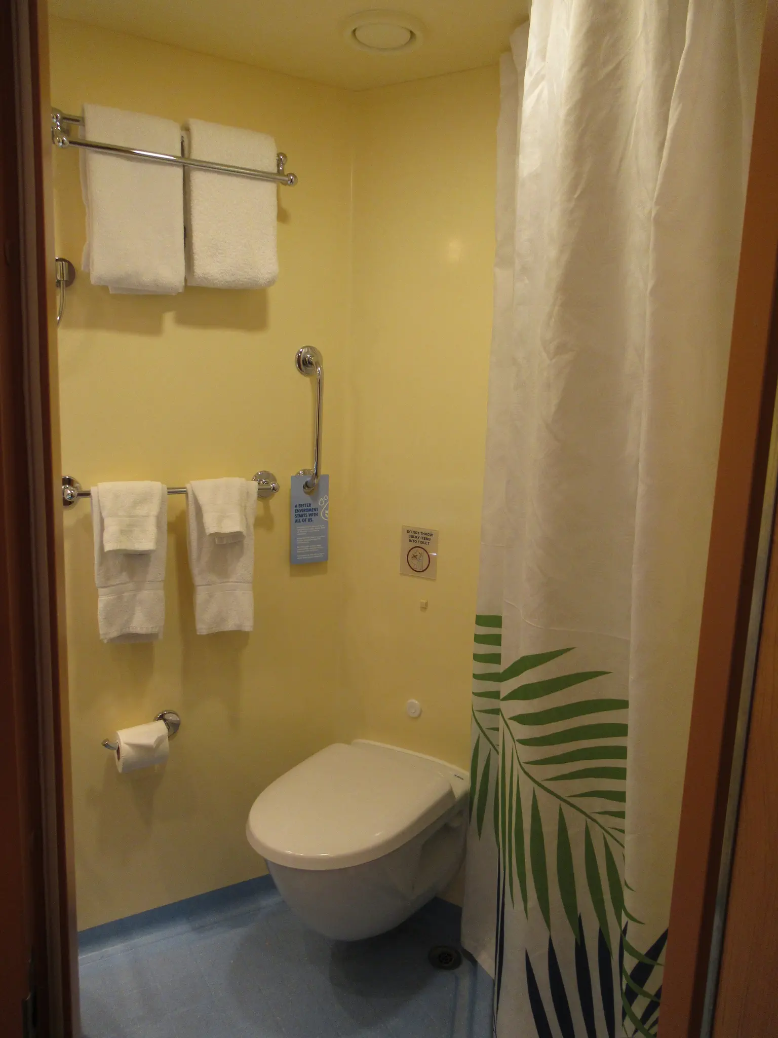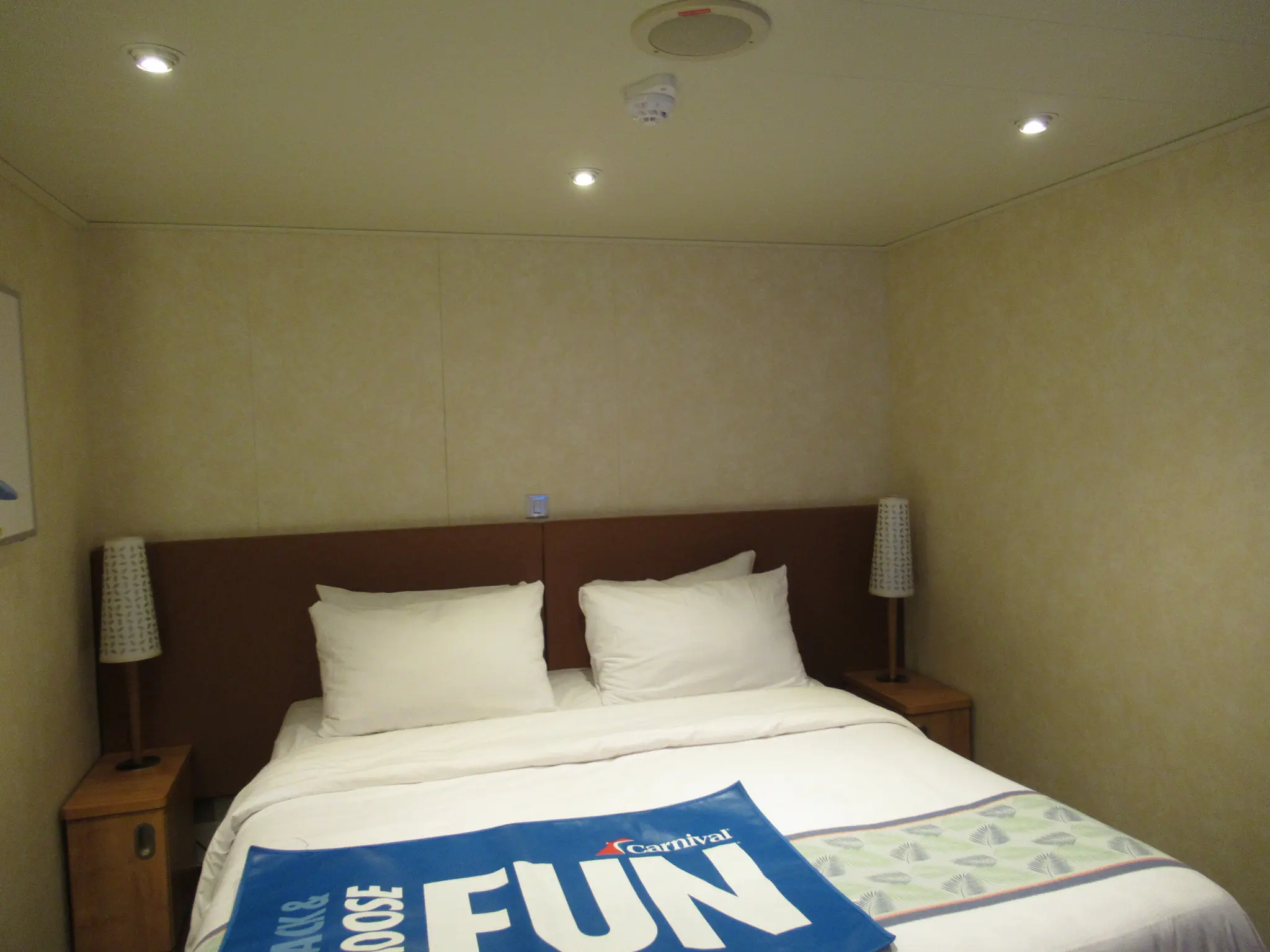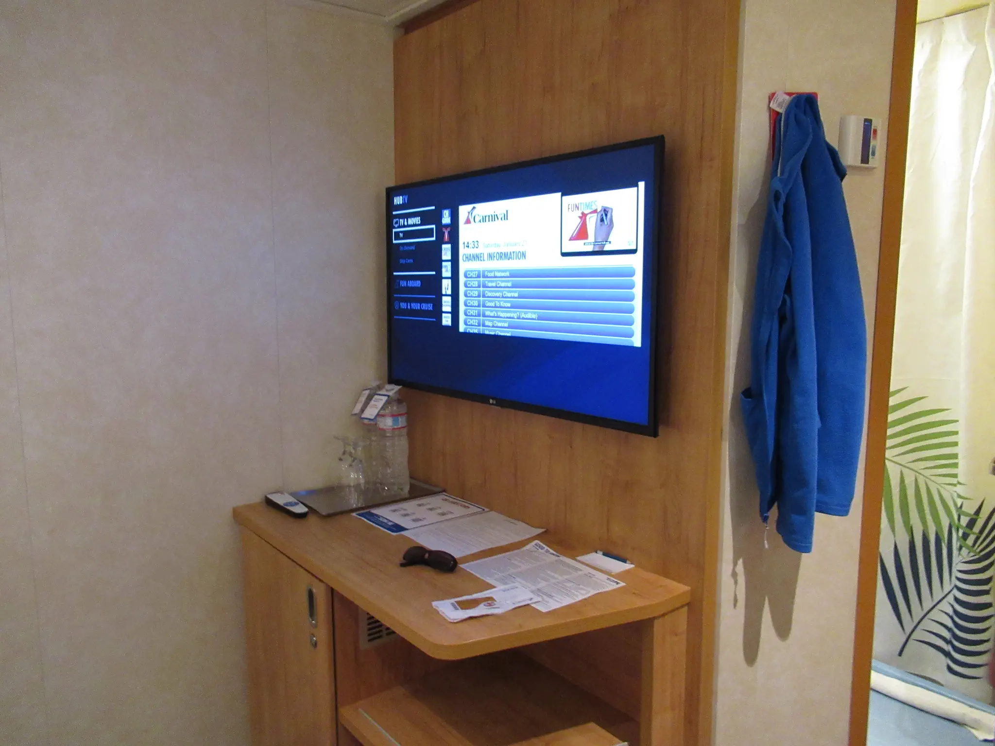 Then our room was ready. When they were supposed to be boarding us in the terminal, they were announcing that rooms would be ready after 2:30 pm -- late. We went down 2 minutes early, and it was ready with our Sign & Sail cards on the room number "mailbox" slot. It took awhile for our luggage to come. With luggage delivery, the mid-ship elevators were closed. I'm not good at stairs. I try, but we were on deck 1, so that's a log of decks. We did 10 once and 14 the next time -- that's a lot of stairs! The room was good, and our room steward, Rodrigo, was awesome. He stopped by and asked what we needed the first day and delivered it flawlessly the entire cruise. We had our ice bucket filled once a day, always had my extra hair towel, and a towel animal each day. He kept our room perfectly clean. He always greeted/talked to us in the hall. (Yes, this made it into the Carnival survey!) I don't have a desk area picture, but we also had a desk area with a mirror with lights all around for getting ready. It had 2 USBs, 2 US plugs, and 1 European plug. The shower looked small, but I did not have any complains using it -- the shower curtain did not cling or attach itself to you while showering. Our closet was a bit small, and crammed full hangers. I took some down and set them at the bottom of the closet. The extras were normal plastic hanger, not all the cruise line's wood ones, so someone brought and left extras. There were plenty of shelves and drawers. We had an empty mini-fridge (I heard it was just officially a cooler, but our sodas were plenty cold or really we added ice anyway) under the TV. The switch above the bed turned all room lights off; it is high enough not to accidentally bump it in the middle of the night.