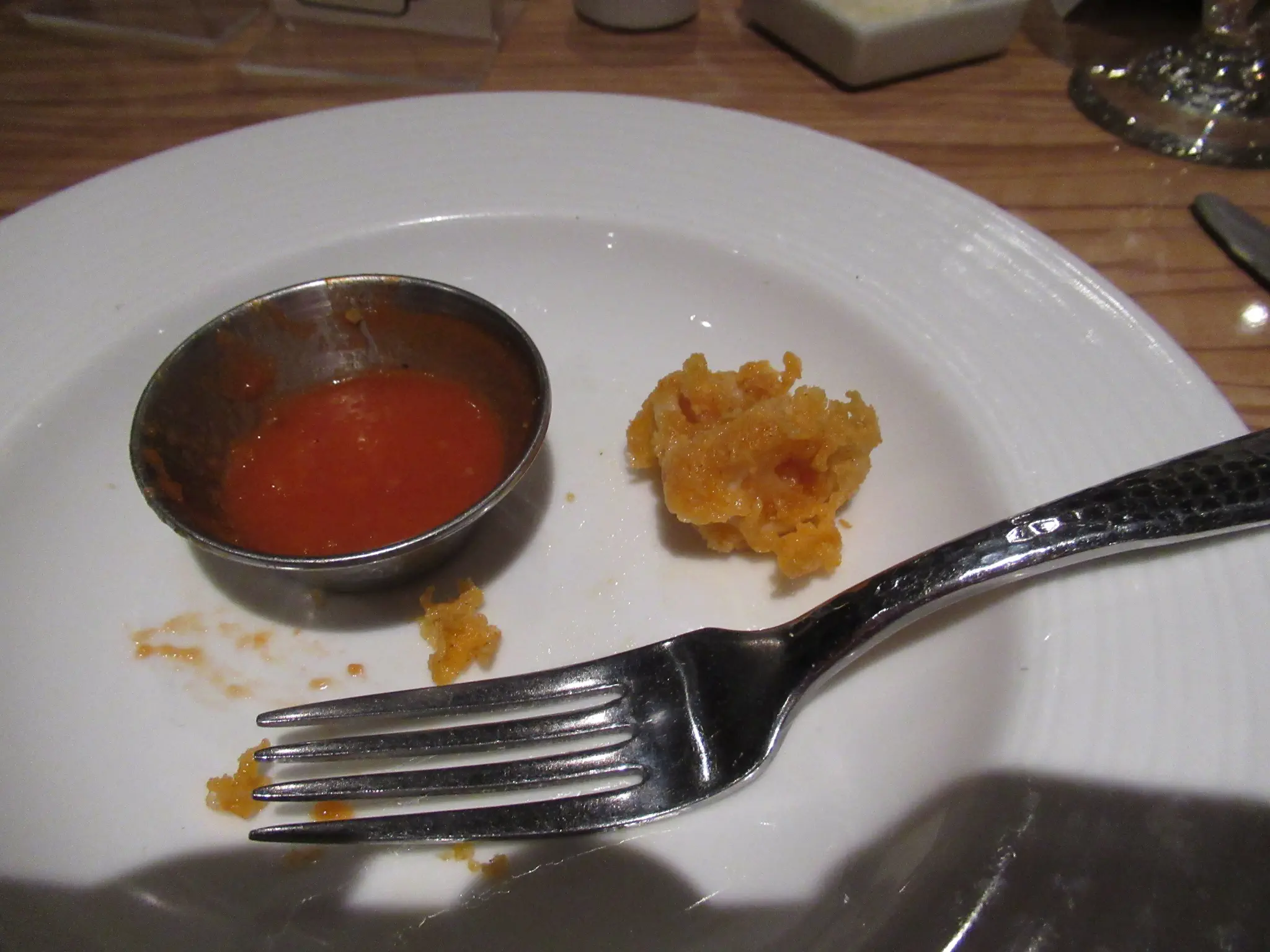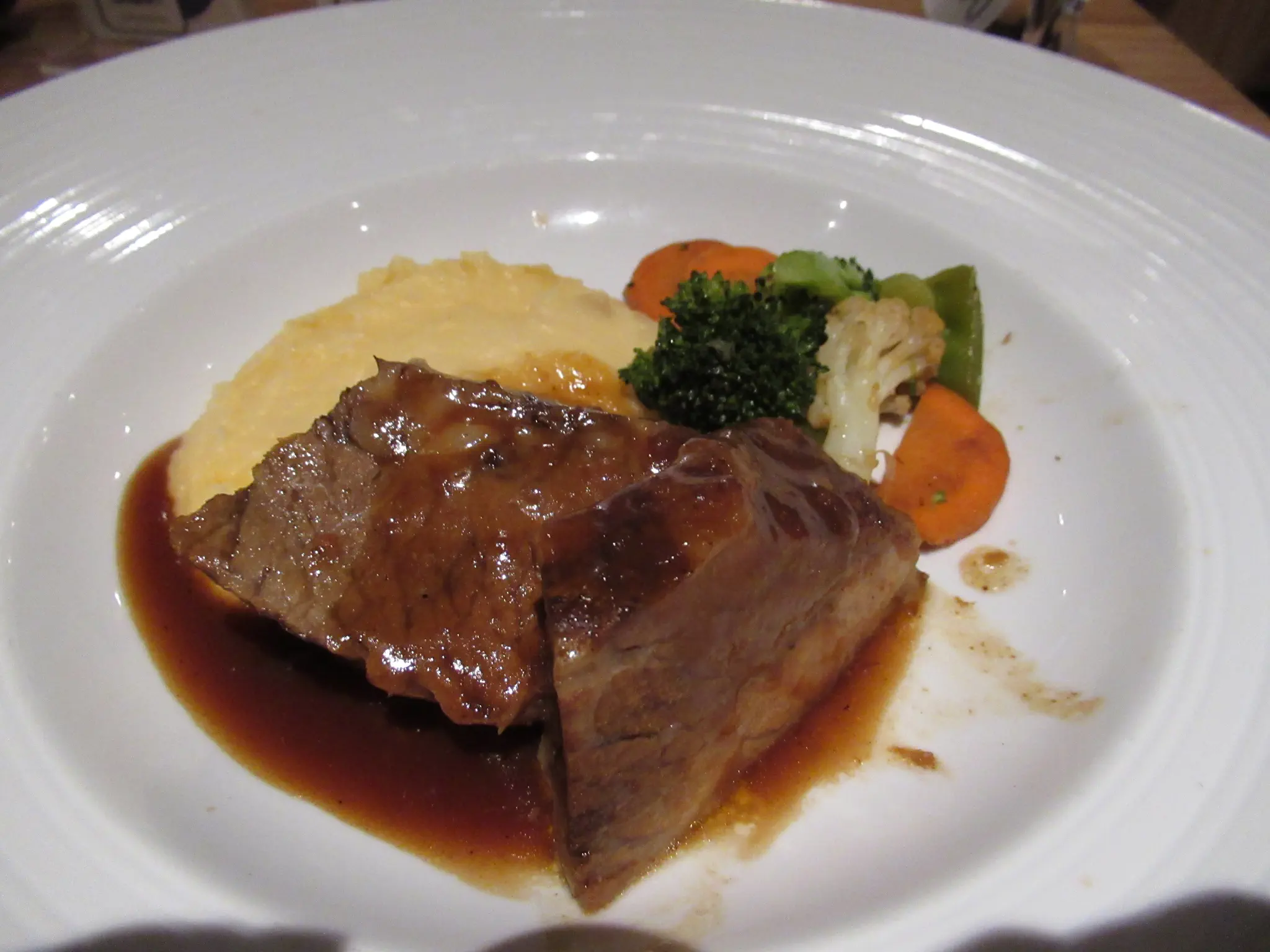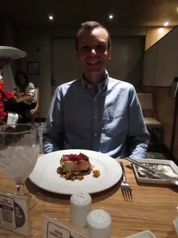 Travis had cocktail shrimp, strawberry soup, mahi mahi, and tiramisu (though it was not as good as it has been before). I had calamari (very good), brisket (very good) with potato mash (not so good), and Carnival melting cake (always very good). I was surprised that they only had 1 or 2 different daily dessert with the daily usuals -- cheese plate, fruit plate, Carnival melting cake, and ice cream. They still had a longer selection of appetizers.