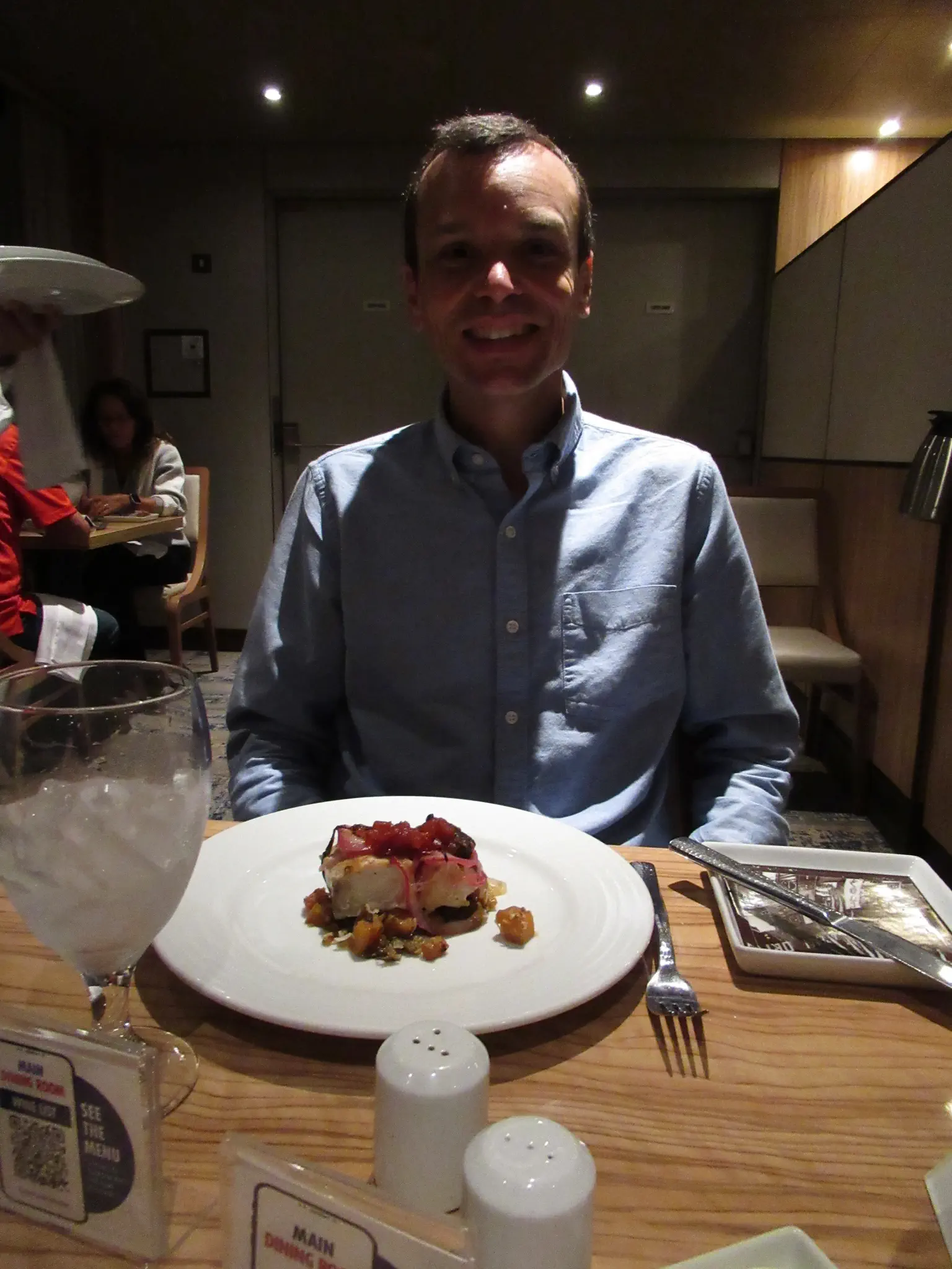 Of course, even though we just ate, we had to go check out the buffet. Travis tried the gelato. Gelato is supposed to be dense, but it was like soft serve. Maybe, being the first day, the machine could not keep up with freezing it. I never found a flavor that I liked and wanted to try, but did not remember to look everyday. Travis tried coffee, mango, and raspberry. They always had chocolate chip cookies and very good cakes (though lines with only two cake stations, though 4,300 people on the ship). Cakes and lunch buffet were only open for lunch until 2:30 pm. I never saw all buffet stations open, and food choices were repeated at different stations. So, the options were more limited than desired, and the buffet did not seem big enough to handle 4,300.