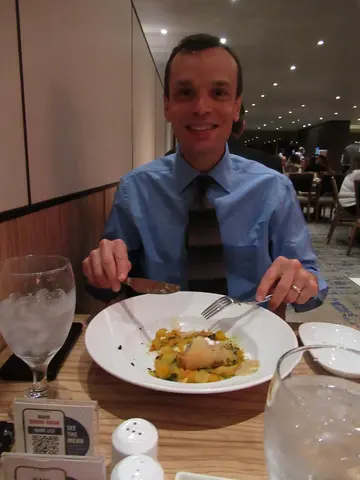 Tonight was elegant night, with the fancy food. Travis had pumpkin soup, spinach pie in phyllo (lunch repeat), and a fruit plate. I had Caesar salad, filet mignon, and the Carnival melting cake.