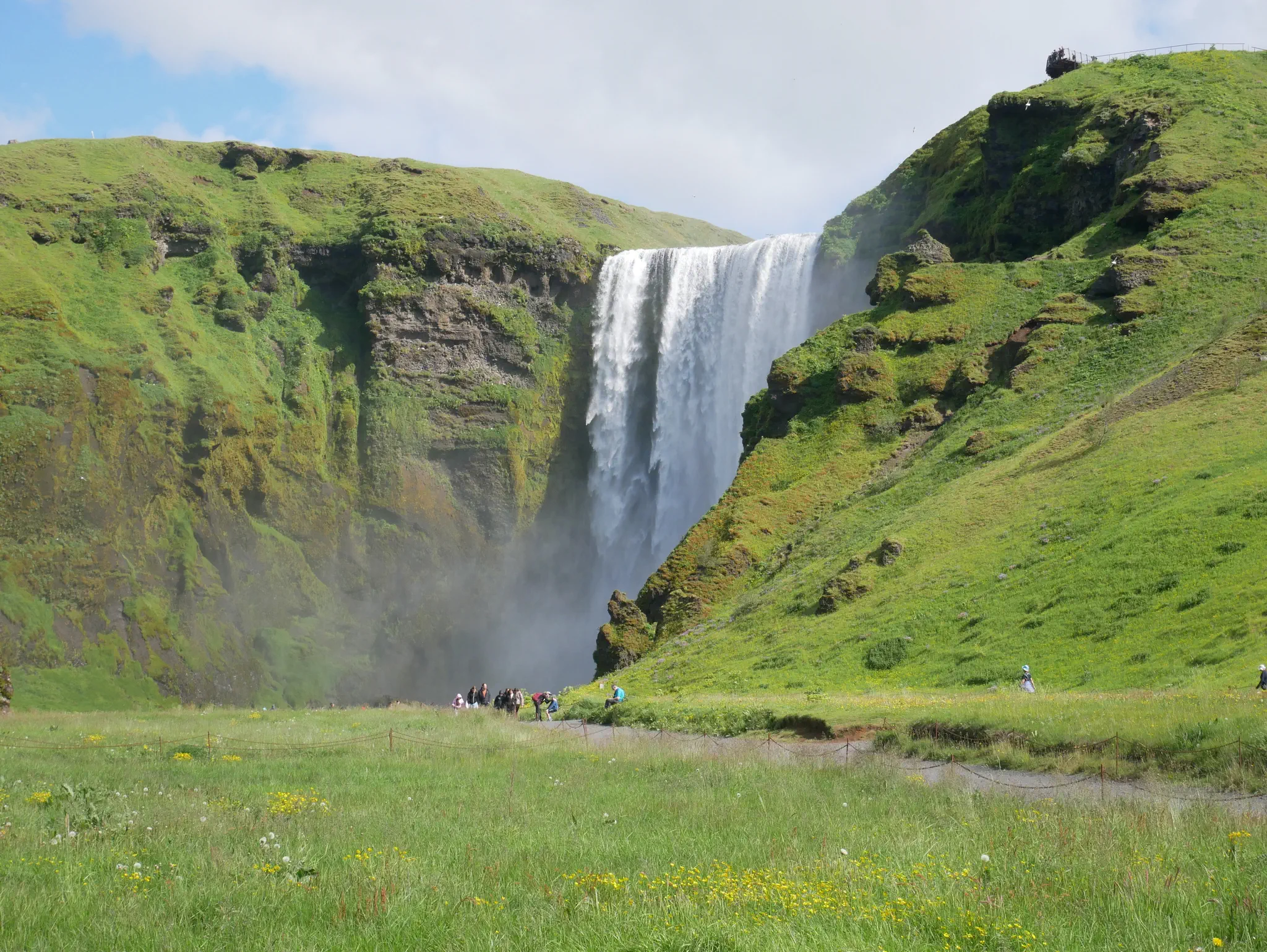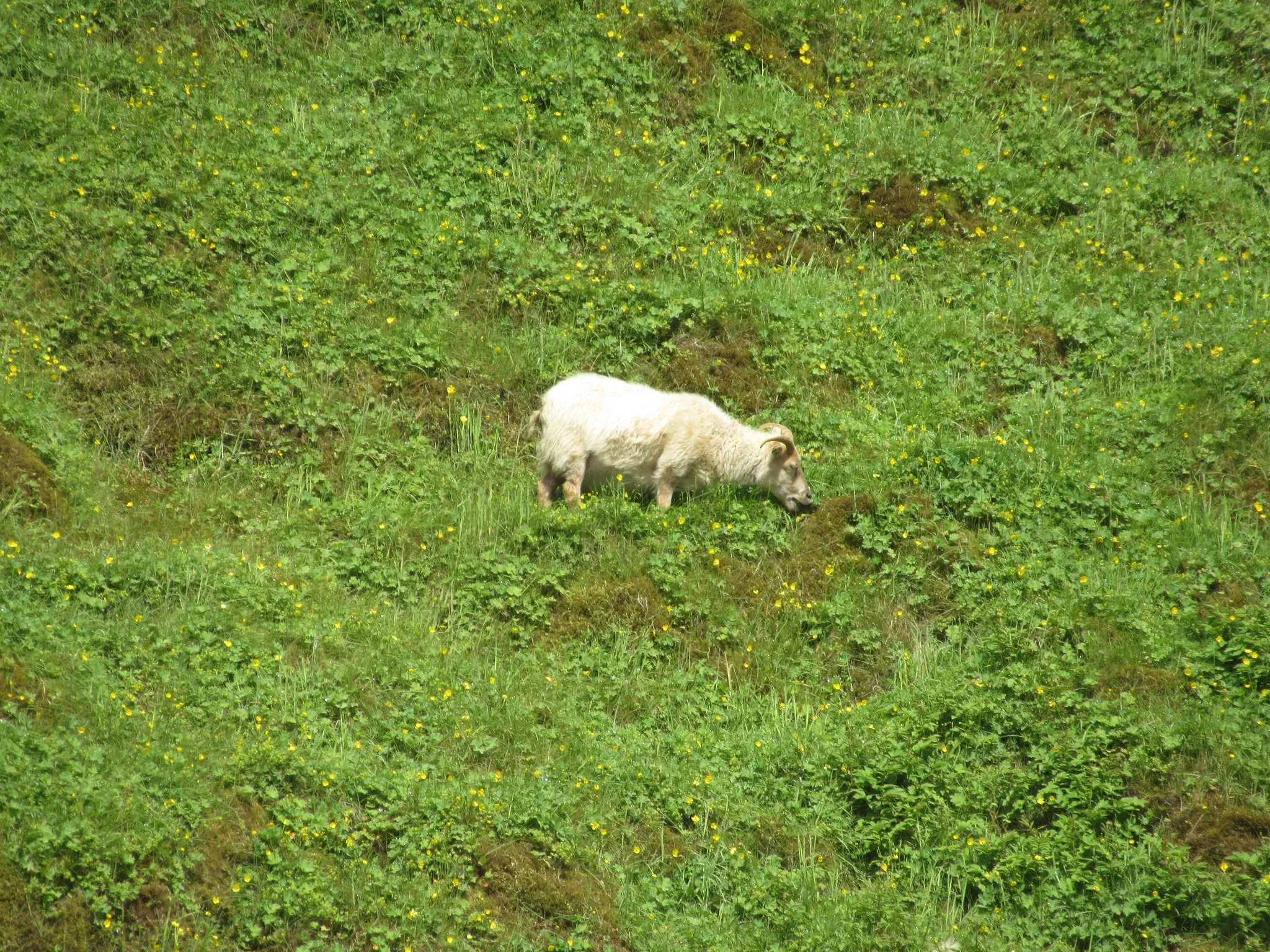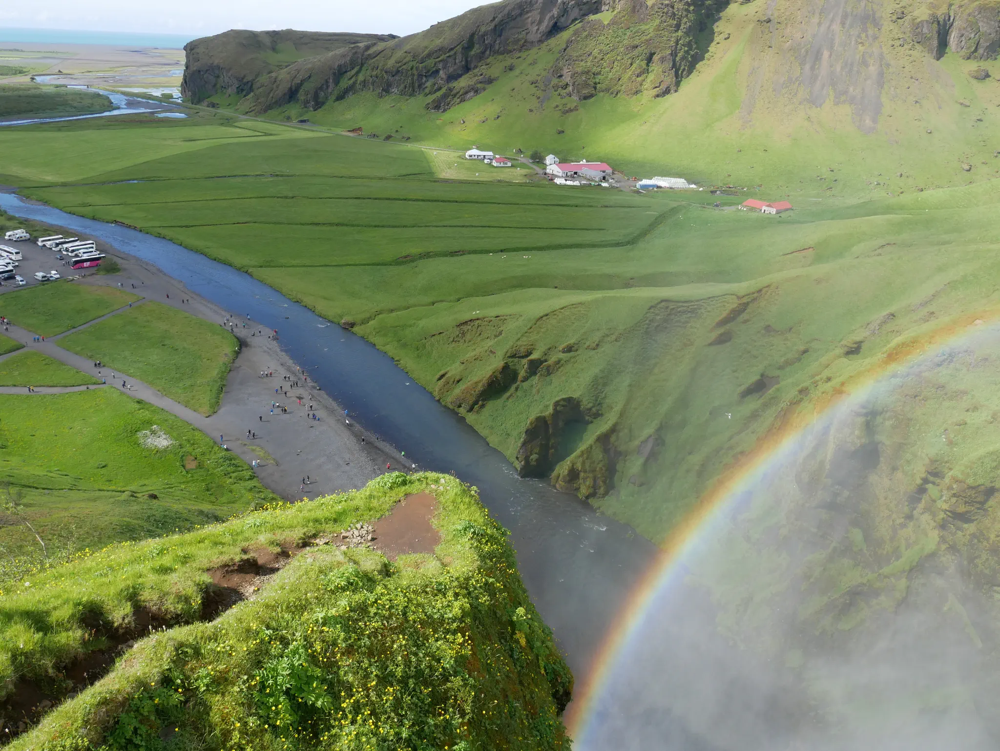 We arrived at Skógafoss. Foss means waterfall. A small introduction fall before the big one. We went up the steps to the top. The sheep liked to be on the slanting side of the mountain; the grass is always greener on the precarious side of a mountain.