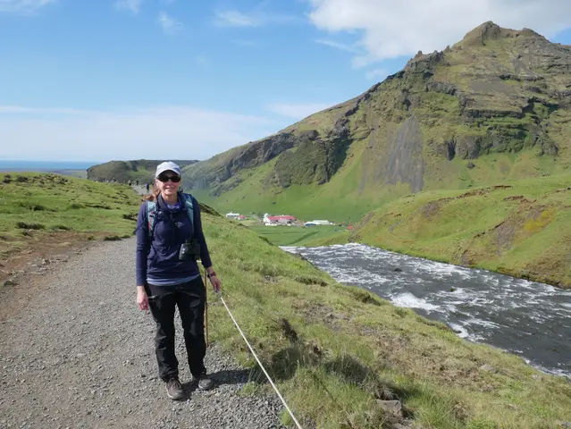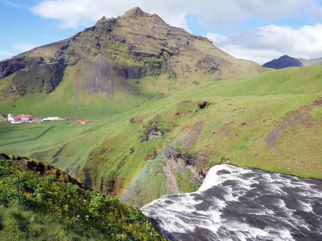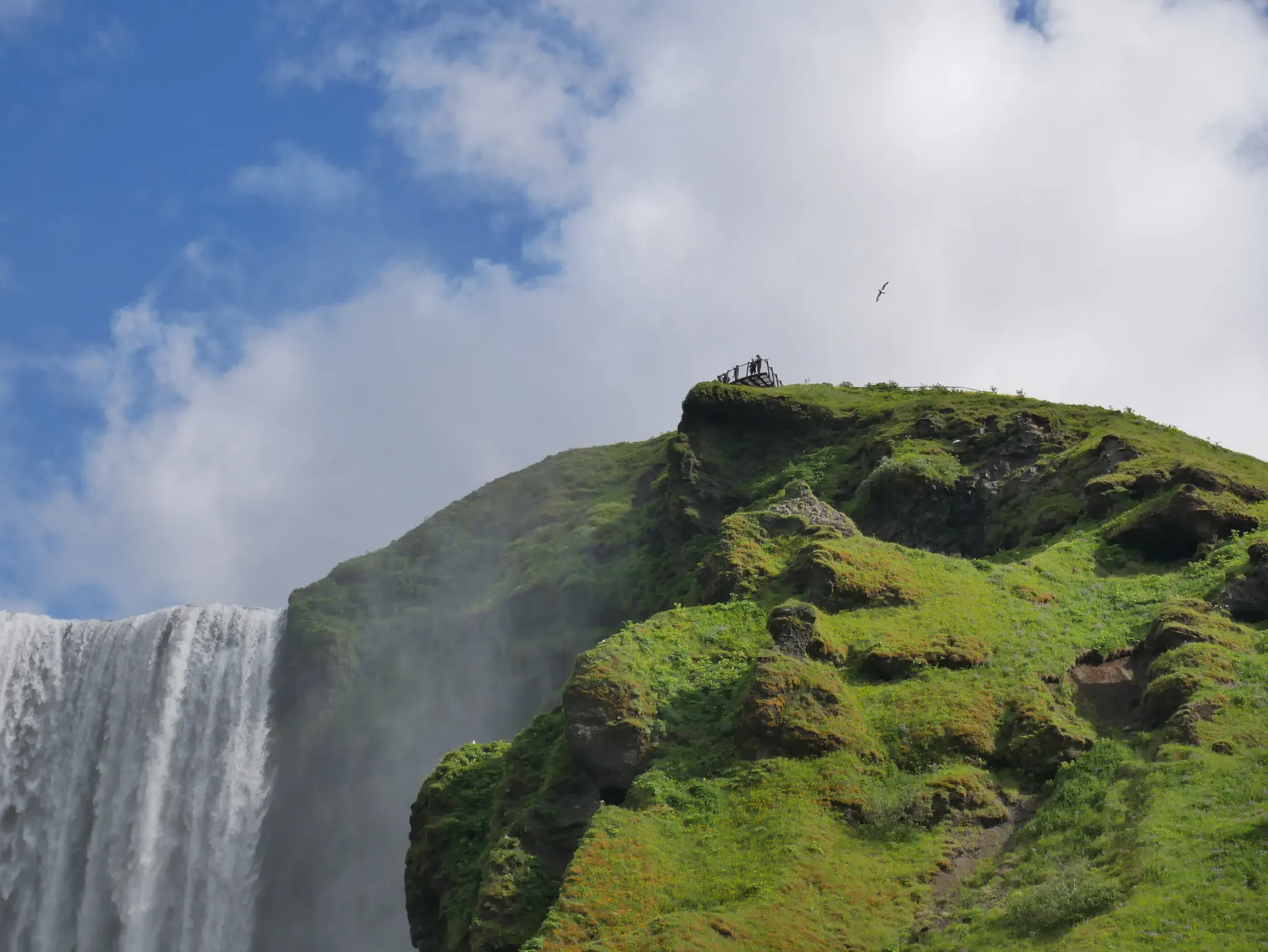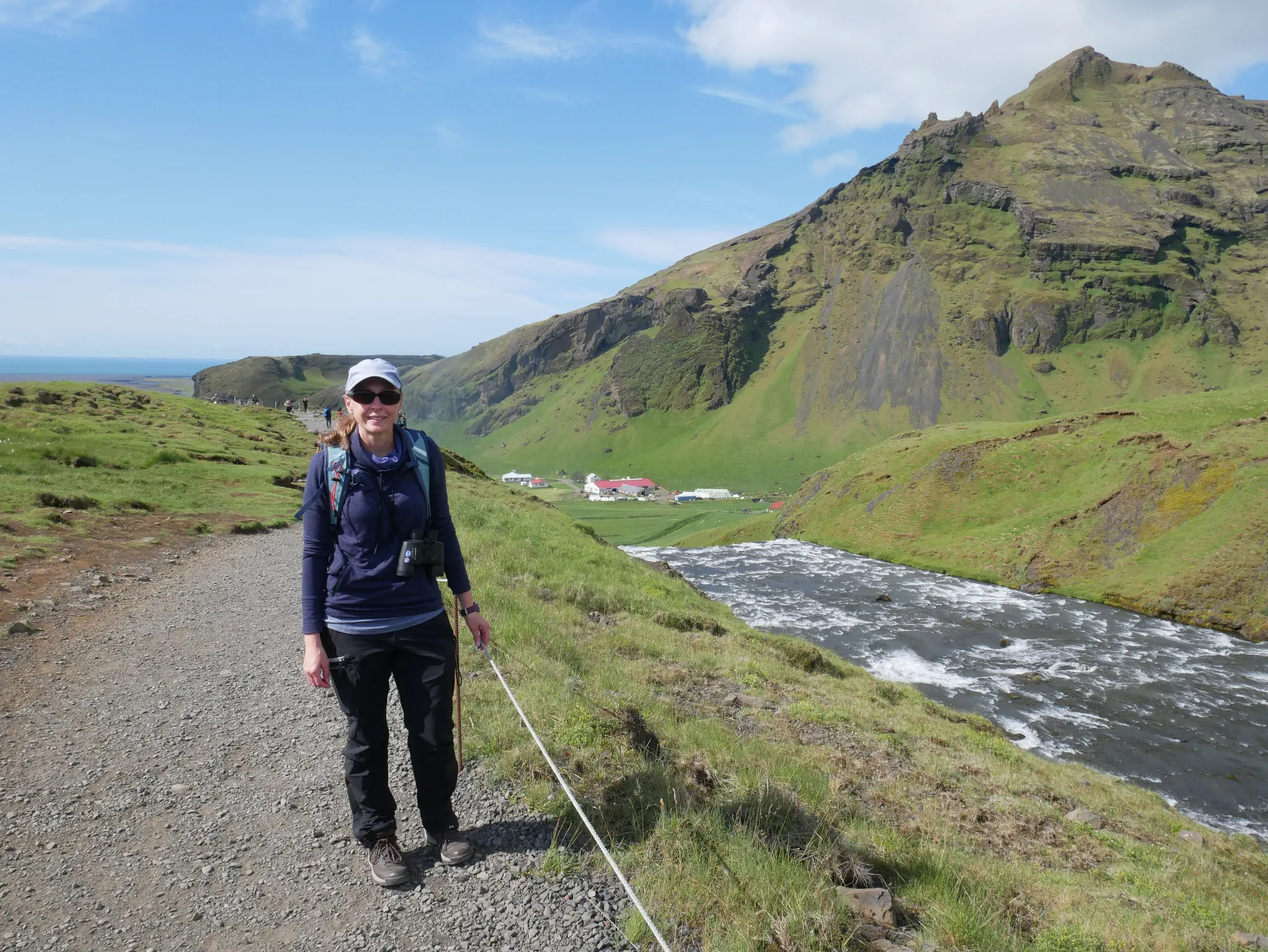 We arrived at Skógafoss. Foss means waterfall. A small introduction fall before the big one. We went up the steps to the top. The sheep liked to be on the slanting side of the mountain; the grass is always greener on the precarious side of a mountain.
