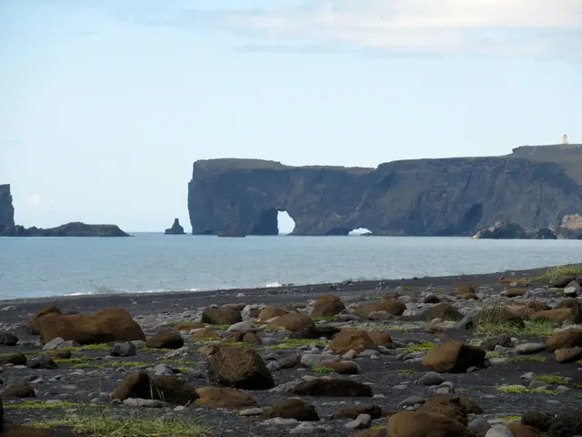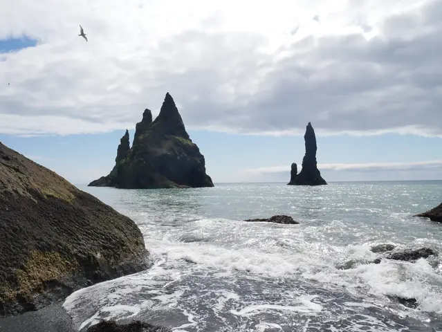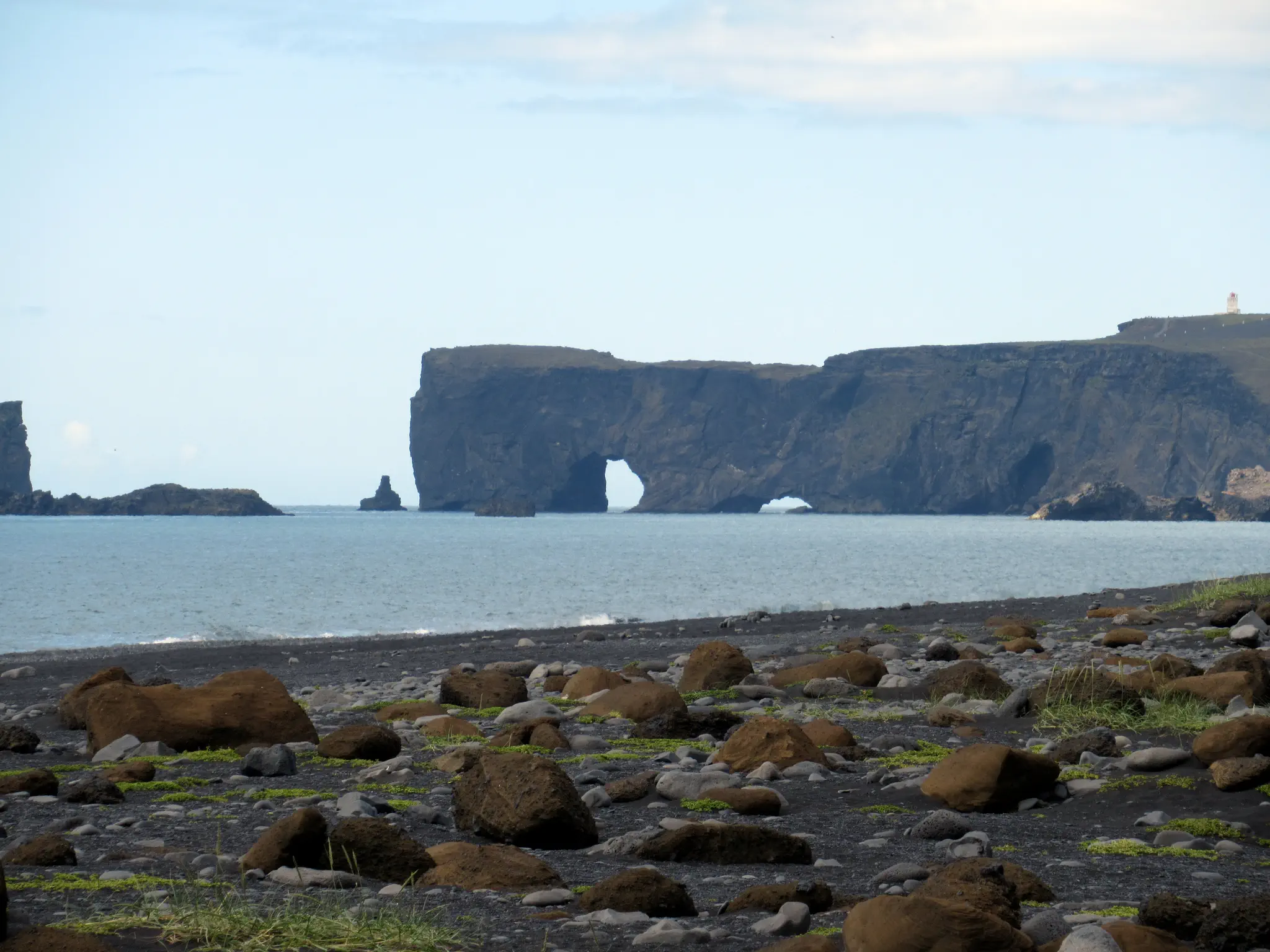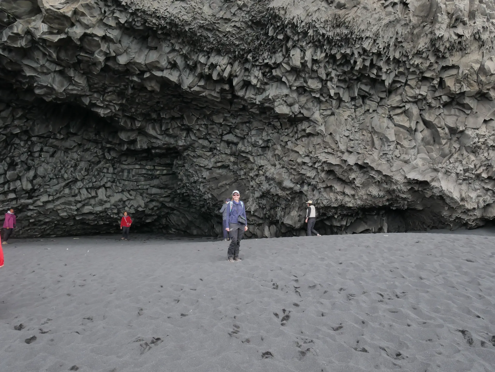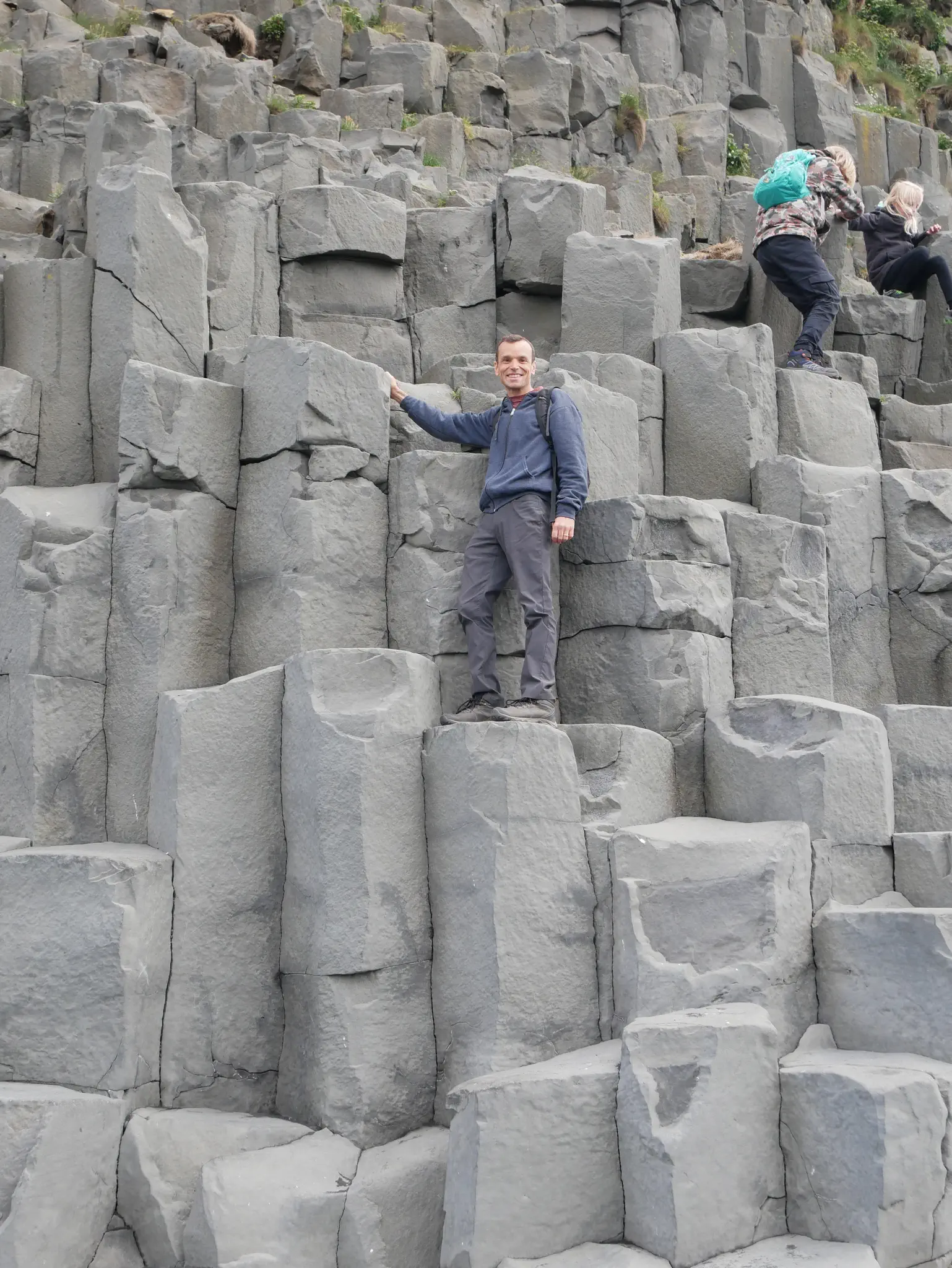 Earlier we got a restroom break (complimentary restrooms) at a gas station and could get lunch for a picnic at the black sands beach. We each got a sandwiches. Travis's ended up with too much mayonnaise and mine was roast beef and grilled onions. It was too bready for me, so I did not eat it all. Travis had some since it had no mayo. We arrived at the black sand beach near the town of Vik. We sat on the rocks for our picnic; this was our view. Then Travis climbed the basalt column, formed from the lava solidifying.