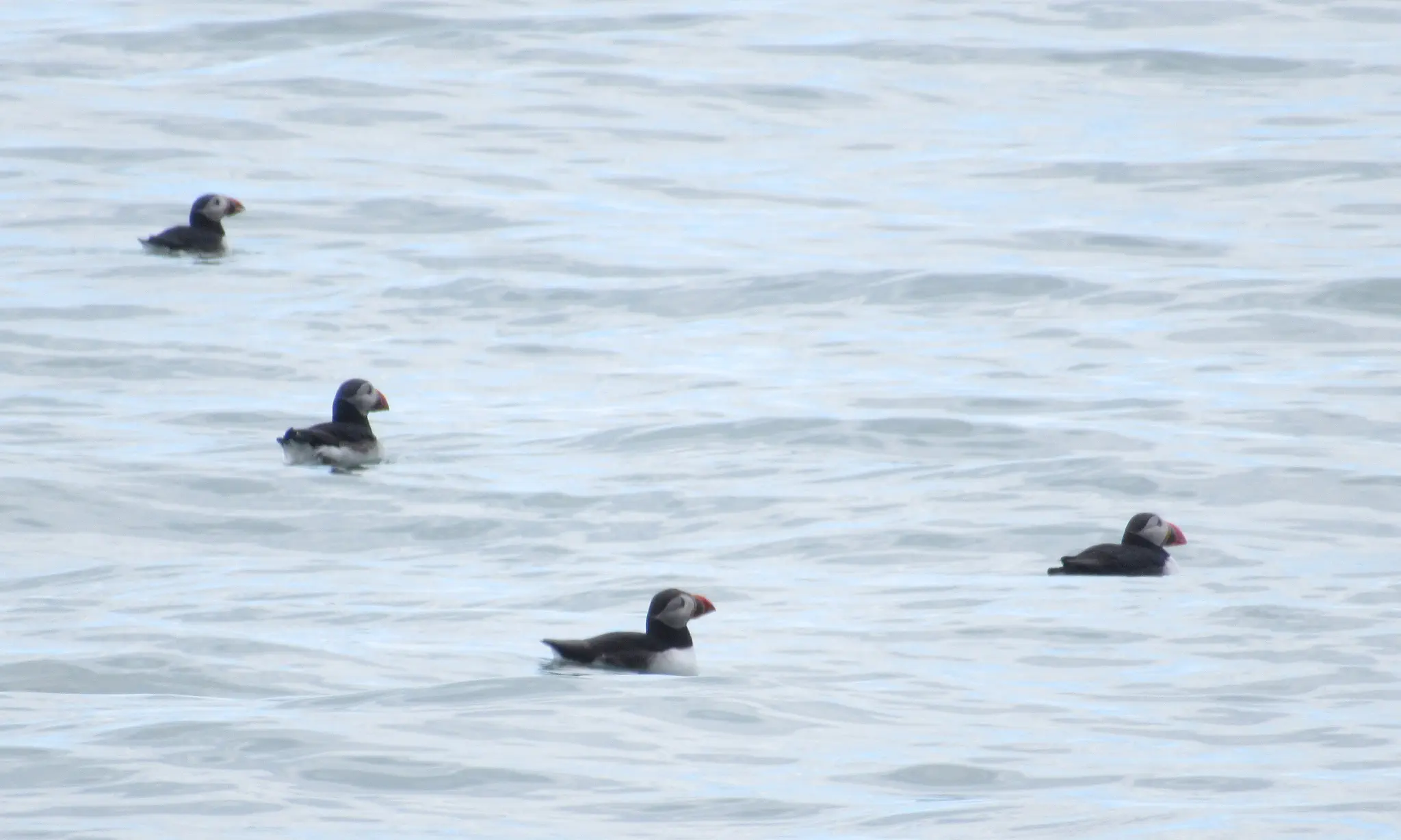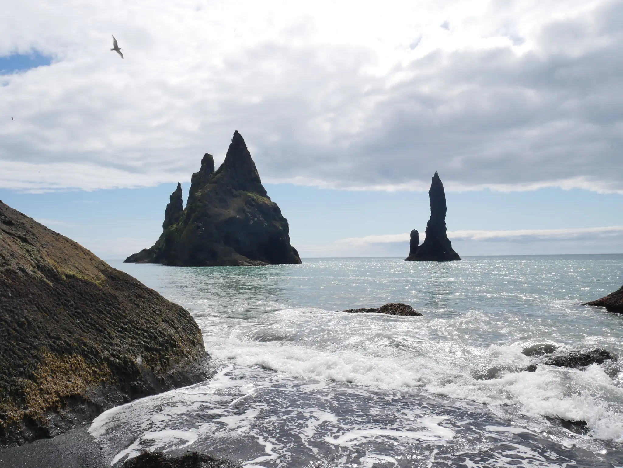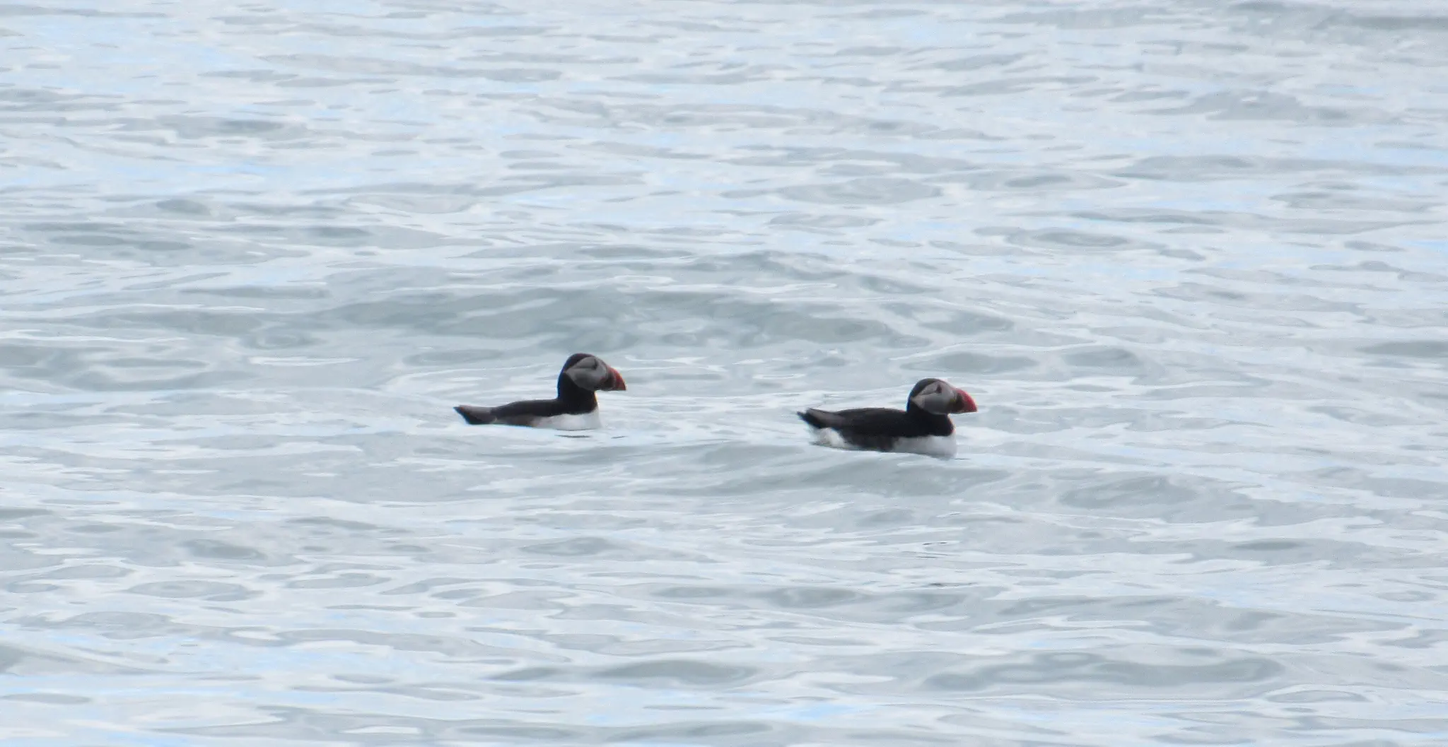 We continued around the basalt columns to find this cool cave and birds flying around the water mountains :). Then seeing something in the water, I got out the binoculars. I found puffin! They were cute, and it was fun to watch them fly and land in the water. Someone on our tour found one nesting in the cliffs above this cave and got a great picture.