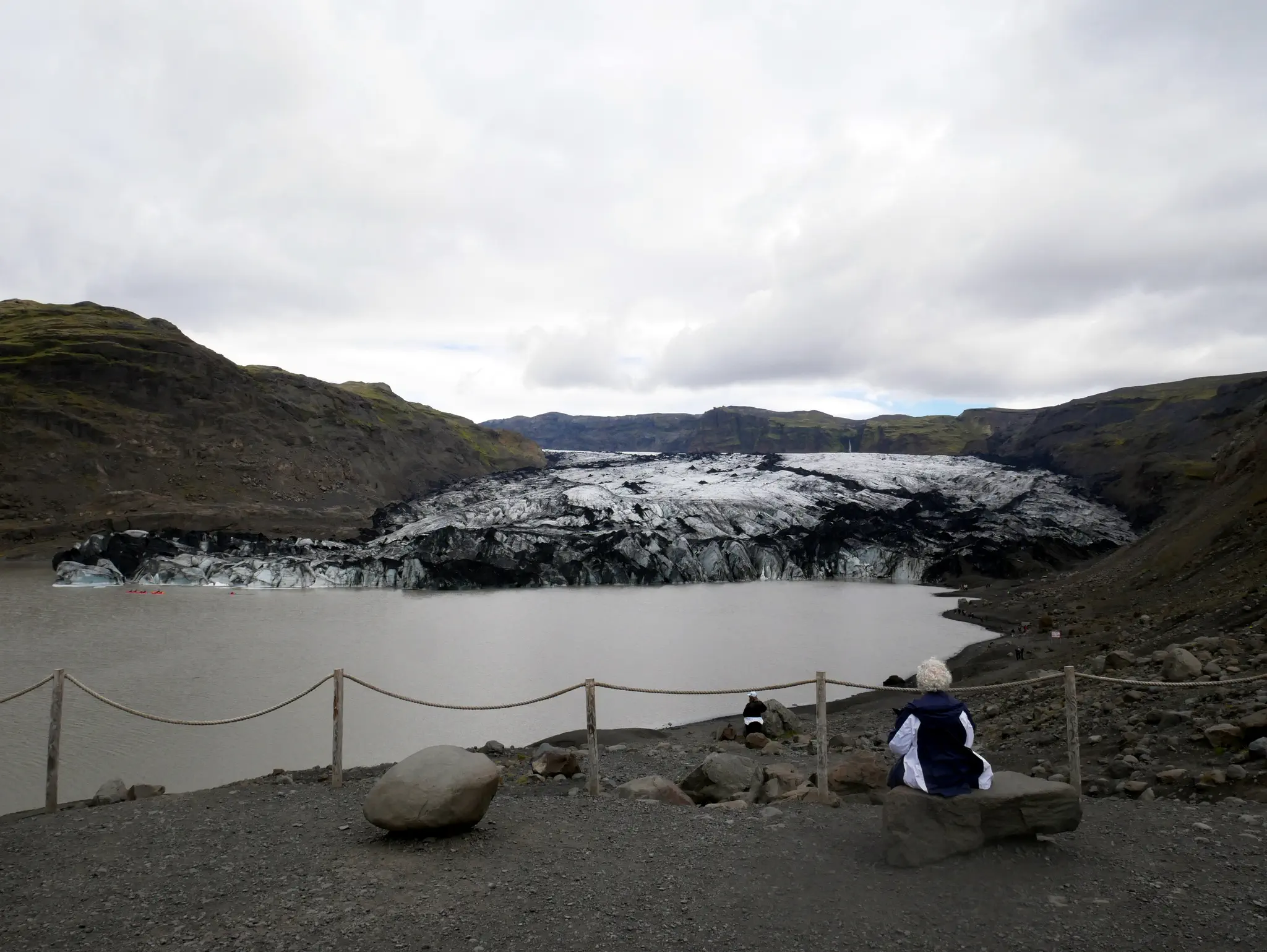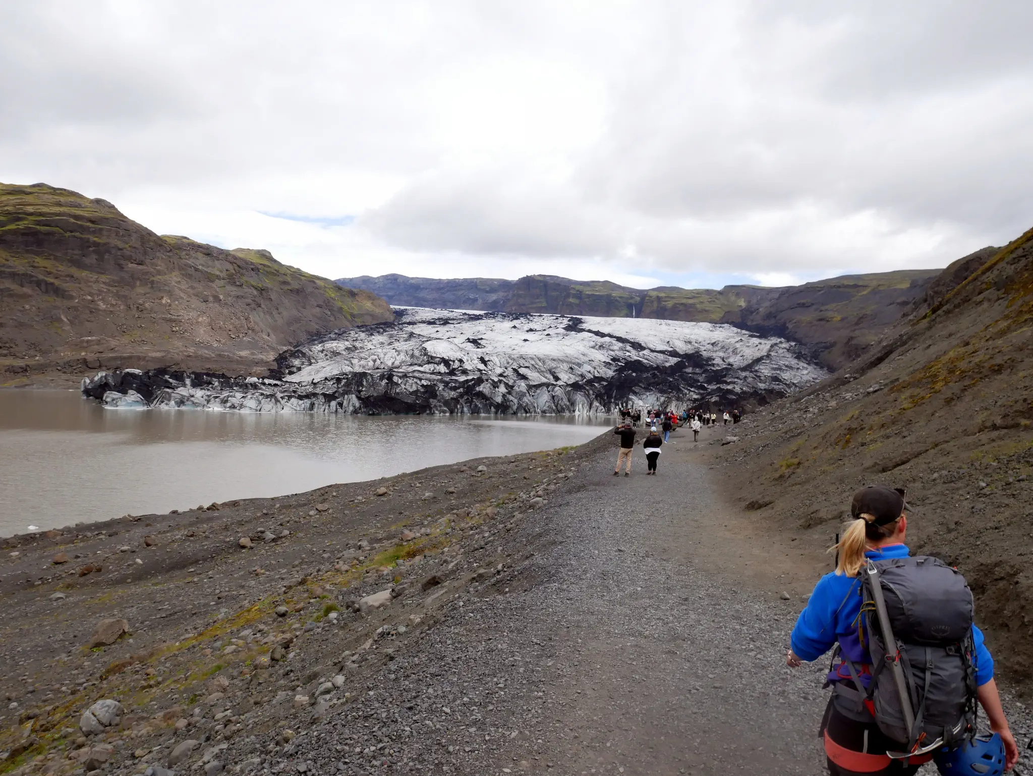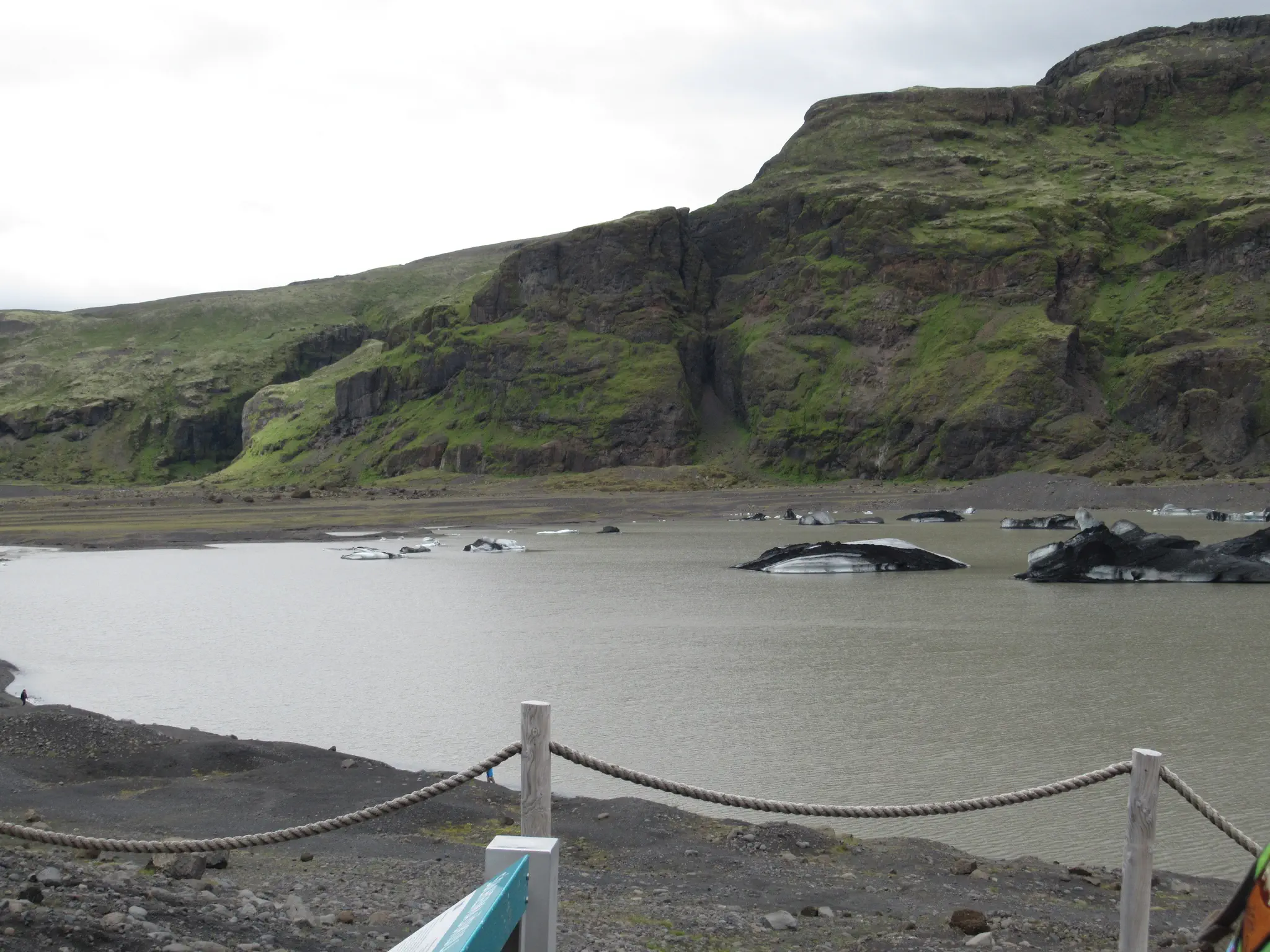 We hiked to this lagoon, which used to be part of the glacier too, and there are icebergs that broke off or calved from the glacier in the lagoon. You will quickly see that glaciers in Iceland are unique; they have glacier ice and volcanic ash combined. Here we learned how to put our crampons. We had a glacier specific tour guide, and our full day tour guide did come to here to help with the crampons before setting us lose on the glacier. Our glacier guide was awesome; I do not remember her name. She said that not many guides were from Iceland, but that our tour guide was a native Icelander. She was from Germany, and this was her first summer guiding in Iceland. The tour company provided the employees housing and a company car, just to use to get to and from work. She normally guided at the big glacier in Iceland, but with us this day. She was later talking about being required to use ropes to save people, if needed. She had to carry all the rope, which explained her big backpack.