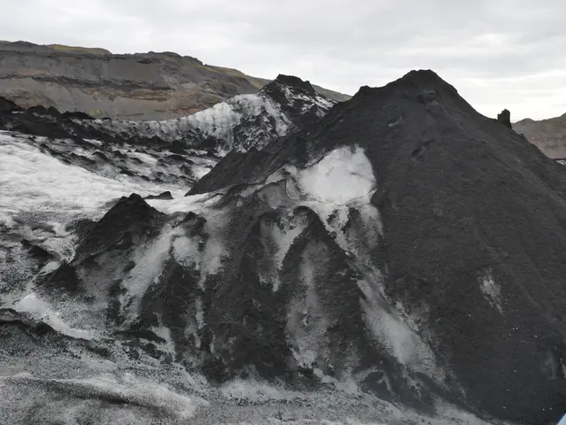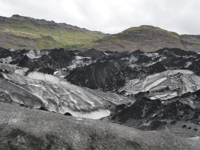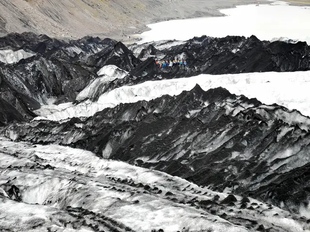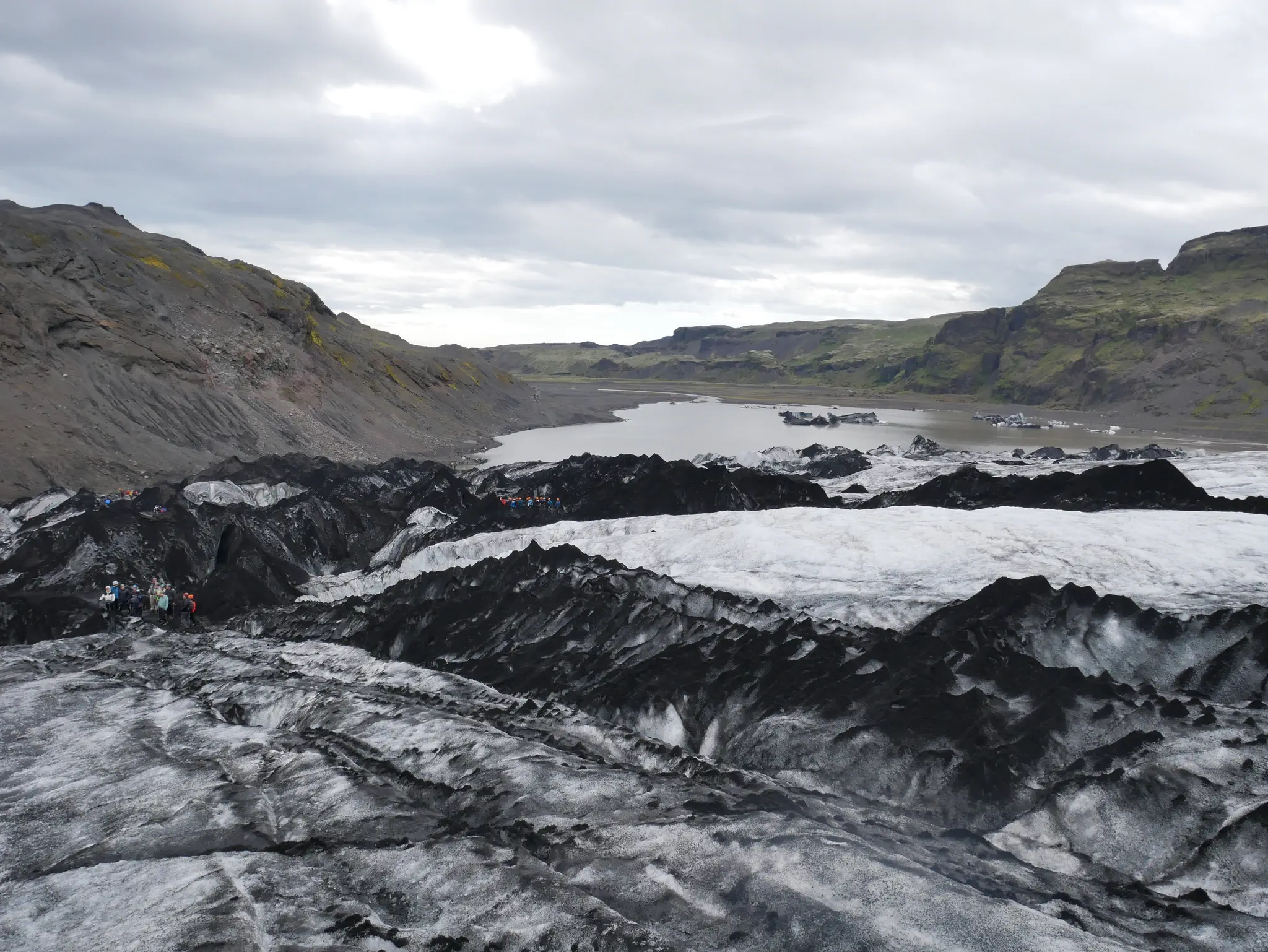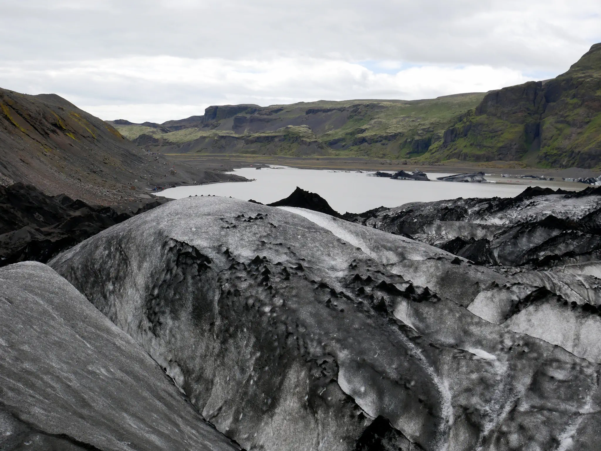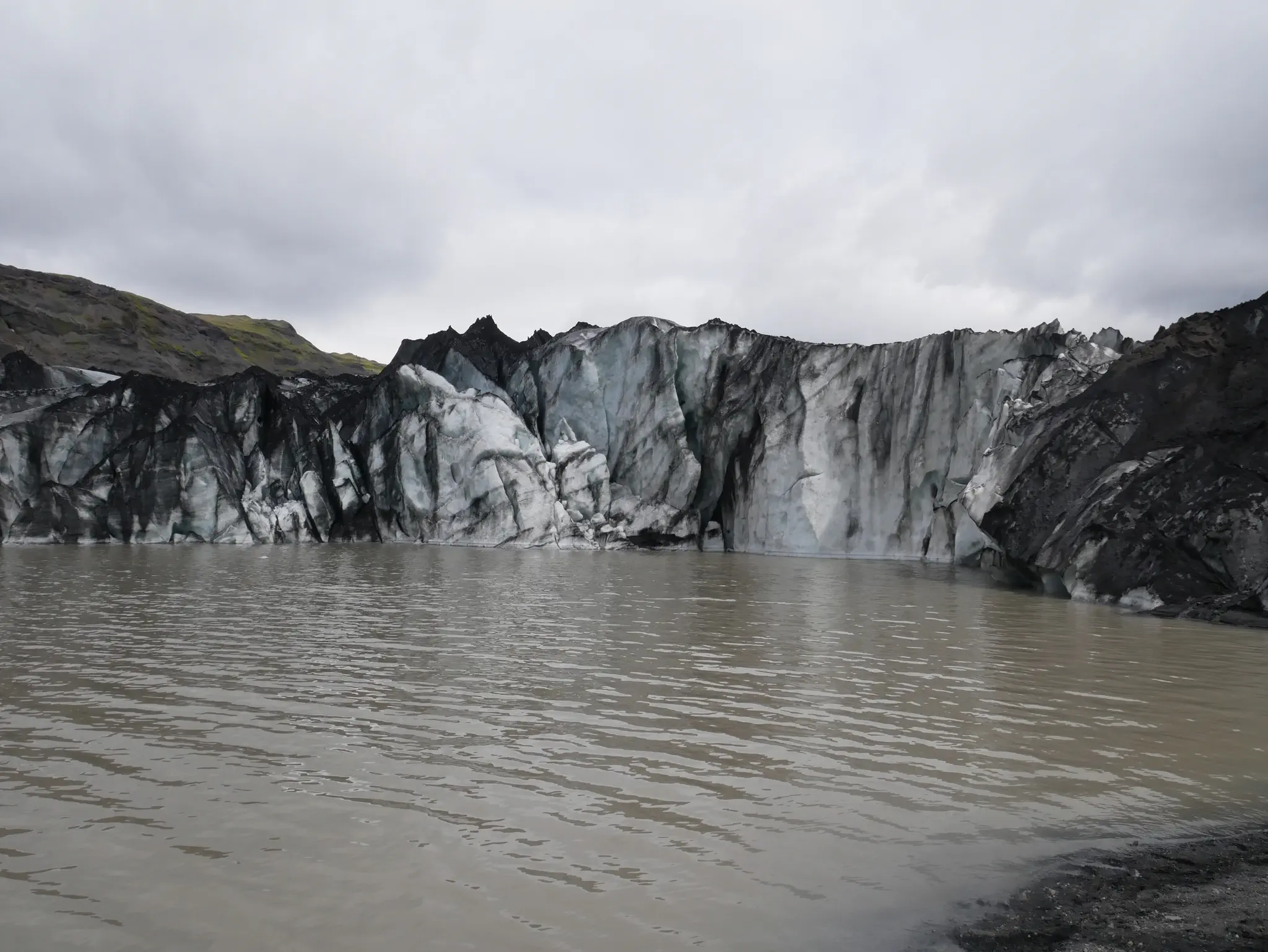 We hiked to this lagoon, which used to be part of the glacier too, and there are icebergs that broke off or calved from the glacier in the lagoon. You will quickly see that glaciers in Iceland are unique; they have glacier ice and volcanic ash combined. Here we learned how to put our crampons. We had a glacier specific tour guide, and our full day tour guide did come to here to help with the crampons before setting us lose on the glacier. Our glacier guide was awesome; I do not remember her name. She said that not many guides were from Iceland, but that our tour guide was a native Icelander. She was from Germany, and this was her first summer guiding in Iceland. The tour company provided the employees housing and a company car, just to use to get to and from work. She normally guided at the big glacier in Iceland, but with us this day. She was later talking about being required to use ropes to save people, if needed. She had to carry all the rope, which explained her big backpack.