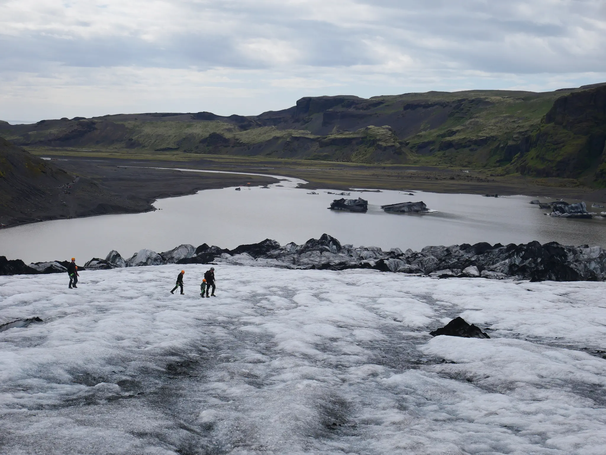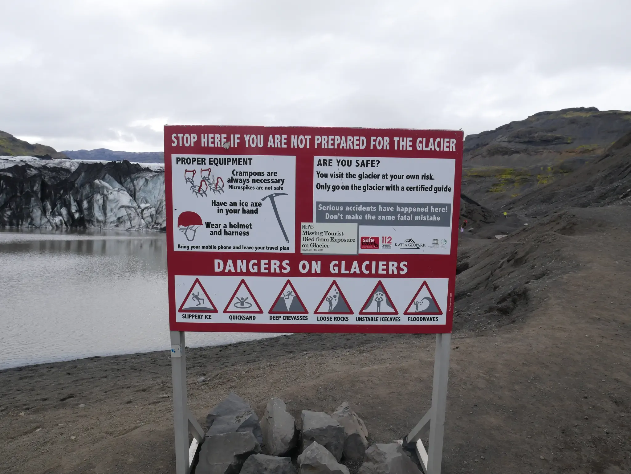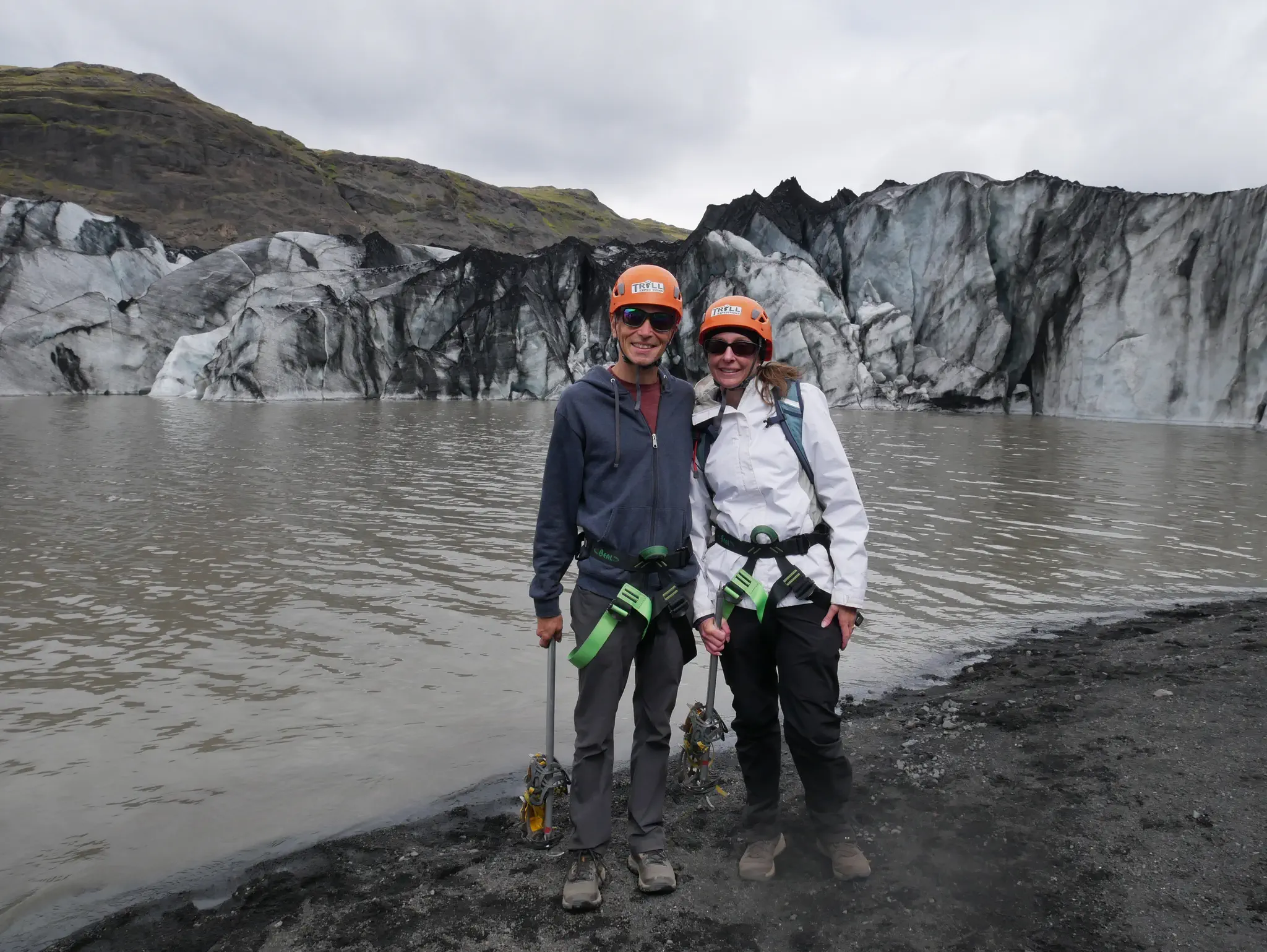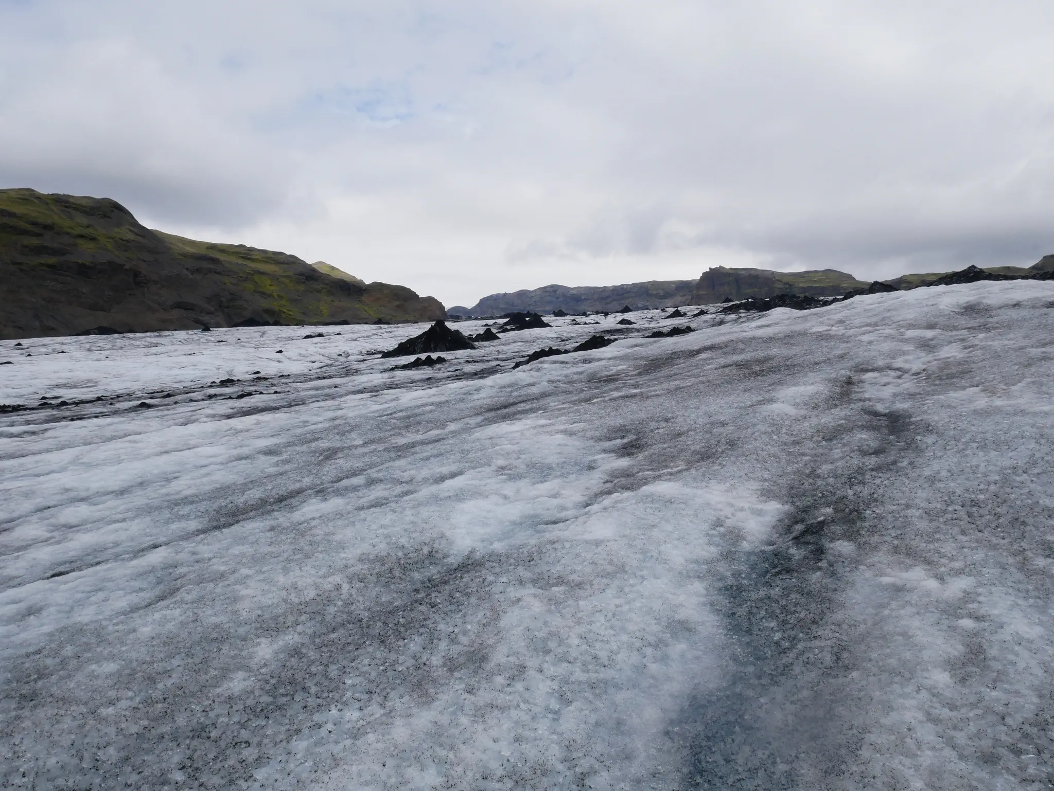 The glacier is called Sólheimajökull Glacier, and this portion was about 3 hours including gearing up, hiking to and from the glacier, and hiking on the glacier. We received a harness, that was just for emergencies or if they needed to pull someone out of somewhere, crampons (not put on yet), ice axe, and helmet. If you did not have good enough hiking boots (and they were not checking for good tread really, just that it looked like a hiking boot), you had to rent theirs for about 10 EUR. A few people in our group did.
