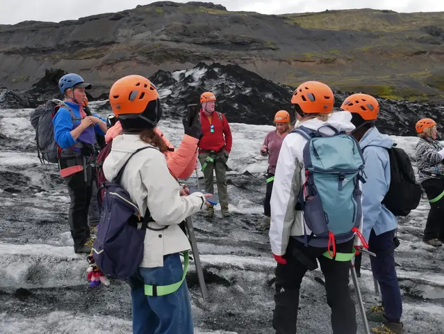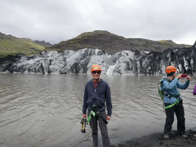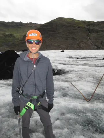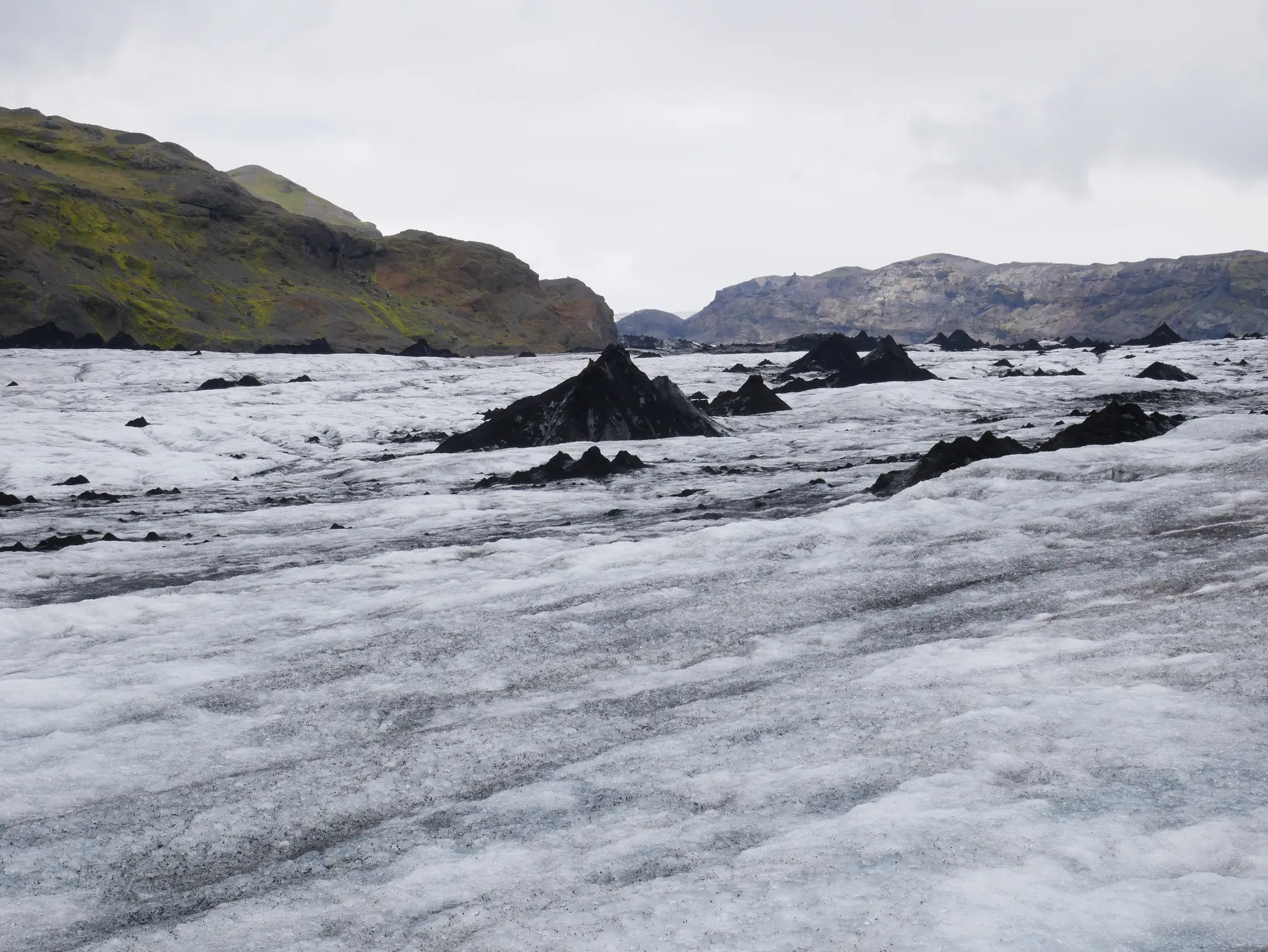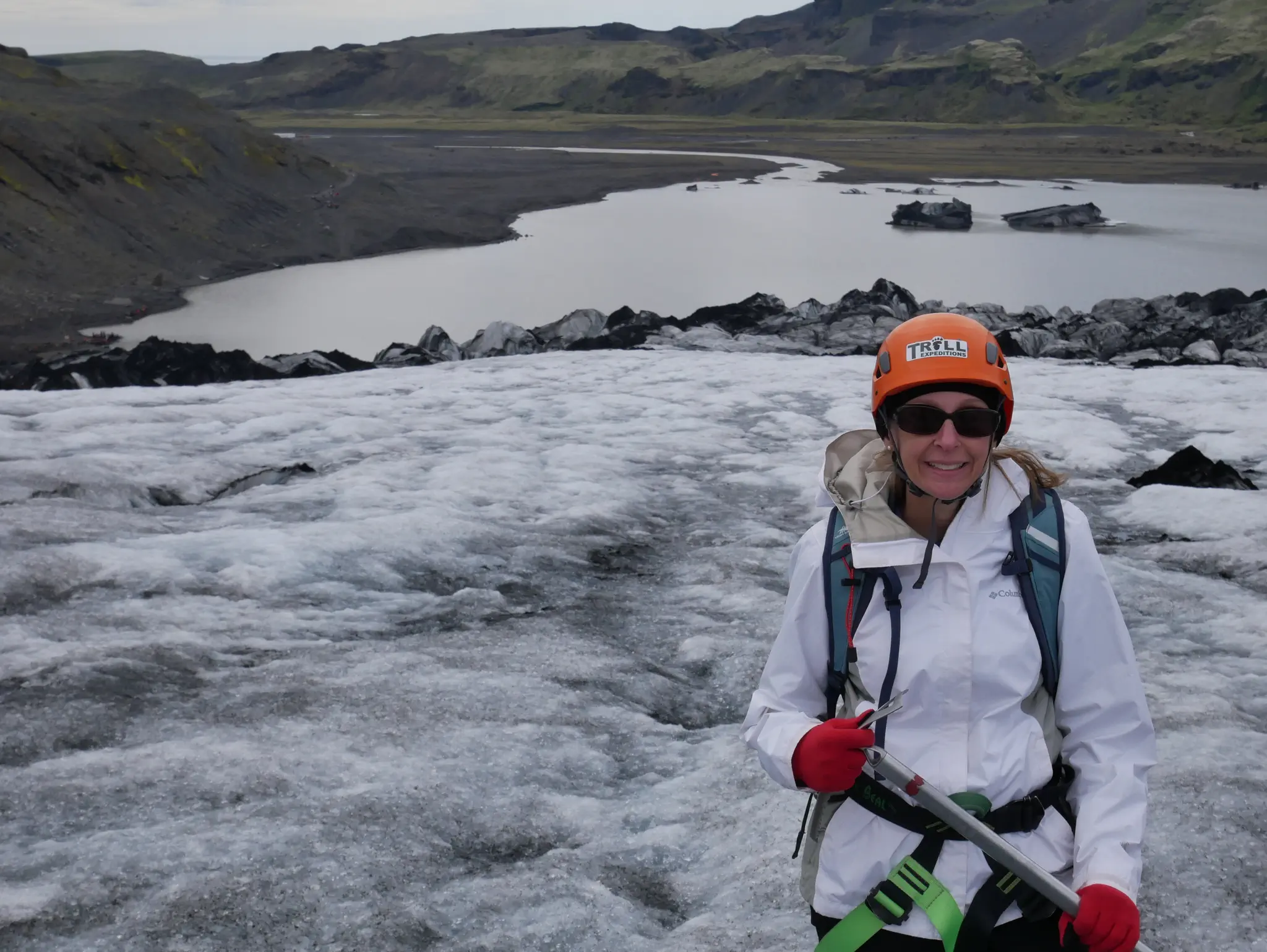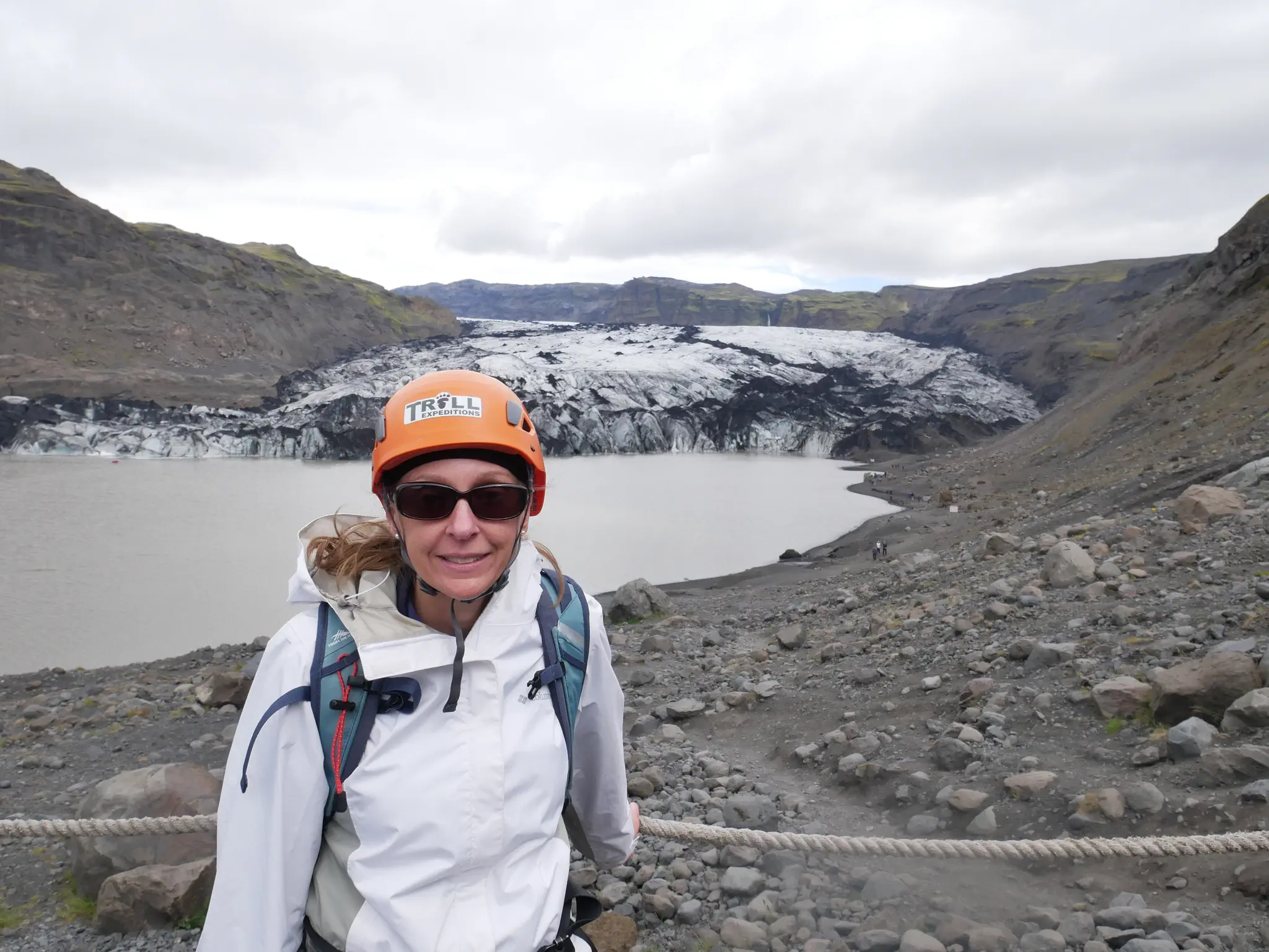The glacier is called Sólheimajökull Glacier, and this portion was about 3 hours including gearing up, hiking to and from the glacier, and hiking on the glacier. We received a harness, that was just for emergencies or if they needed to pull someone out of somewhere, crampons (not put on yet), ice axe, and helmet. If you did not have good enough hiking boots (and they were not checking for good tread really, just that it looked like a hiking boot), you had to rent theirs for about 10 EUR. A few people in our group did.