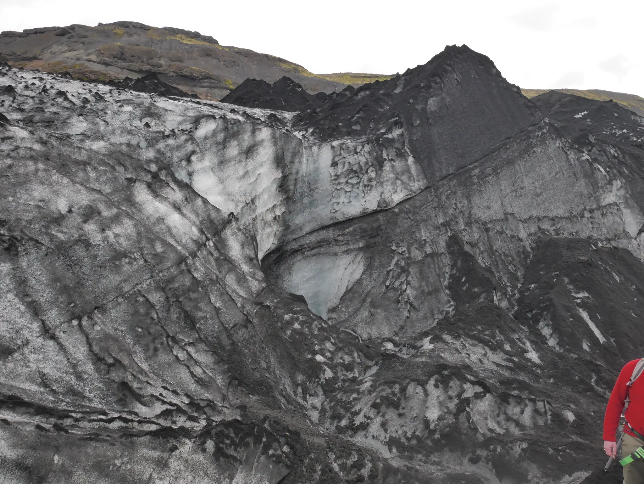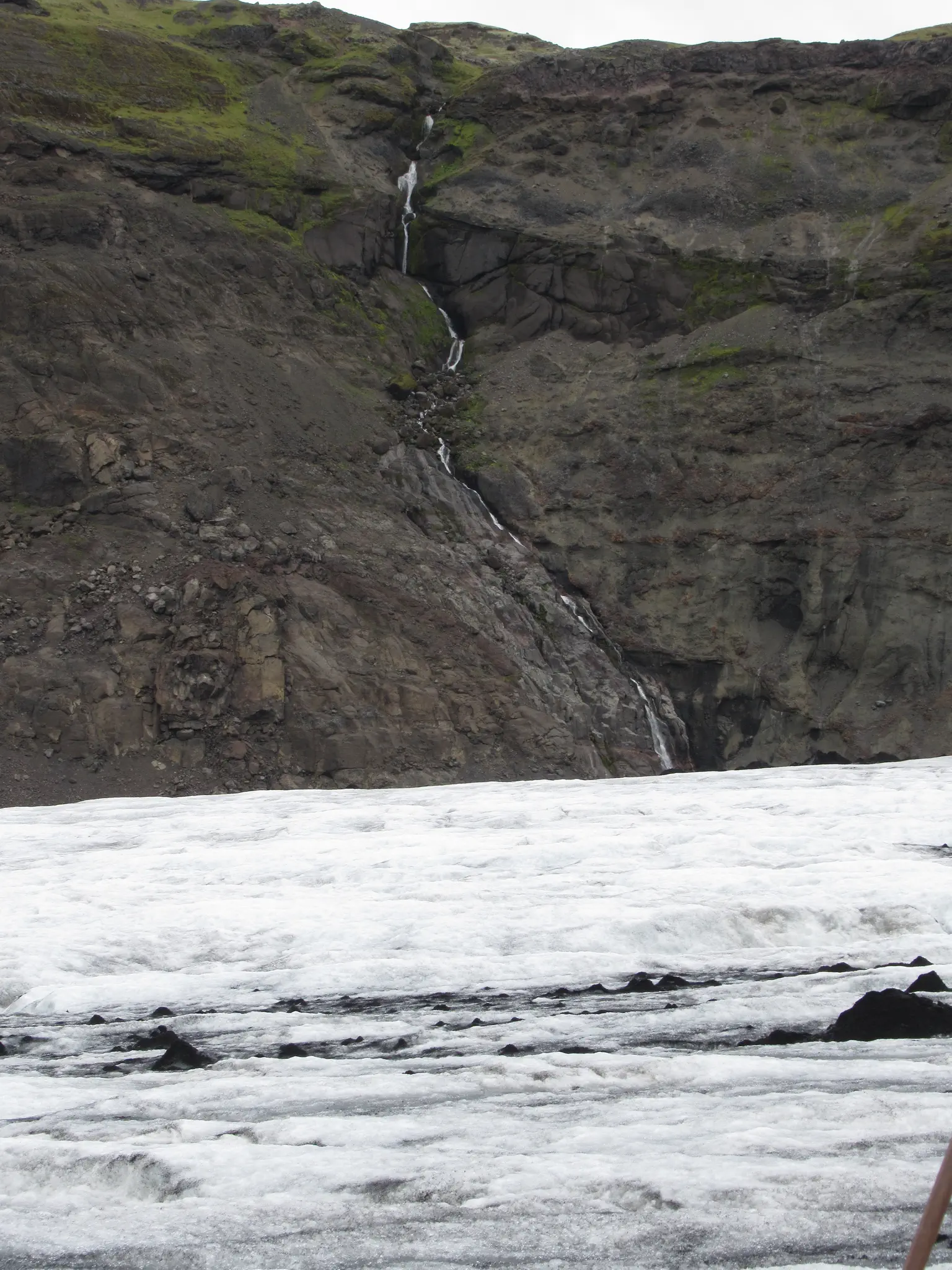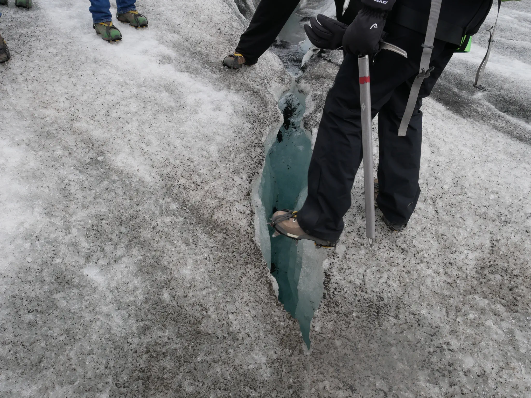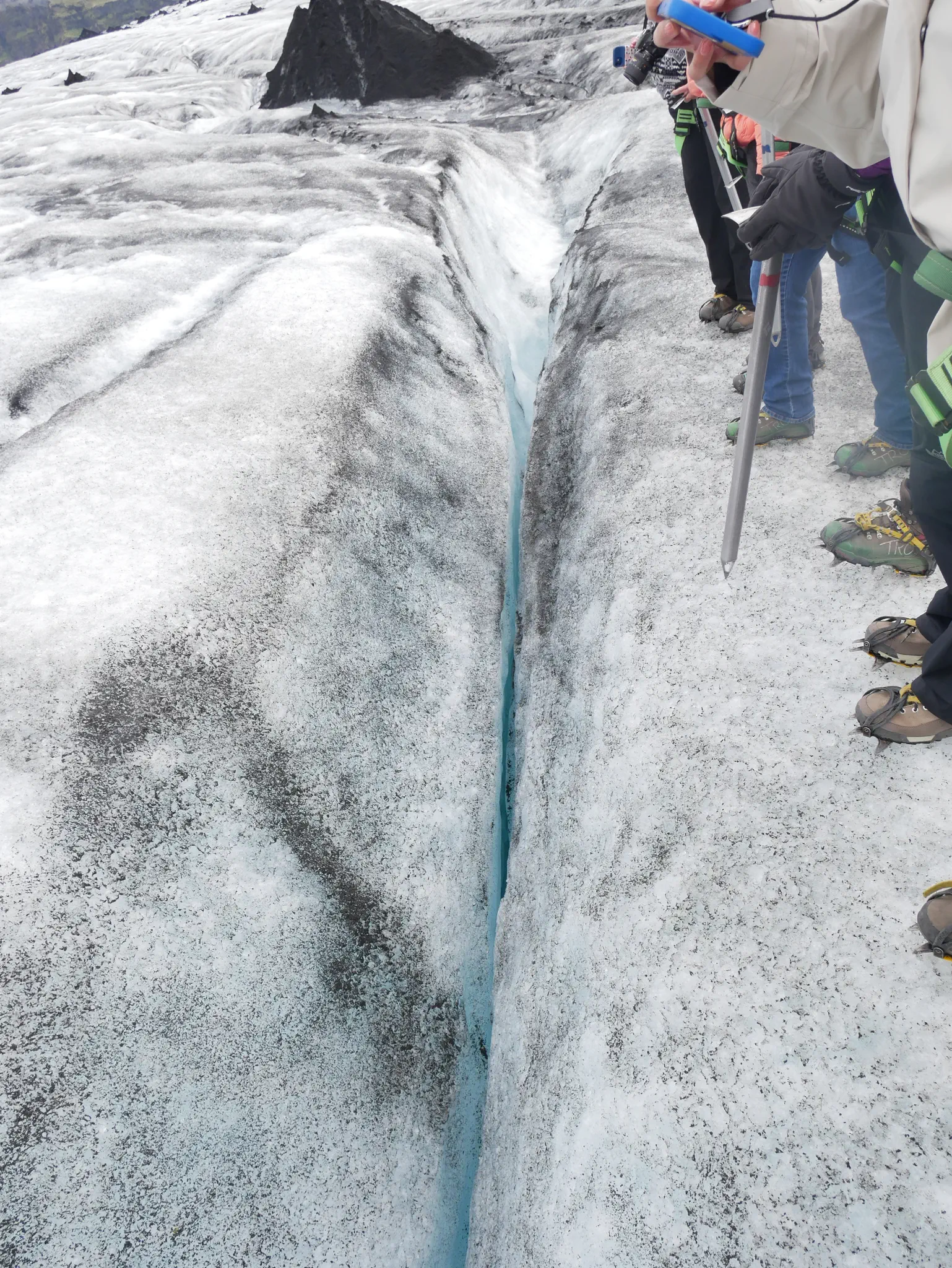 The glaciers in Iceland are melting quickly. They estimated to be completely gone in 150 years. The metal V behind Travis is a device that they use to measure the melting just this year. It was very beautiful, so sorry, lots of pictures! Our guide recommended walking wide to not catch the crampons on your pants or boots and to stomp if it felt like you were slipping or not getting great traction. When going back, which was downhill, the recommendation was to lean back. There was a spot at the beginning noted as slippery. I was cautious, but it was not too bad.