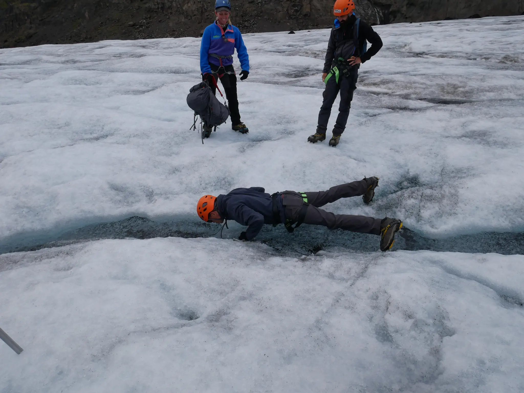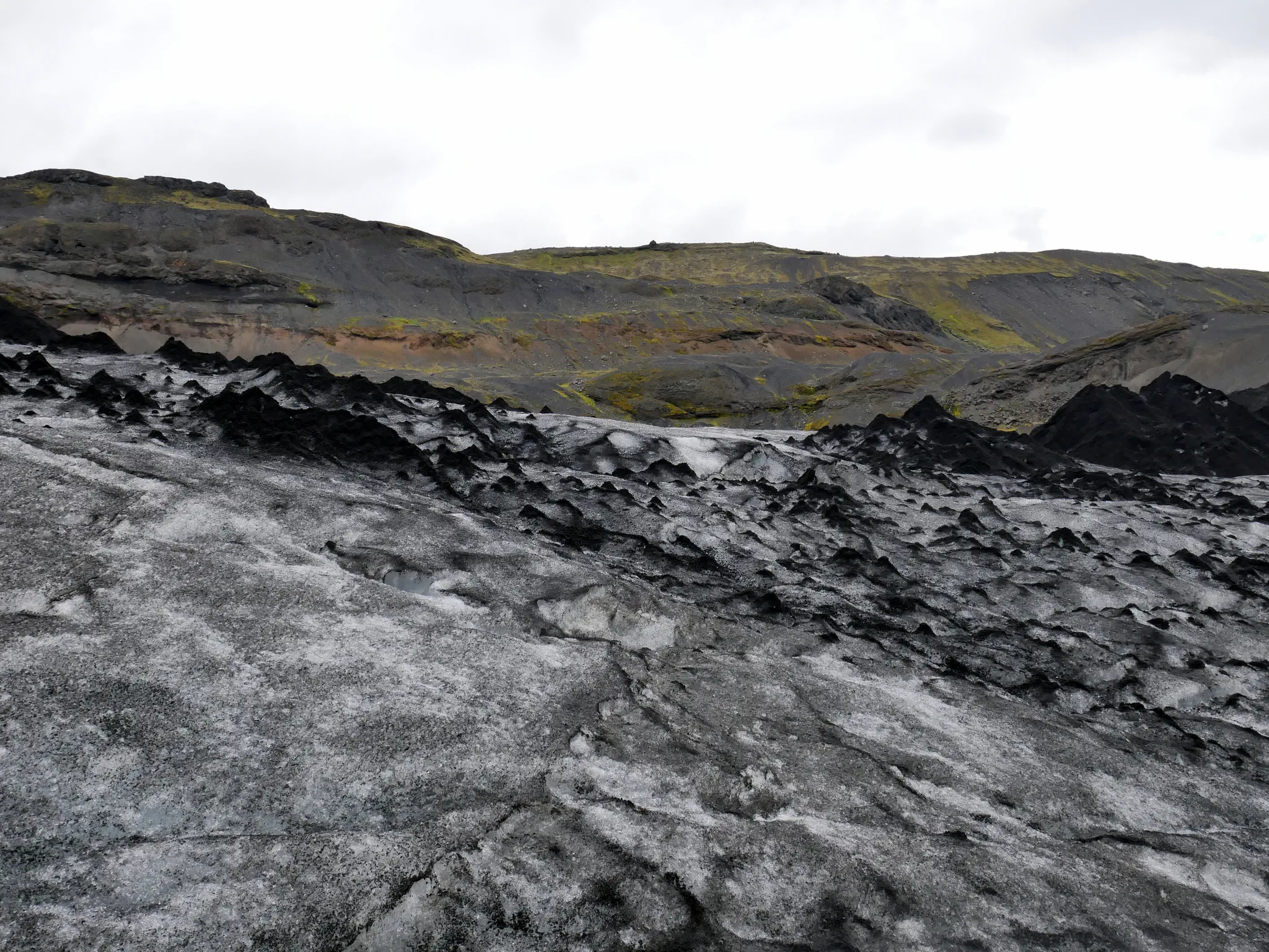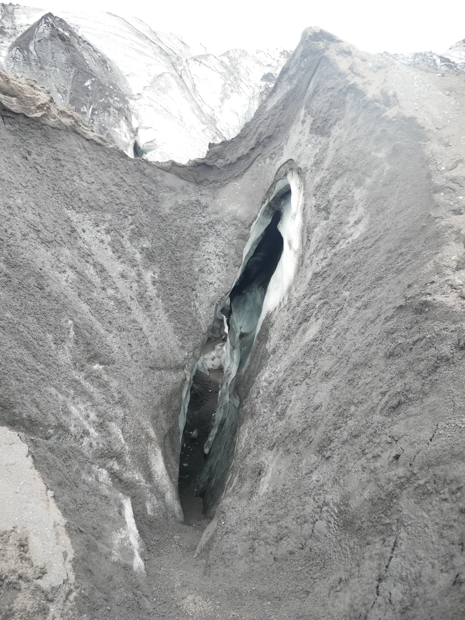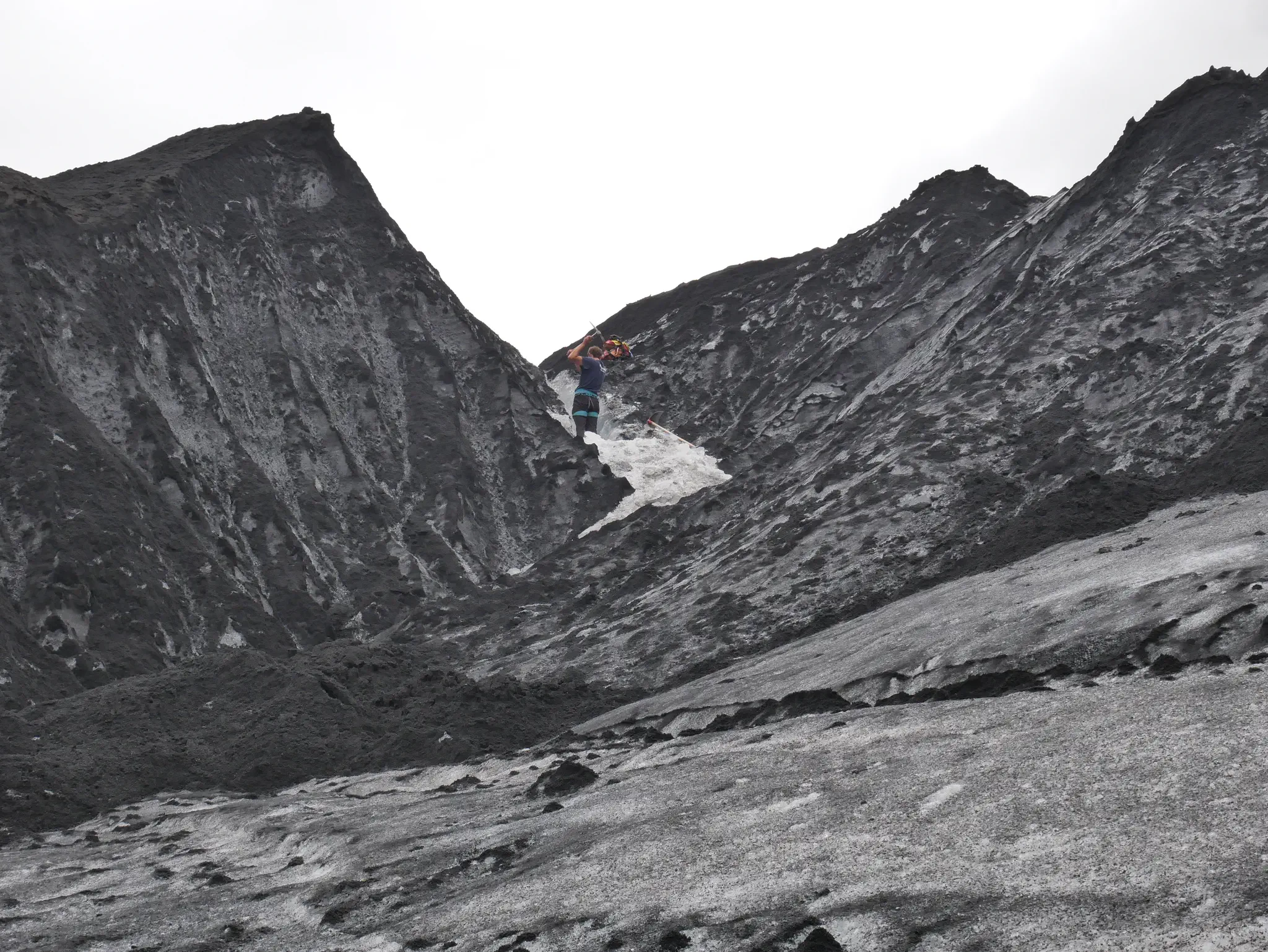 The glaciers in Iceland are melting quickly. They estimated to be completely gone in 150 years. The metal V behind Travis is a device that they use to measure the melting just this year. It was very beautiful, so sorry, lots of pictures! Our guide recommended walking wide to not catch the crampons on your pants or boots and to stomp if it felt like you were slipping or not getting great traction. When going back, which was downhill, the recommendation was to lean back. There was a spot at the beginning noted as slippery. I was cautious, but it was not too bad.