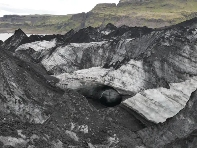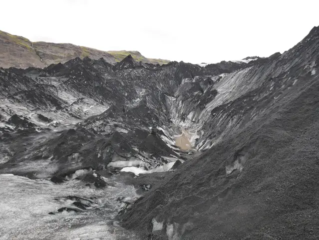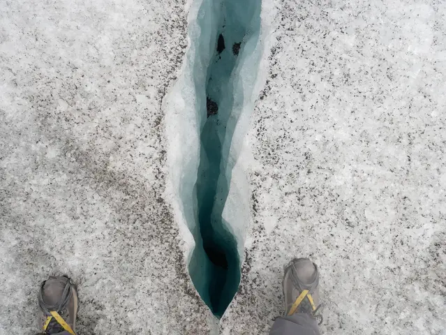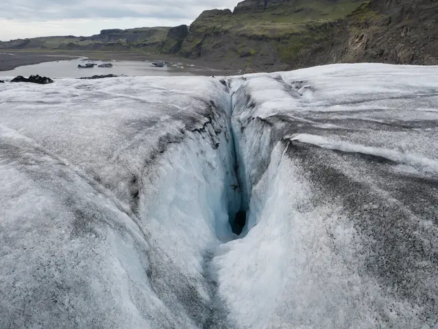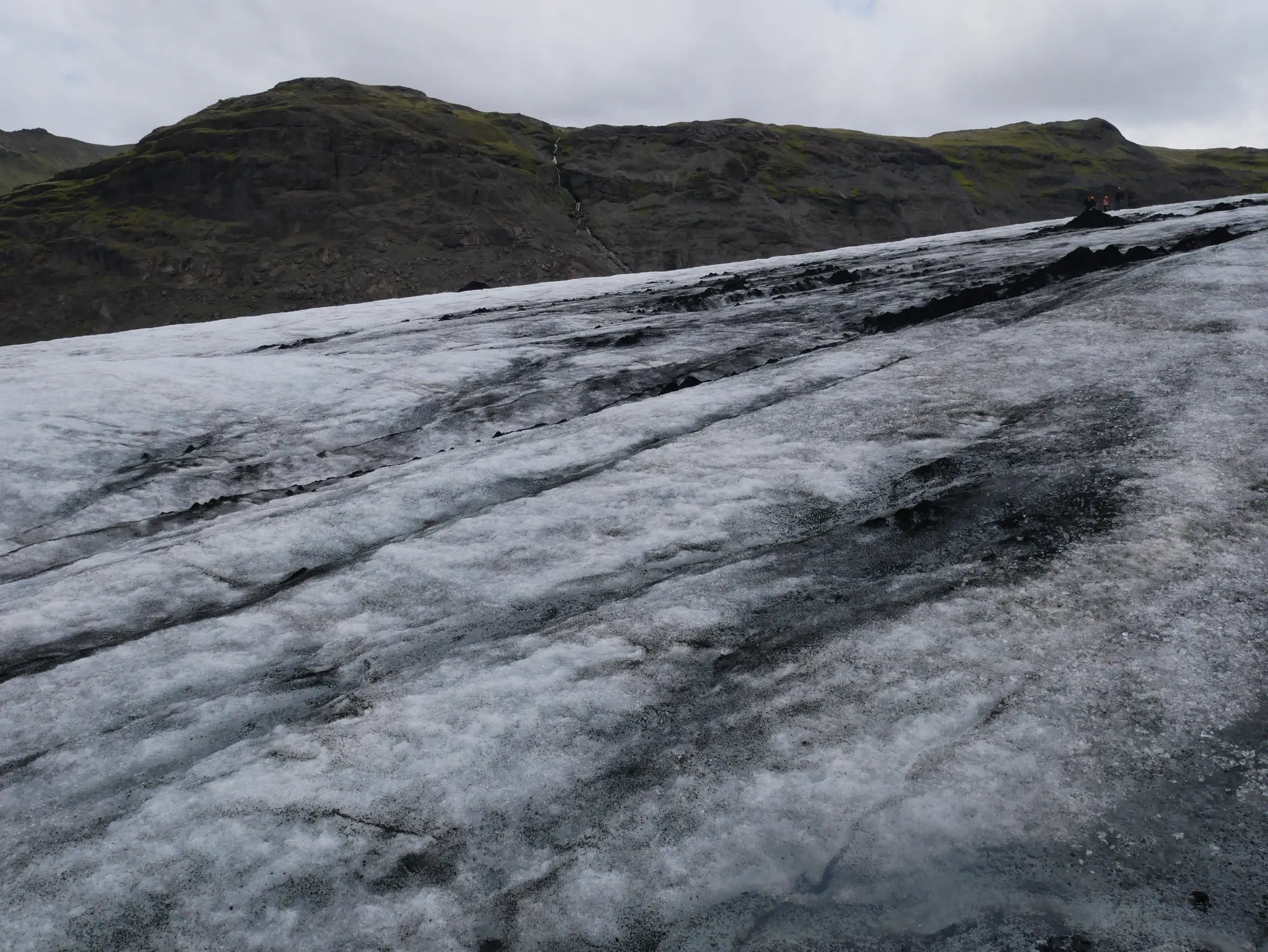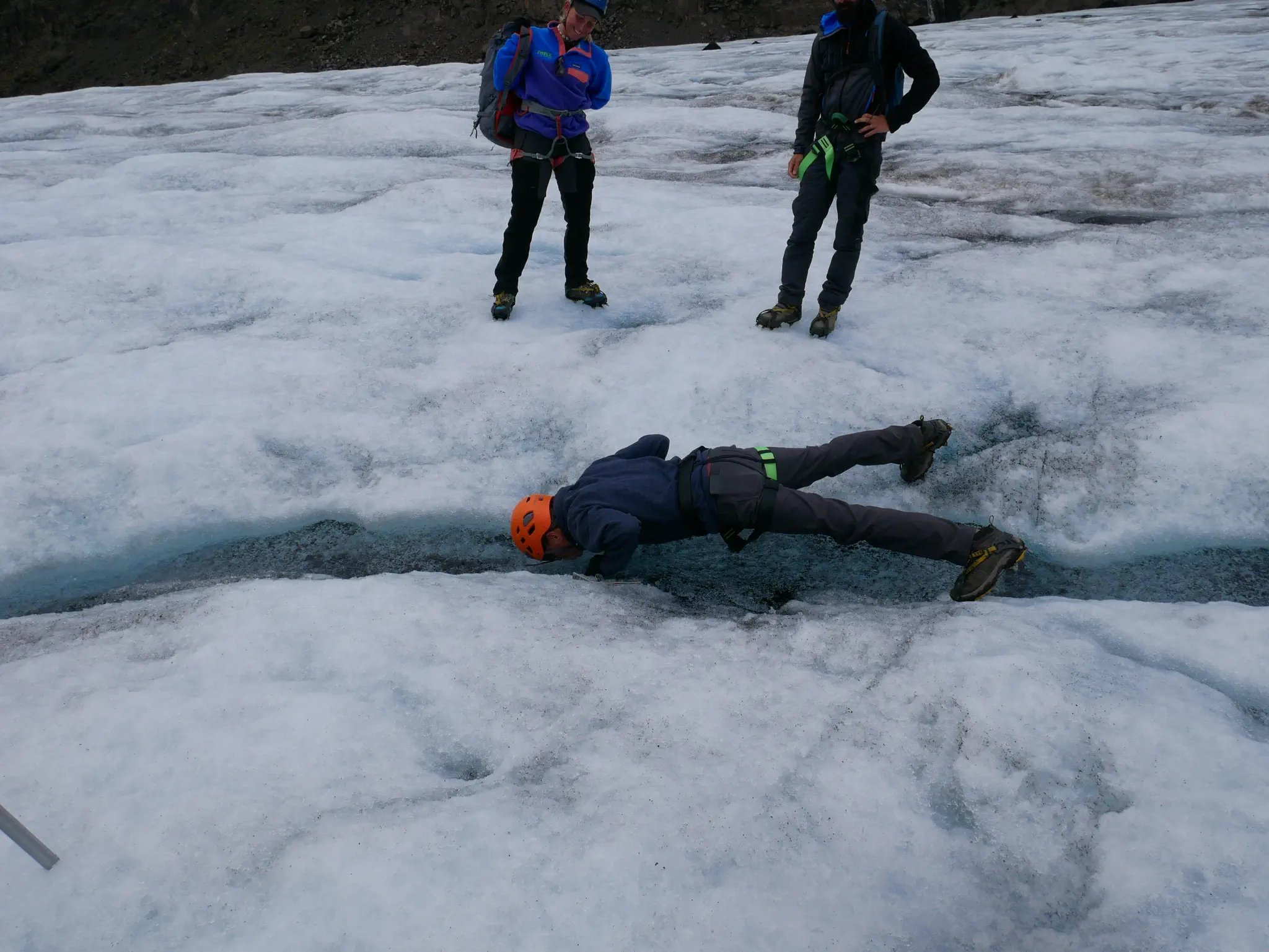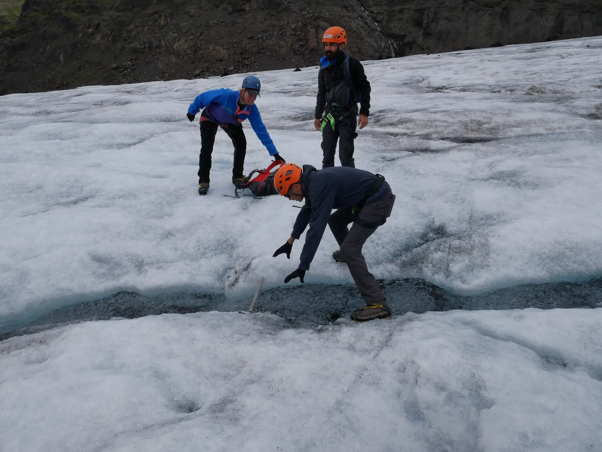 The glaciers in Iceland are melting quickly. They estimated to be completely gone in 150 years. The metal V behind Travis is a device that they use to measure the melting just this year. It was very beautiful, so sorry, lots of pictures! Our guide recommended walking wide to not catch the crampons on your pants or boots and to stomp if it felt like you were slipping or not getting great traction. When going back, which was downhill, the recommendation was to lean back. There was a spot at the beginning noted as slippery. I was cautious, but it was not too bad.