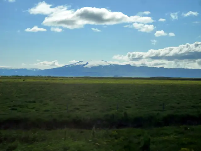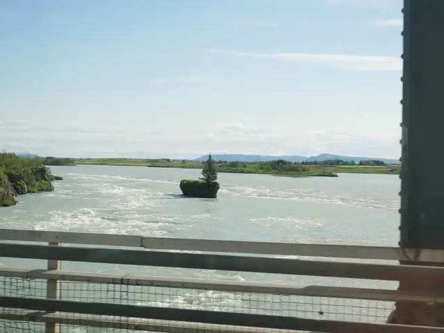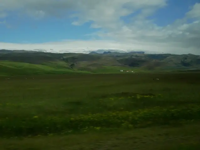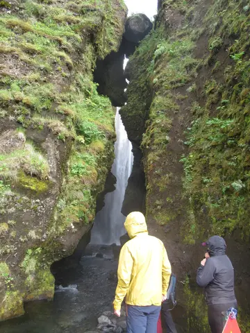 After picking up everyone, the guide gave the day's tour plan. We left the capitol area and headed south. We came upon a geothermal, geyser area. Then the tree on a small island in the river was just cute. First glacier sighting -- up in the mountains. We passed round hay bales that were fully wrapped in thick plastic to survive the winter until needed. Passing Seljalandsfoss that we came back later to visit -- the hike behind the waterfall to be the last stop for those that got too wet. We learned that the 2010 volcano eruption, where the ash blew to Europe and shut down air traffic, gave Iceland a lot of free marketing. People had not heard of Iceland, so the news stories talked about the volcano and showed some waterfall pictures. Iceland is a country of 375,000 people but now gets 2+ million visitors per year.