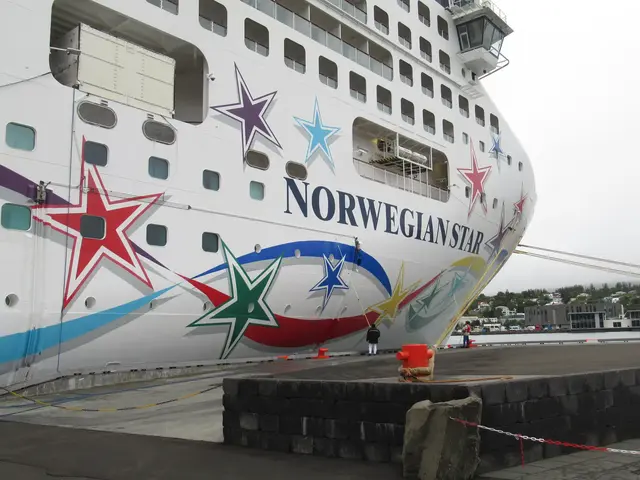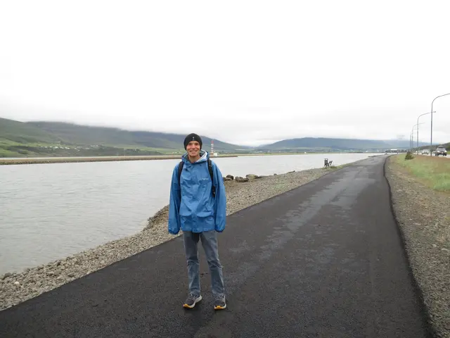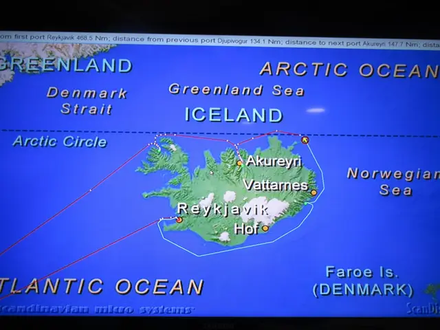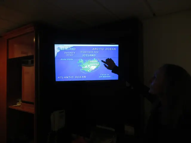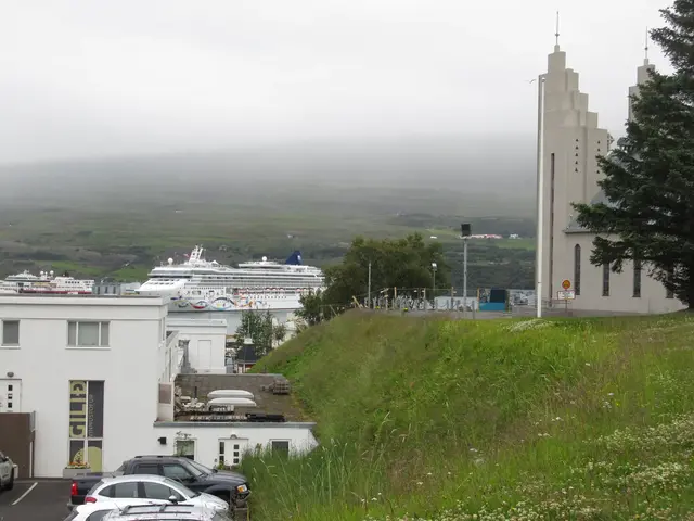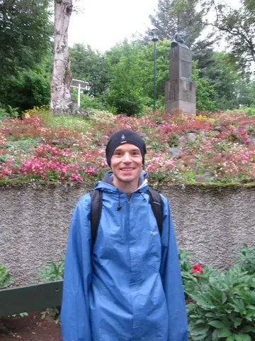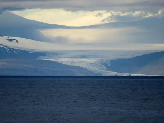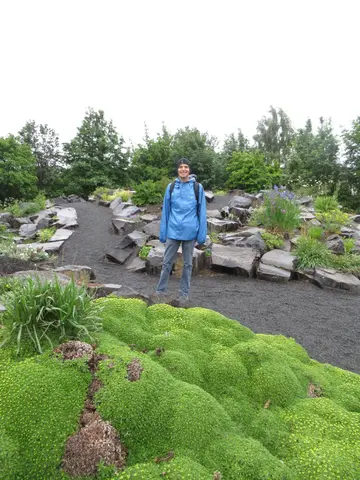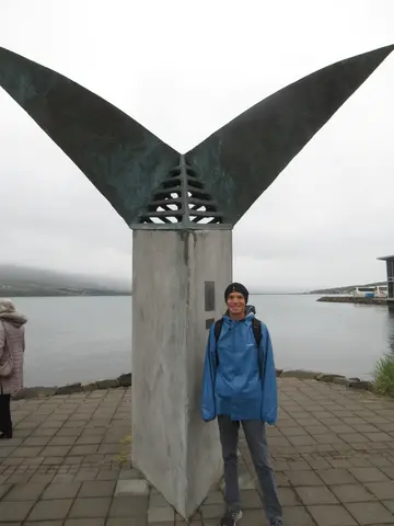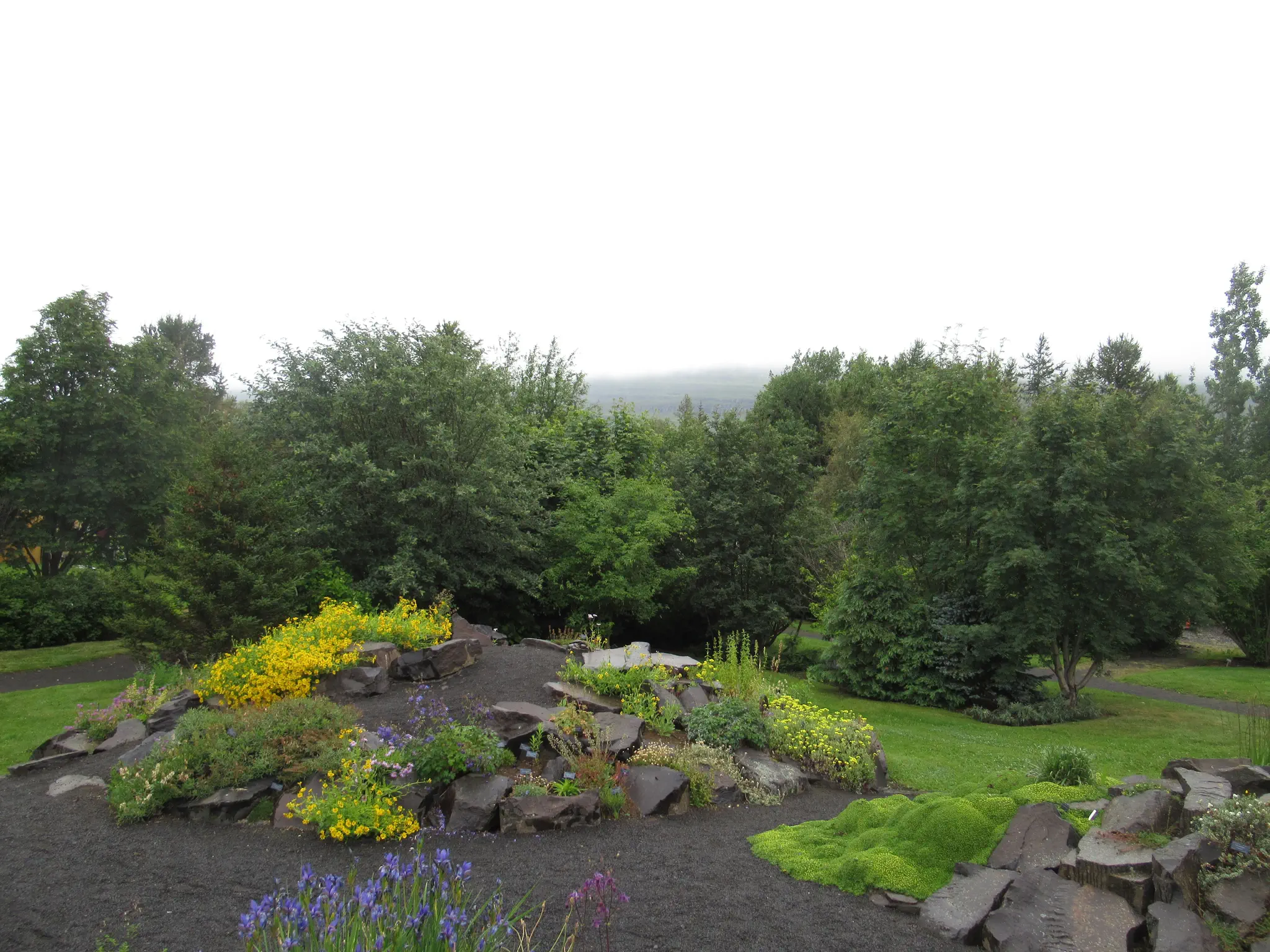 Our next stop was Akureyri; it was a dock port. Akureyri is in an fjord. There was a good waterfall view from the ship. There was wi-fi available in the port, and also a store where I got a puffin magnet. We got off the ship twice -- to the Botanical Garden the first time and walk along the coast the next. It was not great weather this day. We looked at the public pool (with water slides); this is part of their culture and was a recommended thing to do. But, with the weather, we did not try it. We did walk by it. People were there and in line for the water slides, luckily the spiral up lines were enclosed in plex glass to be warmer against the wind. It still looked cold though.