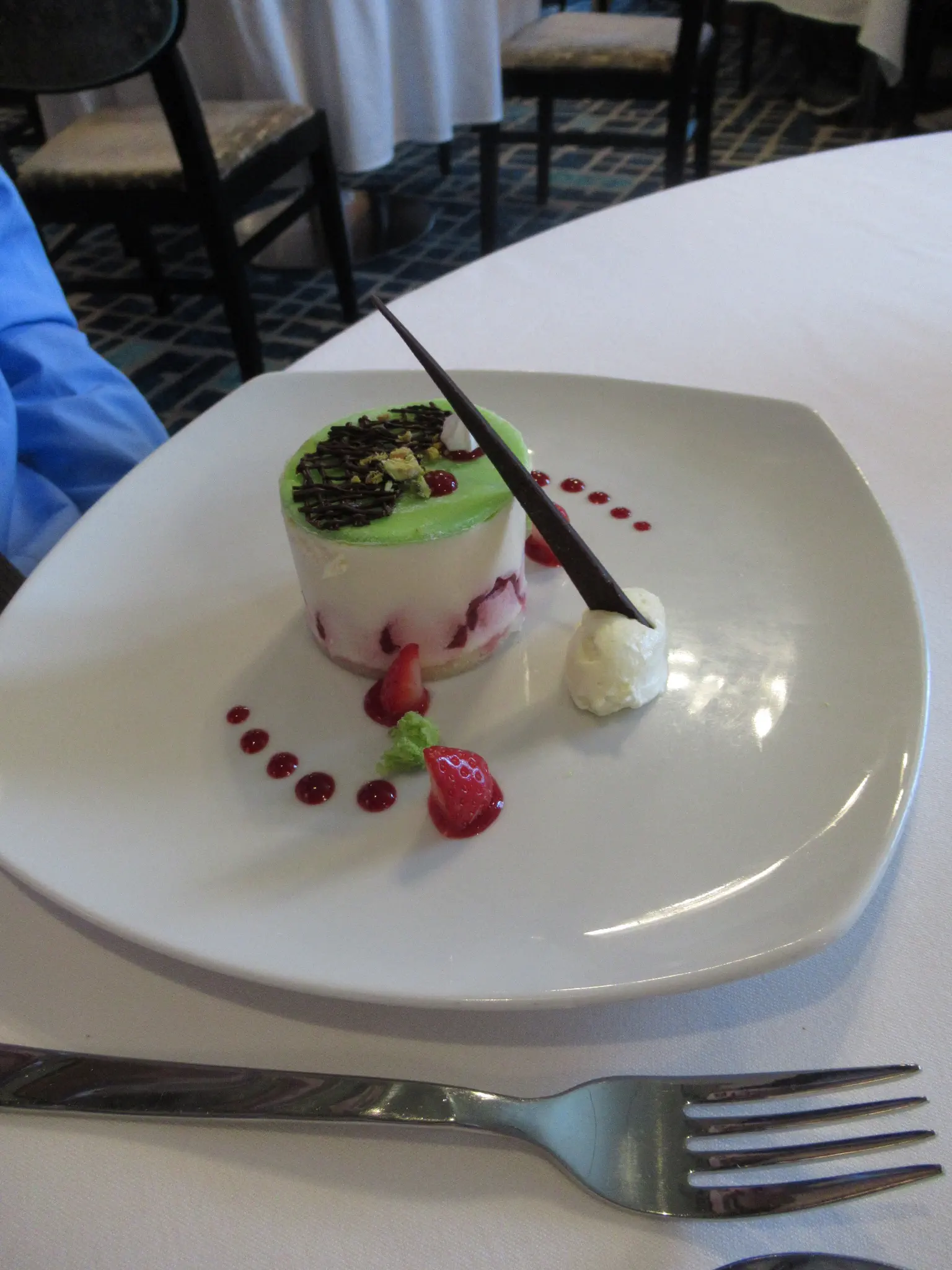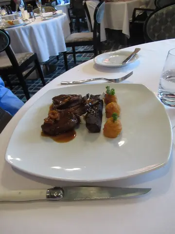 We had Le Bistro with our platinum certificate booked, online before boarding -- since it is a la carte, you can book beforehand without having to pre-pay. We did not try it, but I heard that you can pre-pay for others and get it back as onboard credit, but is still onboard credit. Since Moderno is not a la carte, we were in the line in the included Asian restaurant to book right after boarding, but I got the NCL app to work to book and did not have to keep waiting -- yay. I let another person know; hopefully, they got it to work too. The platinum certificates now look good for any restaurants, so that is a nice change. Before one for Le Bistro or Cagney's, and one for the Italian or Moderno. I had the Steak Tartar, the pork chop -- was good; my favorite, beef tenderloin is now an extra upcharge -- boo! Later, I got the smaller filet at Cagney's. If only we ate there first, I could have ordered the bigger one and had them reheat it for me at Le Bistro. Kidding, but it was tempting. Travis had goat cheese croquettes with beets salad and lamb shank and chop, which he said was very good.