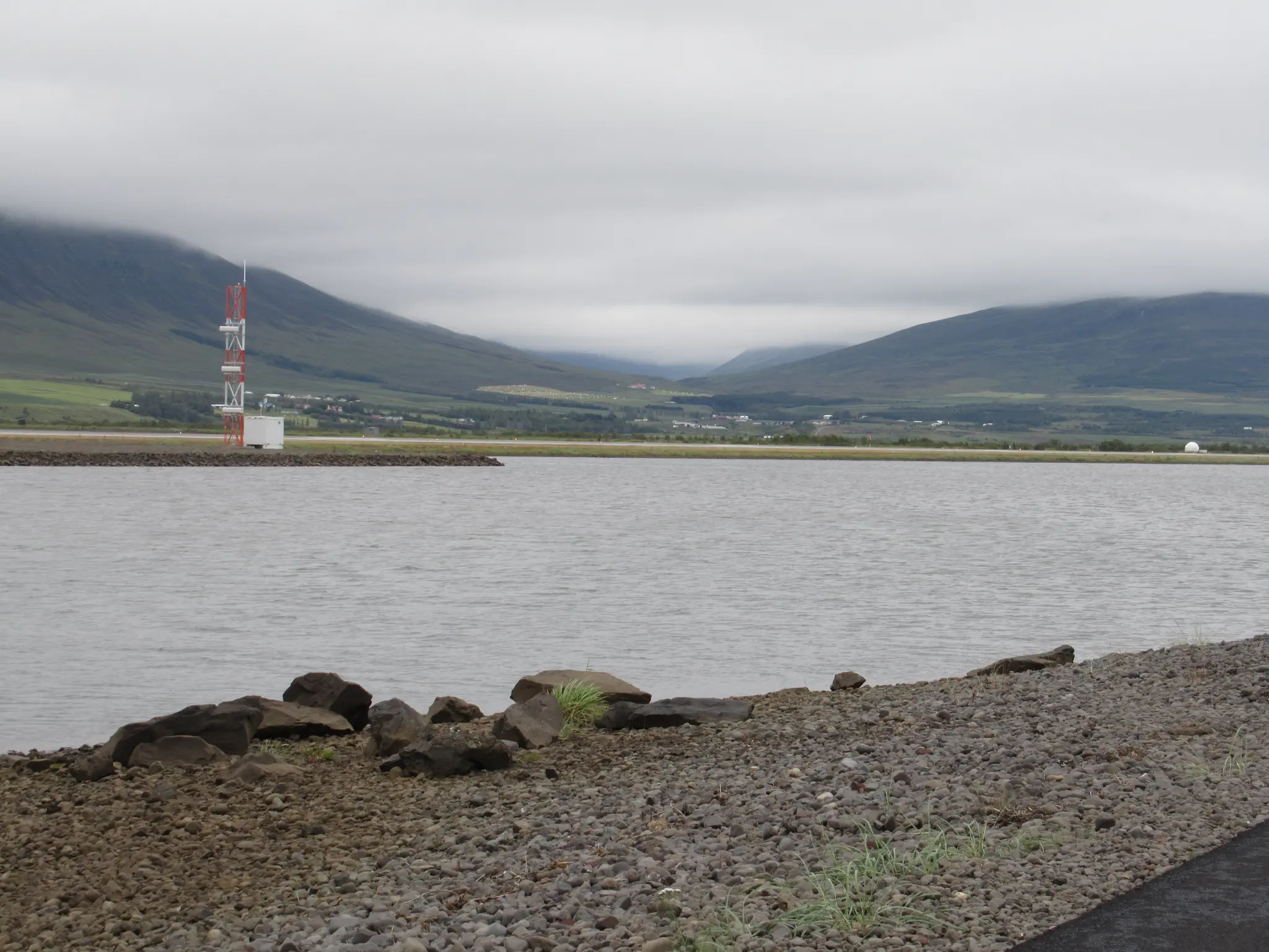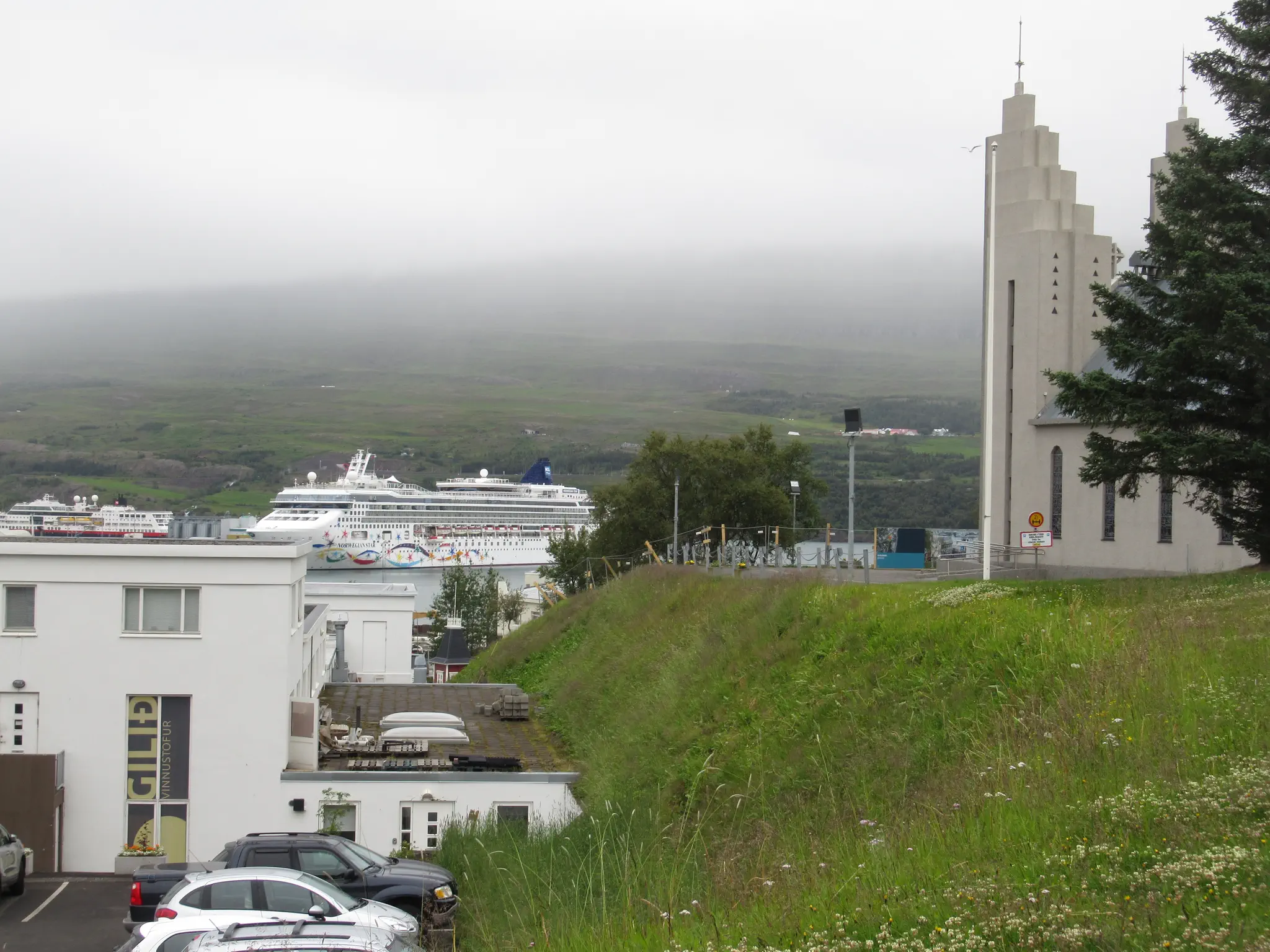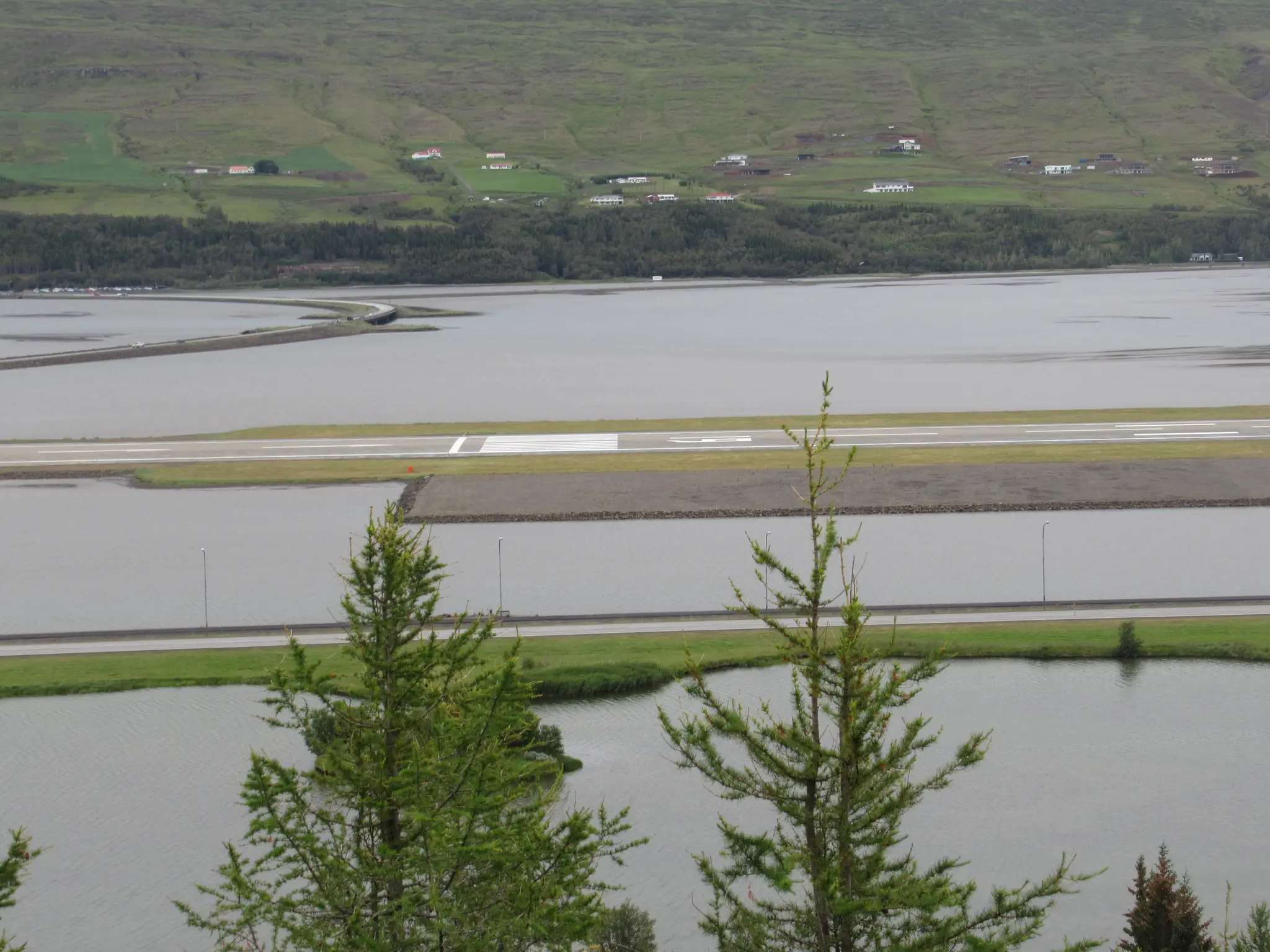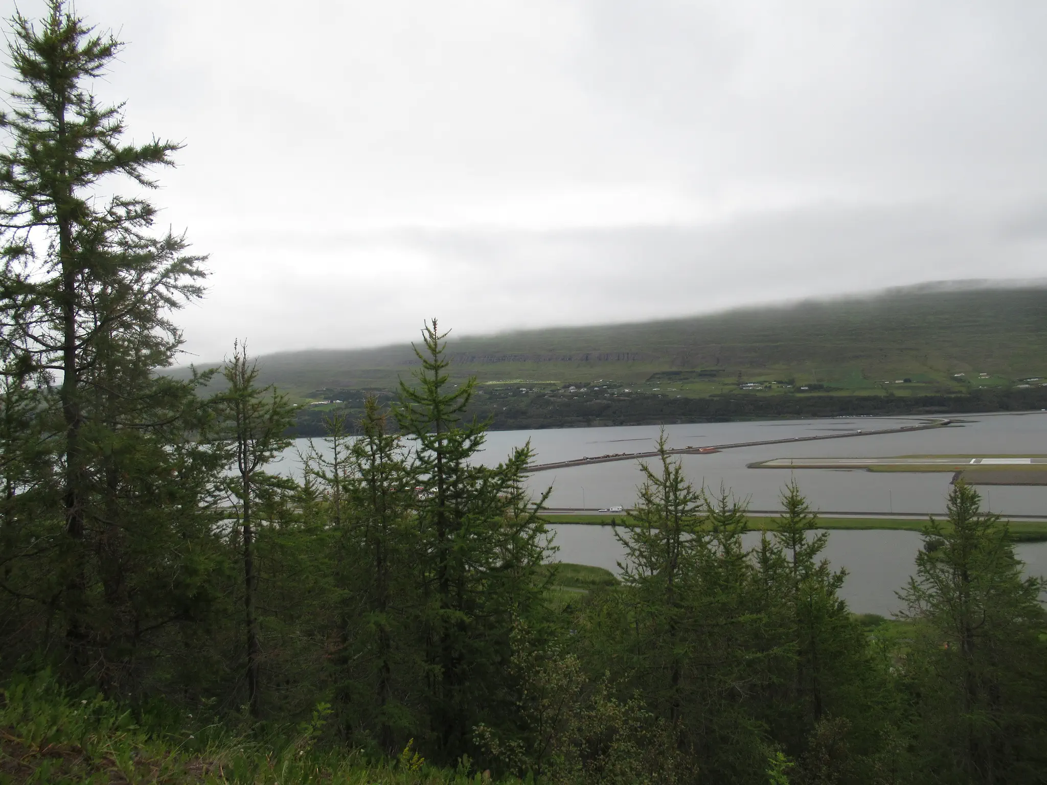 The Akureyri International Airport with runway ending in the water. Trying to spread tourist out more and handle more tourists, they built this airport to help out KEF near Reykjavik. We learned on our taxi ride, post-cruise, that KEF was a US military base and airport post-WWII until 2006. Our taxi driver pointed out some US military housing, noting that it had mostly been repainted from the army green. Then Travis made me walk up a hill.