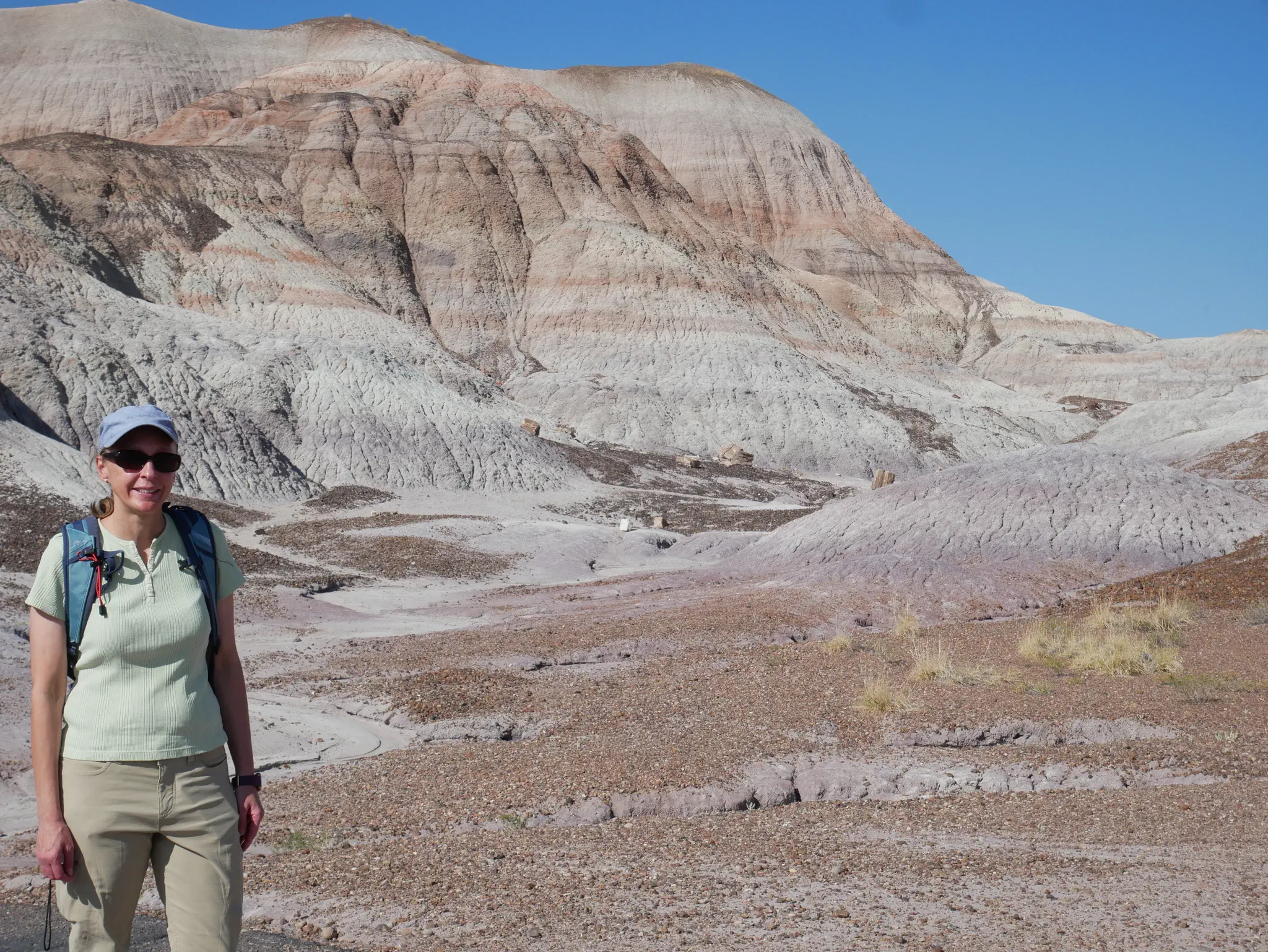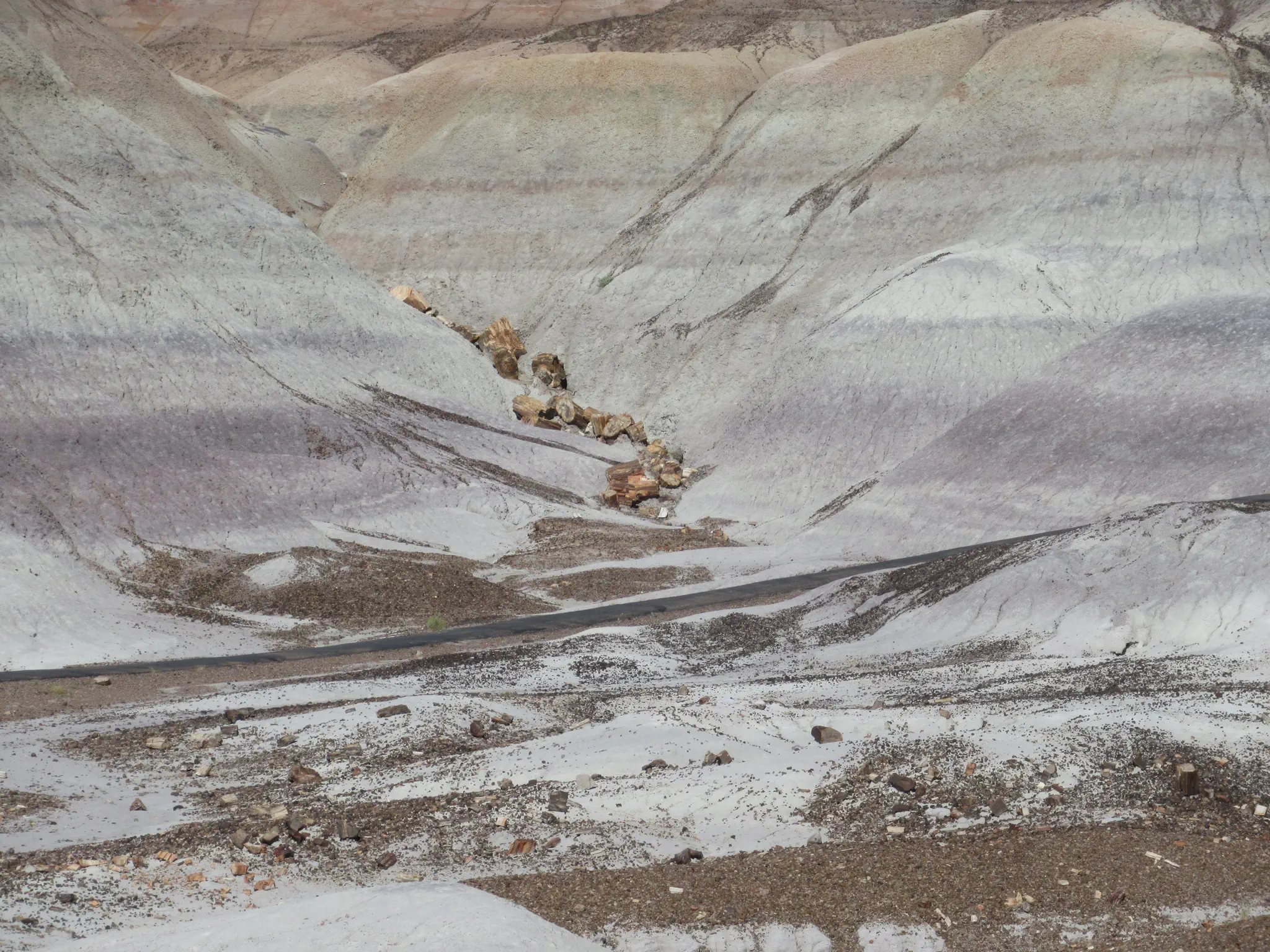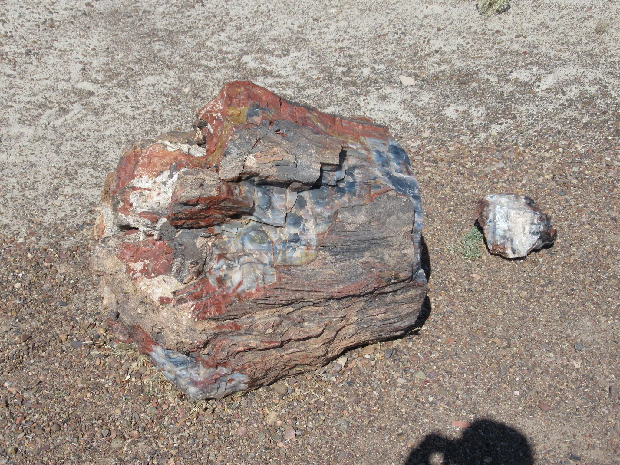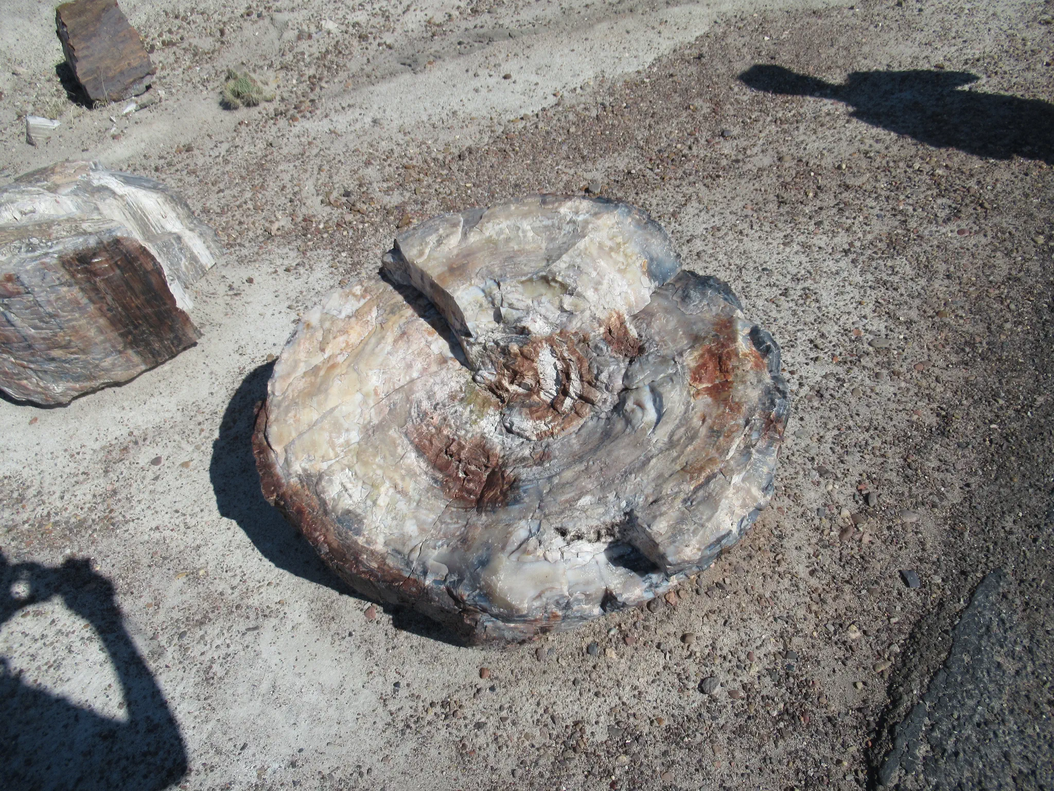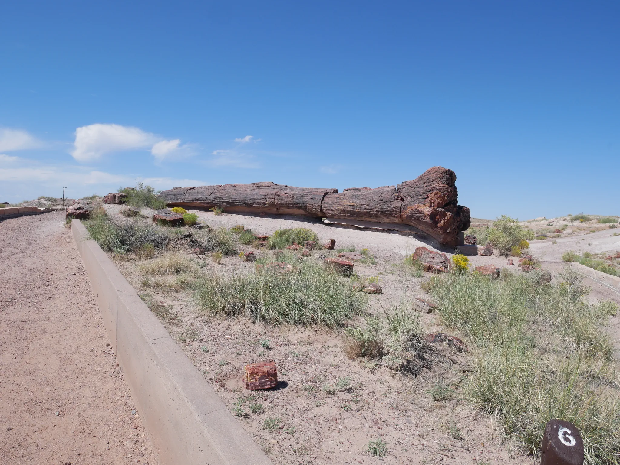 First, we hiked the Blue Mesa Trail across I-40 on the south side. This was a 1 mile loop with elevation drop at the beginning and increase at the end. It was a very nice hike; the colored hills looked like Death Valley National Park in California. We saw some petrified wood. Dog were allowed, and we saw some on the trail. Then, we hiked the Crystal Forest, seeing lots of petrified wood some with crystal formations. The broken full tree petrified logs were cool.
