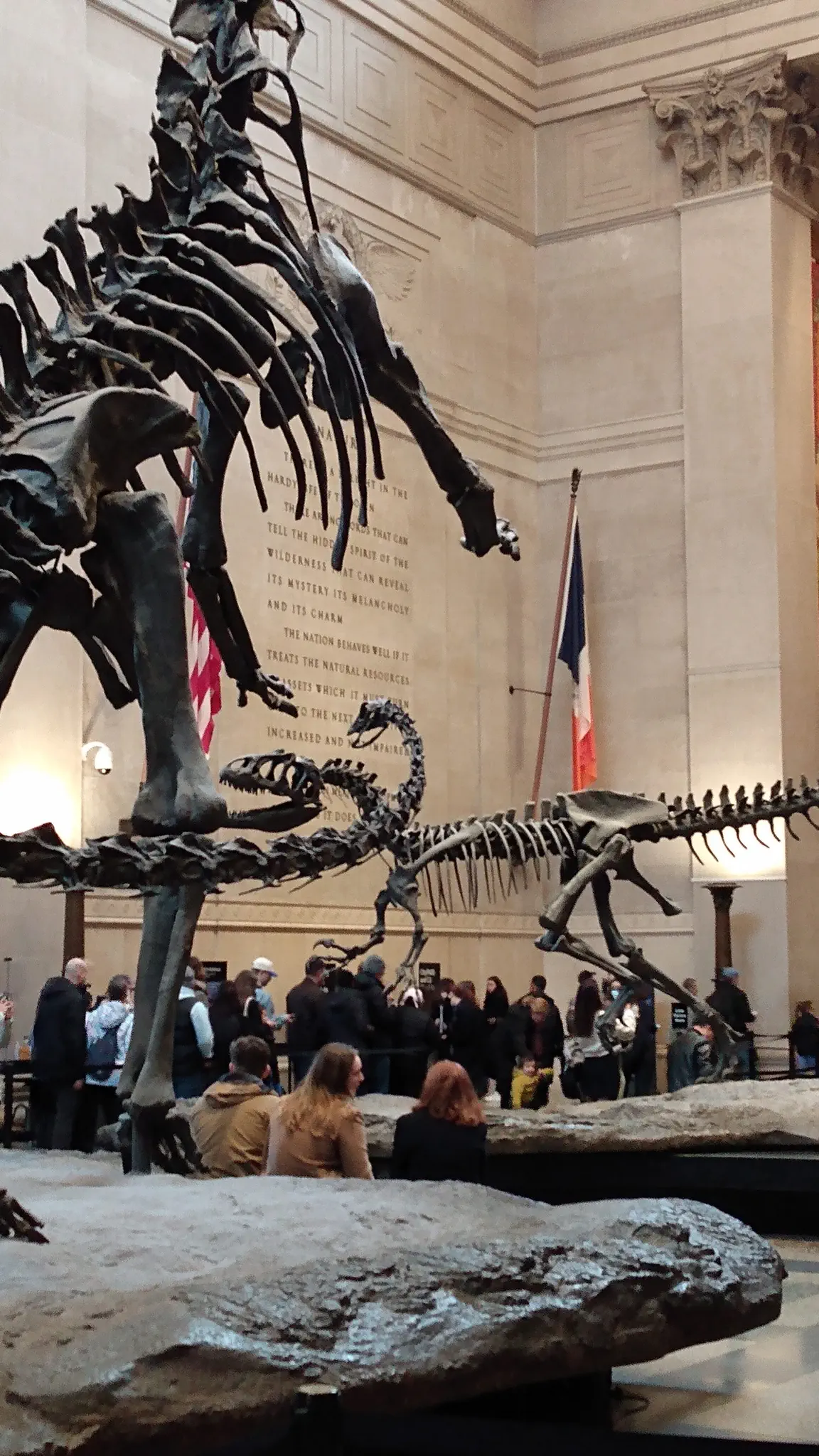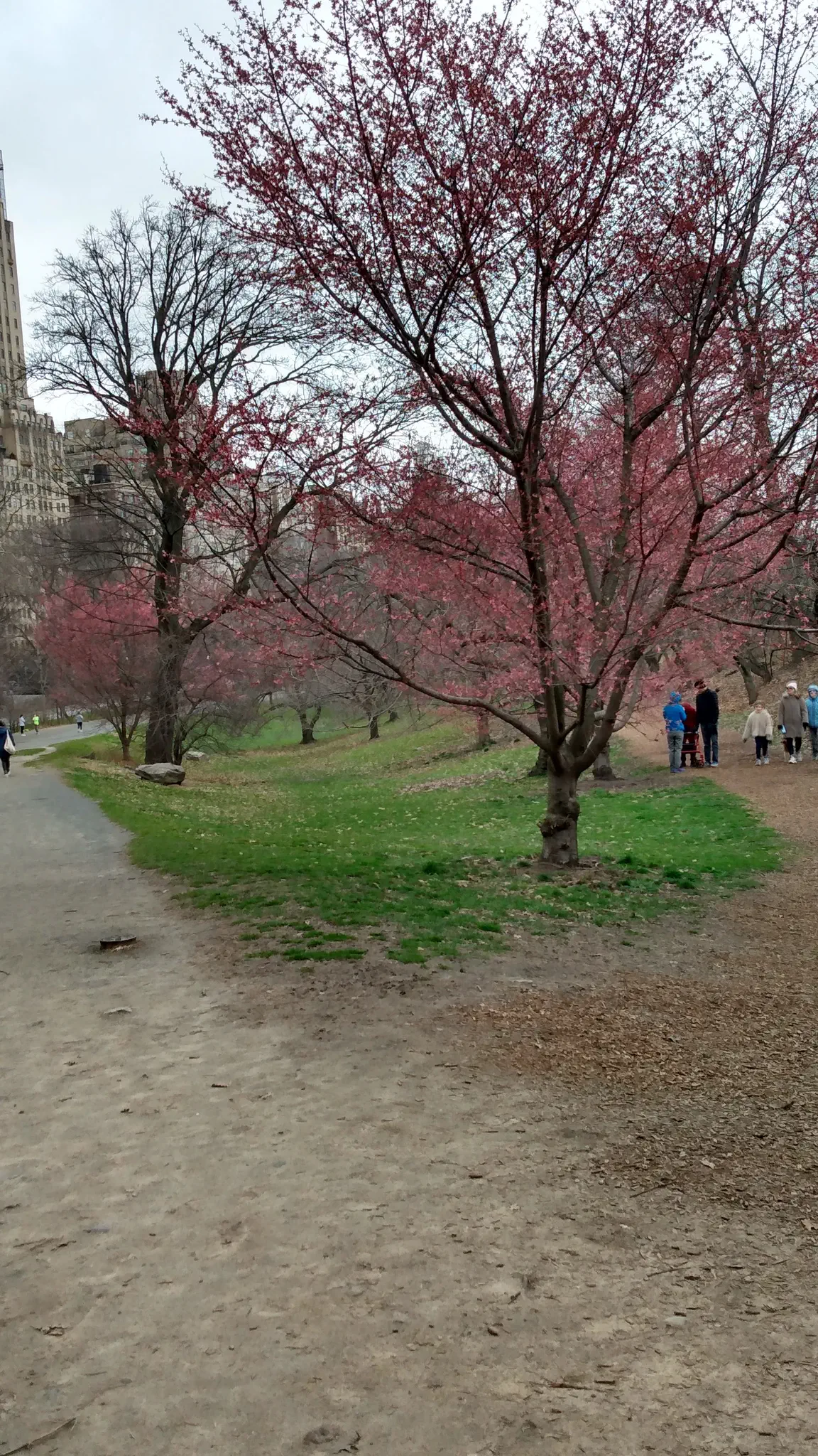 We then took the Metro to the natural history museum, properly called the American Museum of Natural History, and Central Park, across the street. We arrived a little early to have some time to walk around Central Park. There were a lot of runners, so I thought it was a race. Travis thought just runners. Joel is the photographer here, so in cell phone orientation. Across a pond in the park and pretty trees.