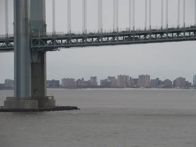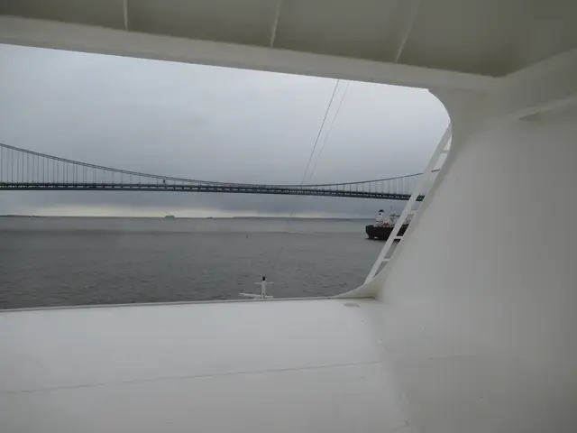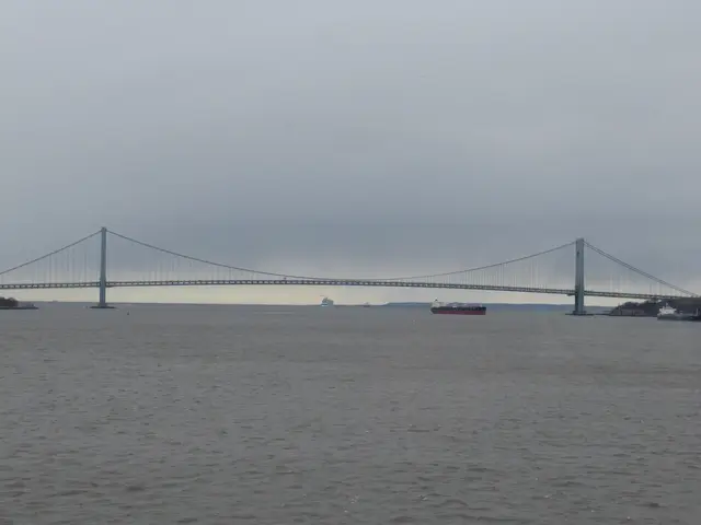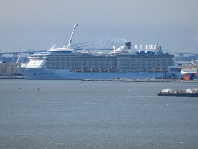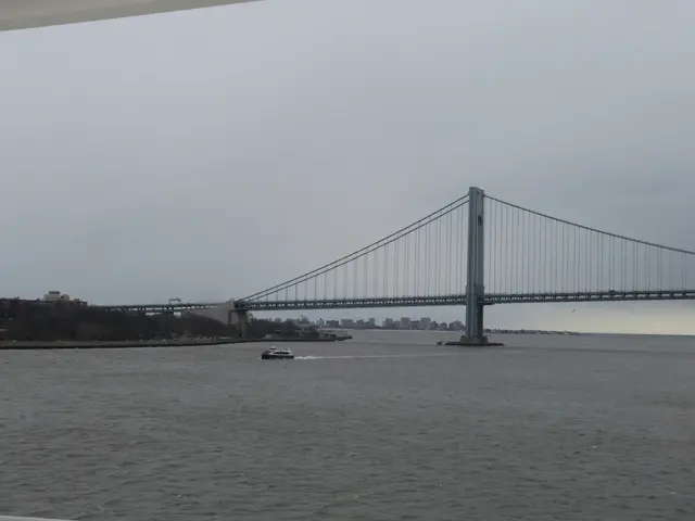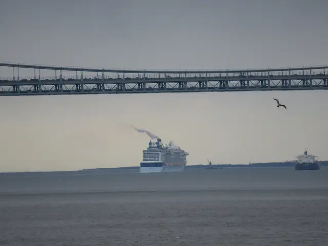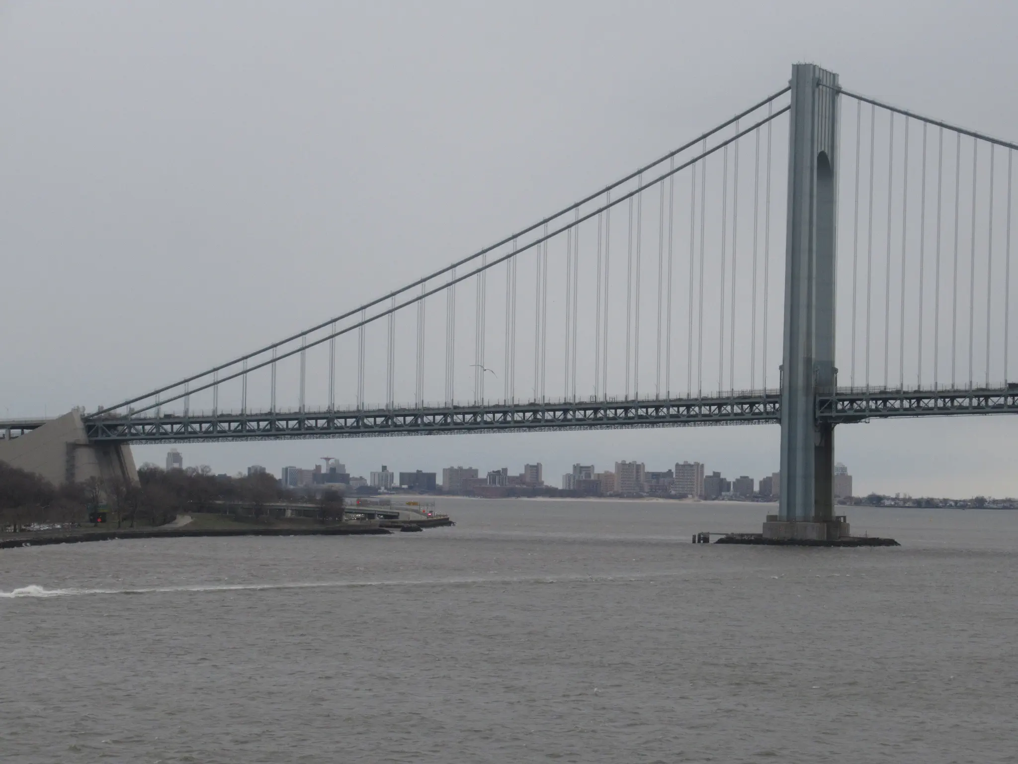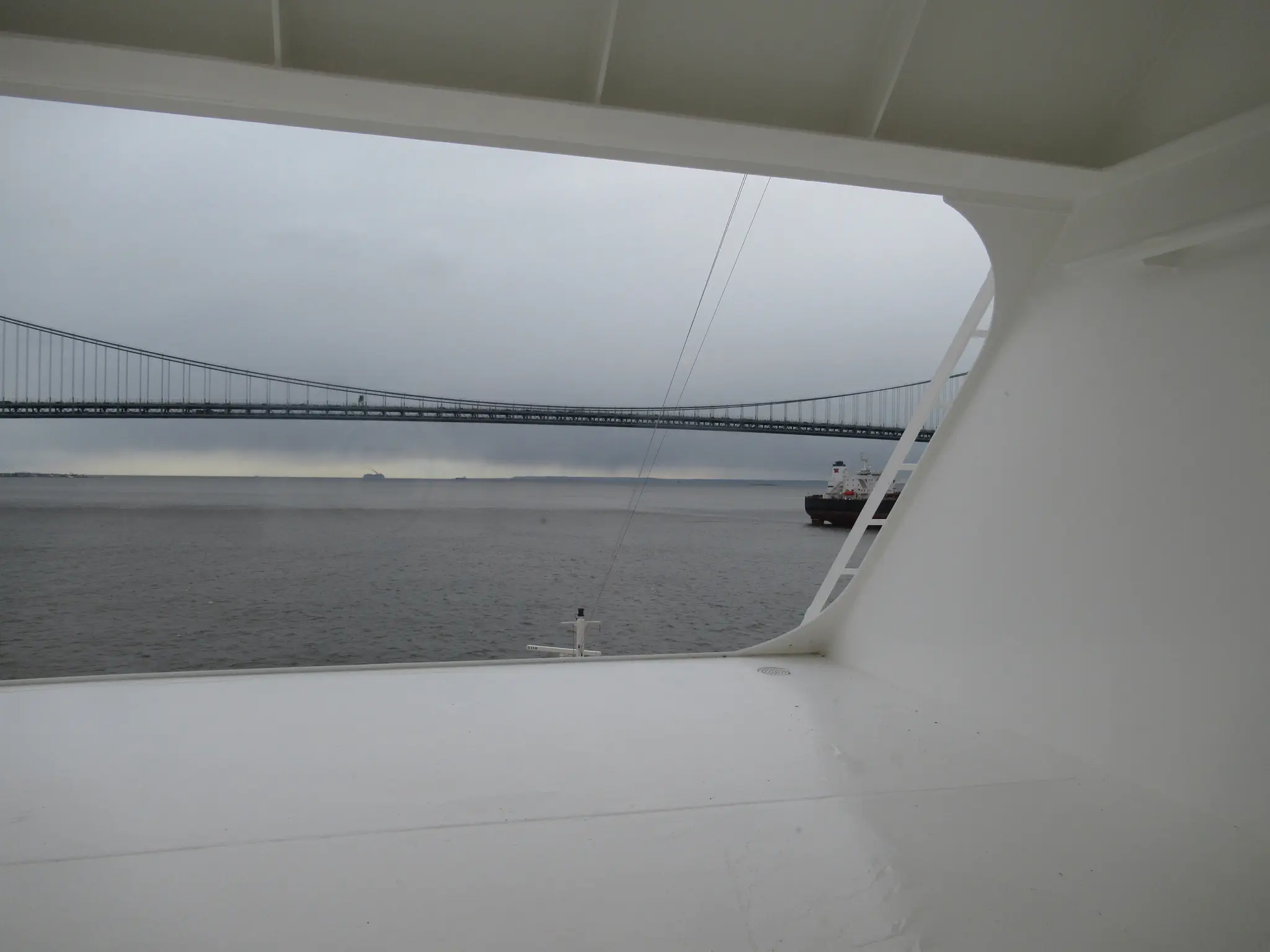 Sail away...and we are off. Views from our front facing window (deep window) of the Verrazzano-Narrows Bridge. It looked like we were going to hit a container ship (below) -- constant bearing, constant speed. The official nautical term looks like Constant bearing, decreasing range (CBDR). But, not an issue. There is also the Anthem of the Seas heading out in front of us.