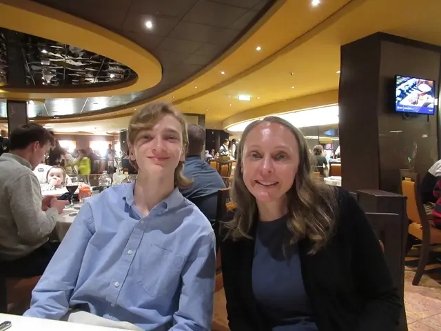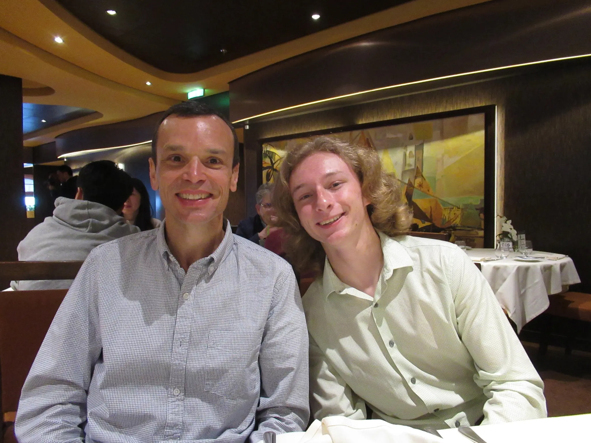 We dressed for dinner. Your assigned dining room, time, and table number is on your keycard. The first night they were taking people to their table. We passed a close number, but our escort kept going. When he was having trouble finding it, I noted that I saw a close number back in a section over there. We all went back, looked, and found it. Our waiters were Ramon and Carlos. They were awesome. Ramon said something that made me ask if we don't wait to be seated on the future nights and just come and sit down here. Fixed time dining, at the same table was brand new for us. He confirmed that we just sit down. We were not sharing with any other families and had a rectangular table for 4. We had line of site to windows, but were not very close to a window. Behind Owen and me, there is a TV showing their specialty dining food preparation. They were scattered about. TVs in the main dining room seemed odd; not making for a very formal experience.