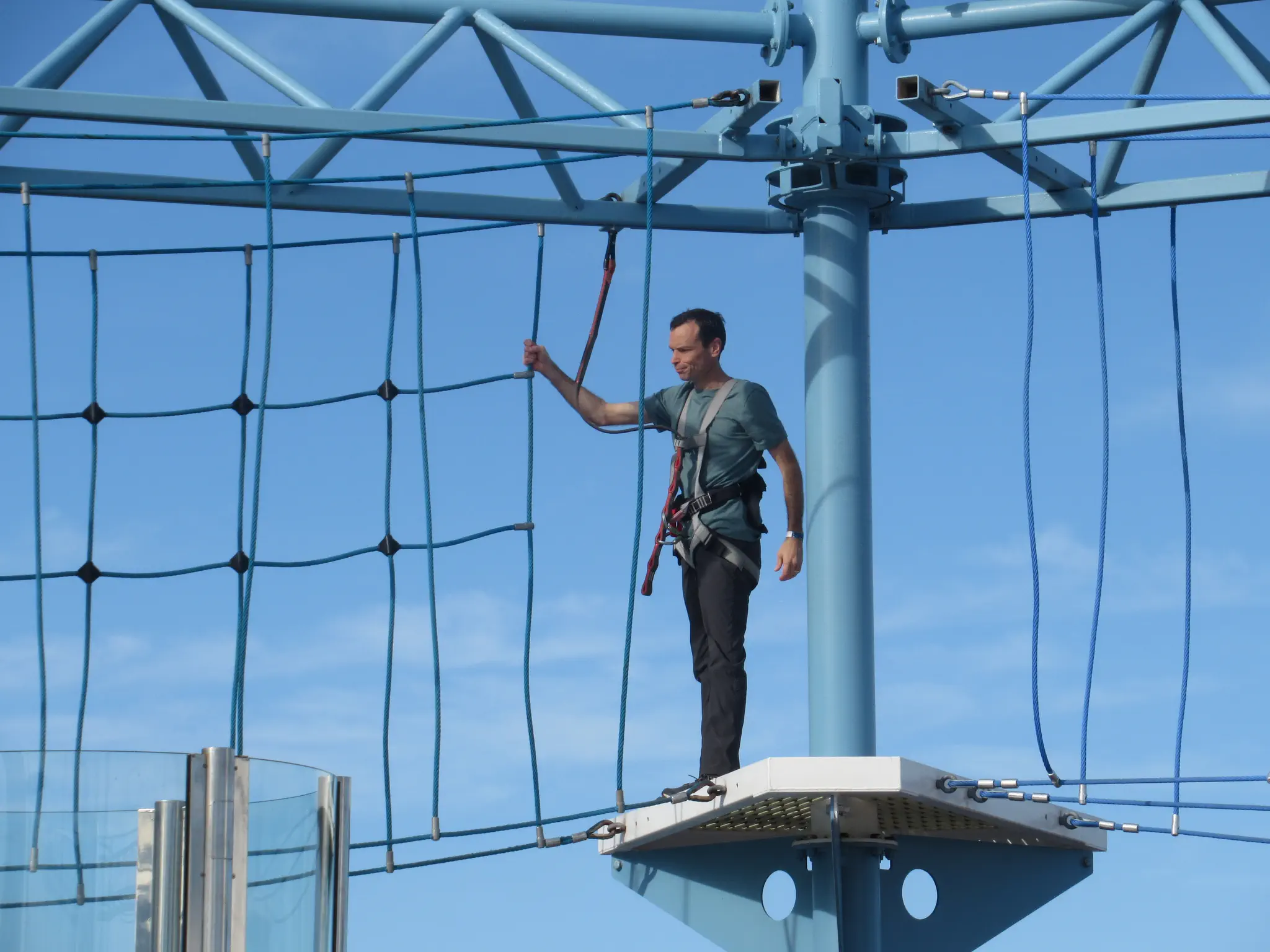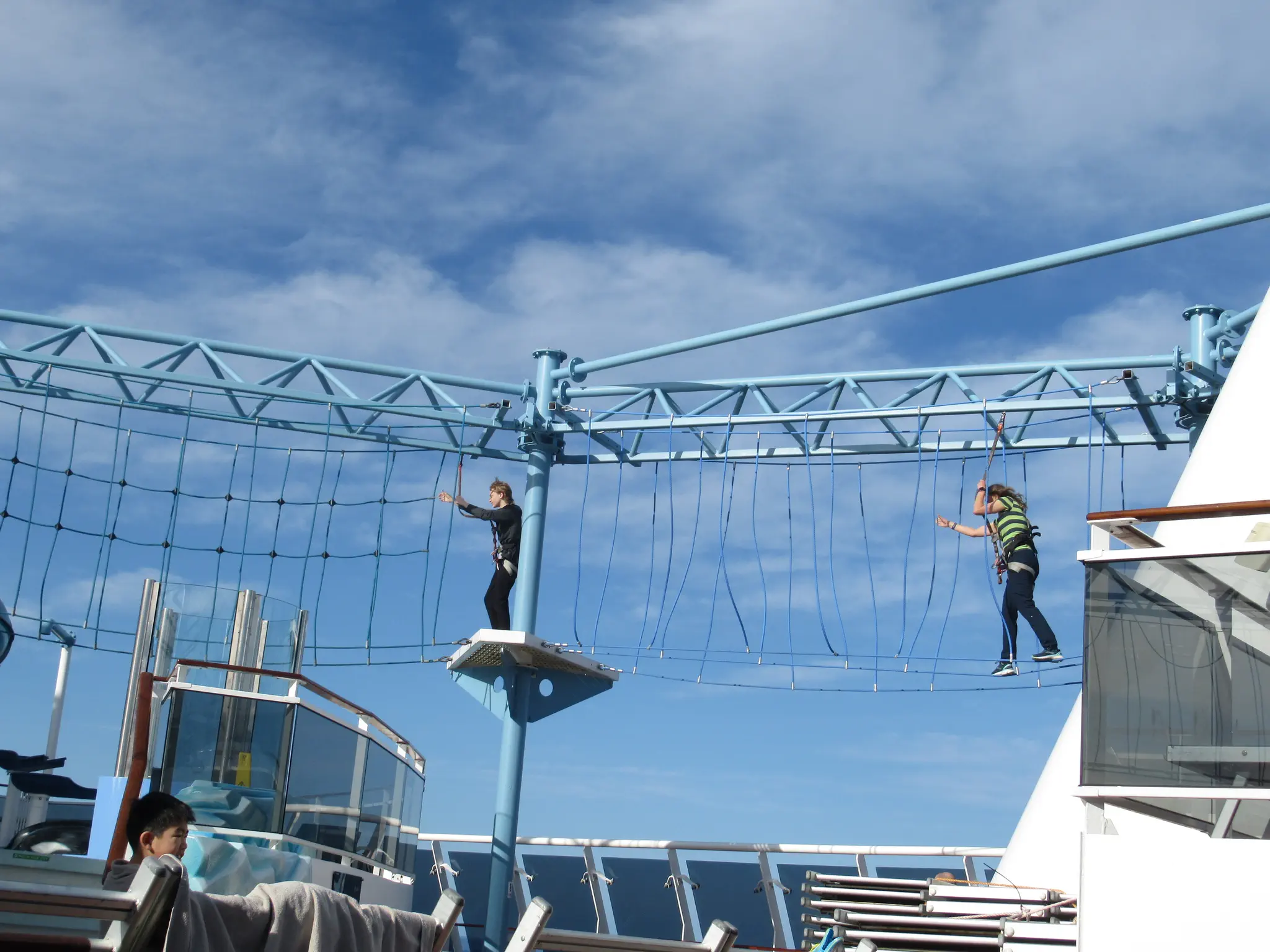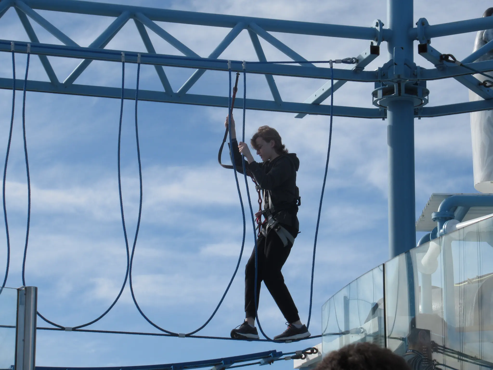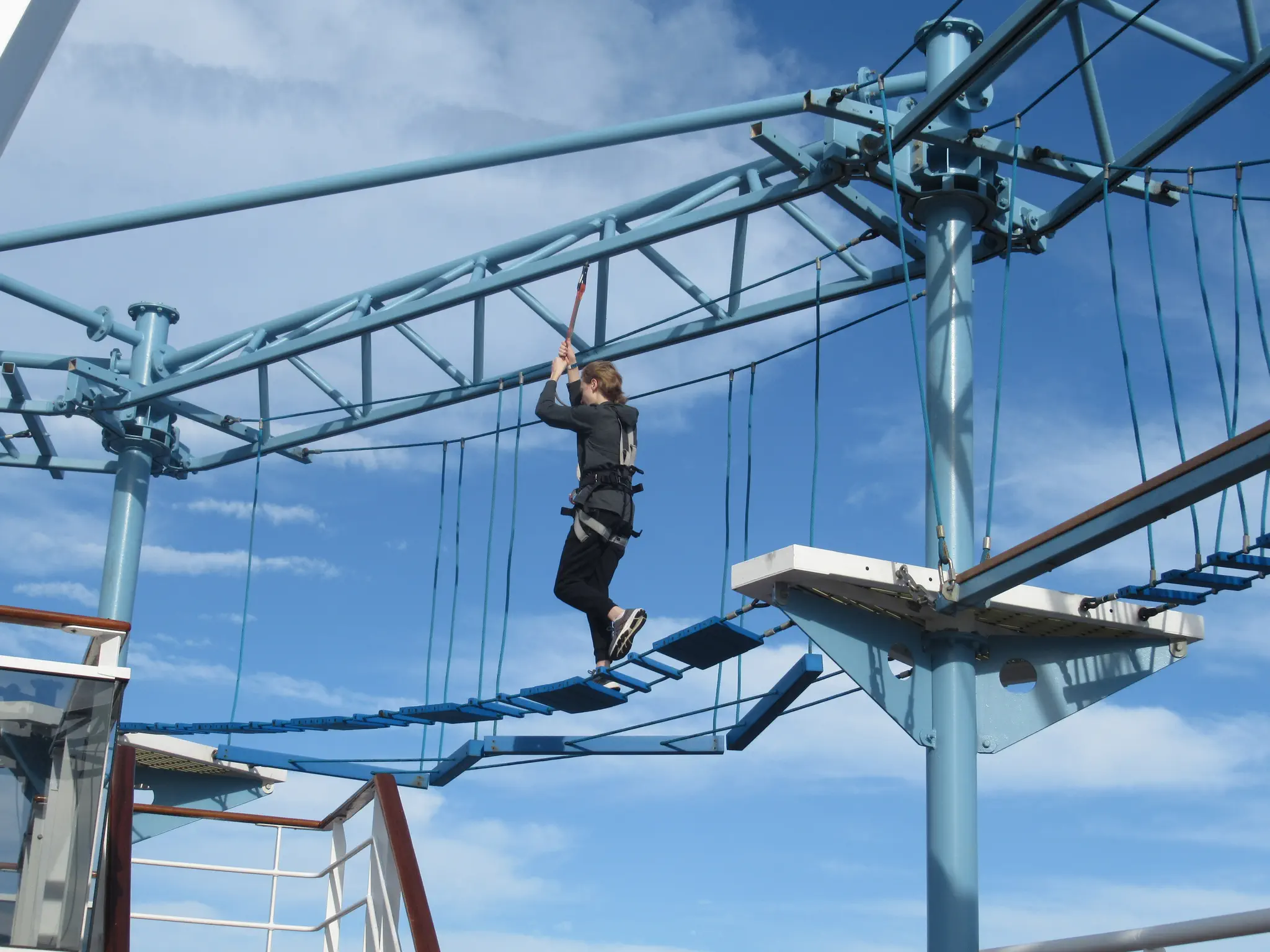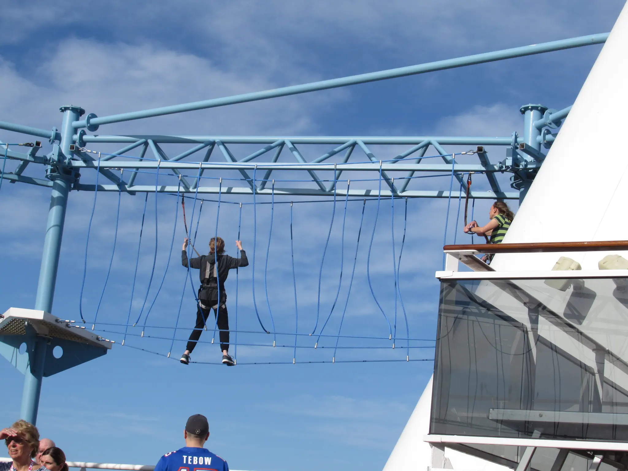 After breakfast, Travis, Owen, and I tried the rope course. We did not know about needing the waiver or where to go in, so got snapped at by the crew. They were nicer after we did it right. You have to go to the aqua park to sign the waiver and get a bracelet. Enter the long hall, past the water park heading forward, on the starboard side. He kindly gave me another, looser bracelet after I did not like the first so tight. I generally don't like rope courses that much, so only went around once. Travis and Owen went around multiple times; Travis trying with no hands -- no thank you :)!