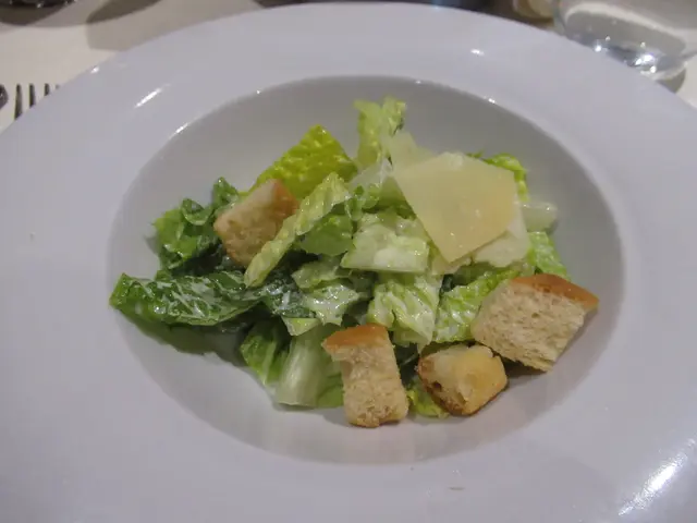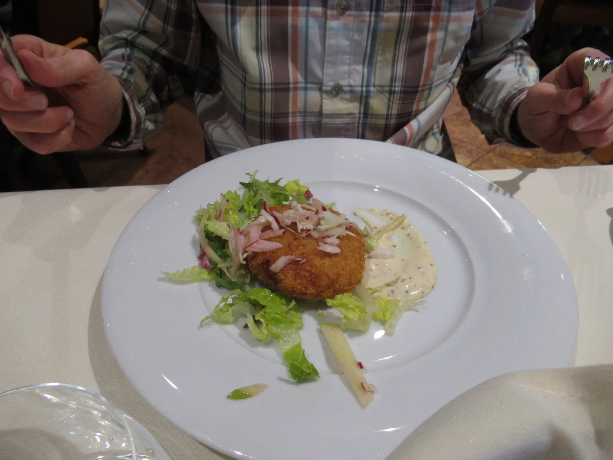 Travis's crab cake, my Caesar salad, and Joel's cheddar broccoli soup: